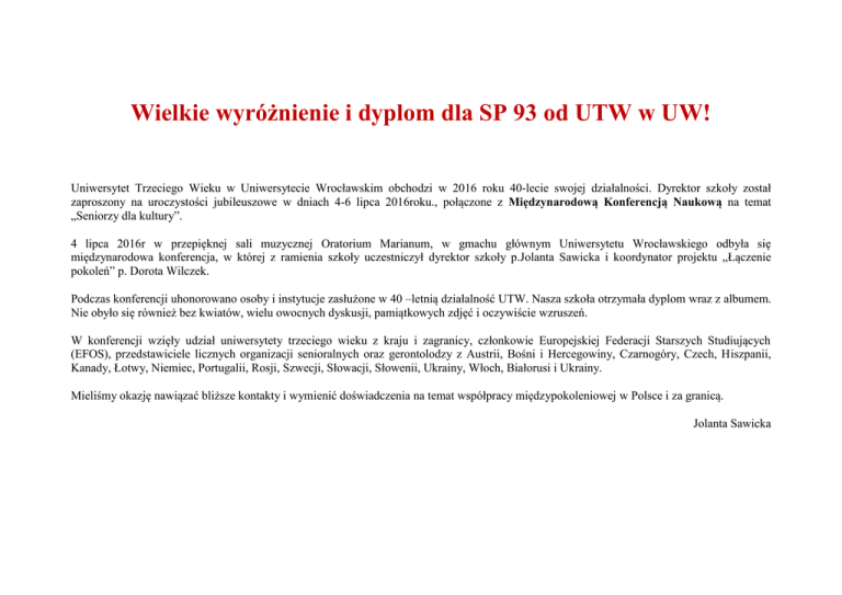 Wielkie wyróżnienie i dyplom dla SP 93 od UTW w UW! Uniwersytet Trzeciego Wieku w Uniwersytecie Wrocławskim obchodzi w 2016 roku 40-lecie swojej działalności. Dyrektor szkoły został zaproszony na uroczystości jubileuszowe w dniach 4-6 lipca 2016roku., połączone z Międzynarodową Konferencją Naukową na temat „Seniorzy dla kultury”. 4 lipca 2016r w przepięknej sali muzycznej Oratorium Marianum, w gmachu głównym Uniwersytetu Wrocławskiego odbyła się międzynarodowa konferencja, w której z ramienia szkoły uczestniczył dyrektor szkoły p.Jolanta Sawicka i koordynator projektu „Łączenie pokoleń” p. Dorota Wilczek. Podczas konferencji uhonorowano osoby i instytucje zasłużone w 40 –letnią działalność UTW. Nasza szkoła otrzymała dyplom wraz z albumem. Nie obyło się również bez kwiatów, wielu owocnych dyskusji, pamiątkowych zdjęć i oczywiście wzruszeń. W konferencji wzięły udział uniwersytety trzeciego wieku z kraju i zagranicy, członkowie Europejskiej Federacji Starszych Studiujących (EFOS), przedstawiciele licznych organizacji senioralnych oraz gerontolodzy z Austrii, Bośni i Hercegowiny, Czarnogóry, Czech, Hiszpanii, Kanady, Łotwy, Niemiec, Portugalii, Rosji, Szwecji, Słowacji, Słowenii, Ukrainy, Włoch, Białorusi i Ukrainy. Mieliśmy okazję nawiązać bliższe kontakty i wymienić doświadczenia na temat współpracy międzypokoleniowej w Polsce i za granicą. Jolanta Sawicka