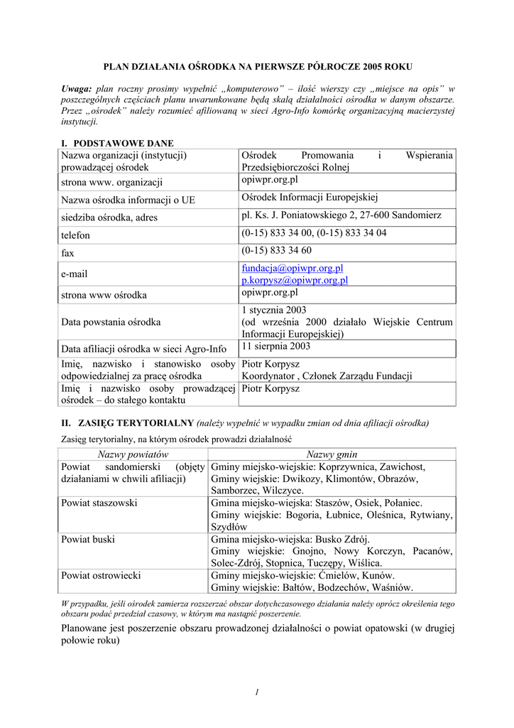 PLAN DZIAŁANIA OŚRODKA NA PIERWSZE PÓŁROCZE 2005 ROKU Uwaga: plan roczny prosimy wypełnić „komputerowo” – ilość wierszy czy „miejsce na opis” w poszczególnych częściach planu uwarunkowane będą skalą działalności ośrodka w danym obszarze. Przez „ośrodek” należy rozumieć afiliowaną w sieci Agro-Info komórkę organizacyjną macierzystej instytucji. I. PODSTAWOWE DANE Nazwa organizacji (instytucji) prowadzącej ośrodek strona www. organizacji Ośrodek Promowania Przedsiębiorczości Rolnej opiwpr.org.pl Nazwa ośrodka informacji o UE Ośrodek Informacji Europejskiej siedziba ośrodka, adres pl. Ks. J. Poniatowskiego 2, 27-600 Sandomierz telefon (0-15) 833 34 00, (0-15) 833 34 04 fax (0-15) 833 34 60 e-mail strona www ośrodka Data powstania ośrodka i Wspierania [email protected] [email protected] opiwpr.org.pl 1 stycznia 2003 (od września 2000 działało Wiejskie Centrum Informacji Europejskiej) 11 sierpnia 2003 Data afiliacji ośrodka w sieci Agro-Info Imię, nazwisko i stanowisko osoby Piotr Korpysz odpowiedzialnej za pracę ośrodka Koordynator , Członek Zarządu Fundacji Imię i nazwisko osoby prowadzącej Piotr Korpysz ośrodek – do stałego kontaktu II. ZASIĘG TERYTORIALNY (należy wypełnić w wypadku zmian od dnia afiliacji ośrodka) Zasięg terytorialny, na którym ośrodek prowadzi działalność Nazwy powiatów Nazwy gmin Powiat sandomierski (objęty Gminy miejsko-wiejskie: Koprzywnica, Zawichost, działaniami w chwili afiliacji) Gminy wiejskie: Dwikozy, Klimontów, Obrazów, Samborzec, Wilczyce. Powiat staszowski Gmina miejsko-wiejska: Staszów, Osiek, Połaniec. Gminy wiejskie: Bogoria, Łubnice, Oleśnica, Rytwiany, Szydłów Powiat buski Gmina miejsko-wiejska: Busko Zdrój. Gminy wiejskie: Gnojno, Nowy Korczyn, Pacanów, Solec-Zdrój, Stopnica, Tuczępy, Wiślica. Powiat ostrowiecki Gminy miejsko-wiejskie: Ćmielów, Kunów. Gminy wiejskie: Bałtów, Bodzechów, Waśniów. W przypadku, jeśli ośrodek zamierza rozszerzać obszar dotychczasowego działania należy oprócz określenia tego obszaru podać przedział czasowy, w którym ma nastąpić poszerzenie. Planowane jest poszerzenie obszaru prowadzonej działalności o powiat opatowski (w drugiej połowie roku) 1 III. DIAGNOZA POTRZEB INFORMACYJNYCH Jak i kiedy ośrodek planuje przeprowadzanie diagnozy potrzeb informacyjnych mieszkańców obszarów wiejskich na terenie działania ośrodka. Wskazanym byłoby uwzględnienie takich informacji jak: rodzaj i wielkość grupy respondentów, metody badawcze, kiedy będzie badanie przeprowadzane. Do naniesienia tych informacji może służyć poniższa tabela Metoda badawcza Badania prowadzone w oparciu o arkusze ewaluacyjne prowadzonych szkoleń Analiza dokumentów (notatek ze spotkań z klientami Ośrodka ) Przedział Problem czasowy badawczy lub cel przeprowadzenia badania badania Uczestnicy prowadzonych Pierwszy i drugi Oczekiwany szkoleń (rolnicy, sołtysi, kwartał przez Delegaci do Rad mieszkańców wsi Powiatowych zakres, tematyka i Świętokrzyskiej Izby rodzaj potrzeb Rolniczej i inni szkoleniowych mieszkańcy wsi) z terenu doradczych, 4 powiatów powiatów – informacjinych ok. 500 osób Rolnicy Na bieżąco Oczekiwany Młodzież wiejska przez Przedsiębiorcy wiejscy mieszkańców wsi Bezrobotni zakres, tematyka i rodzaj potrzeb szkoleniowych doradczych, informacjinych Grupa respondentów objętych badaniem (rodzaj i wielkość) IV. UŚWIADAMIANIE POTRZEB INFORMACYJNYCH Czy i w jaki sposób ośrodek będzie uświadamiał potrzeby informacyjne mieszkańcom na obszarze swojego działania. 1. Podczas spotkań informacyjnych i rozmów z potencjalnymi klientami zarówno w siedzibie ośrodka oraz w terenie. 2. Prezentacja oferty ośrodka w celu wzbudzenia zainteresowania. 3. Powoływanie się na wyniki przeprowadzonych dotychczas badań wśród mieszkańców wsi czterech powiatów dotyczących zarówno potrzeb informacyjnych jak i stanu wiedzy mieszkańców z zakresu problematyki związanej z integracją. 4. Przekazanie istotnych informacji wynikających z członkostwa (możliwości), w celu wzbudzenia zainteresowania. 5. Prezentowanie pozytywnych przykładów (przedsięwzięć, inicjatyw) zrealizowanych dzięki pozyskaniu aktualnych i rzetelnych informacji. V. INSPIROWANIE/AKTYWIZOWANIE MIESZKAŃCÓW WSI Czy i w jaki sposób ośrodek zamierza inspirować/animować/organizować społeczności wiejskie do podejmowania działań przystosowujących do efektywnego funkcjonowaniu w UE 1. 2. Upowszechnianie wśród mieszkańców wsi informacji o możliwościach pozyskiwania środków finansowych na rozwój obszarów wiejskich z Funduszy Strukturalnych i innych funduszy UE. Współpraca z lokalnymi partnerami (samorządy, szkoły, organizacje rolnicze, Izba Rolnicza) w zakresie informacji europejskiej. 2 3. 4. Prowadzenie działań pobudzających rolników i lokalne społeczności do samoorganizowania się i współpracy /partnerstwa/ na rzecz ułatwienia korzystania z możliwości, jakie daje członkostwo w UE, a zwłaszcza Fundusze Strukturalne skierowane na rozwój obszarów wiejskich. Podkreślanie i wskazanie możliwości, szans i okazji, jakie daje członkostwo w UE, zarówno na przykładzie programu SAPARD, jak i funduszy strukturalnych, z których to źródeł pozyskało pomoc wielu mieszkańców wsi (rolników, przedsiębiorców) i samorządów. Wykorzystywanie lokalnych przykładów podczas spotkań. VI. WSPÓŁPRACA Z ORGANIZACJAMI/INSTYTUCJAMI OFERUJĄCYMI INFORMACJE I PODEJMUJĄCYMI INNE DZIAŁANIA NA RZECZ PRZYSTOSOWANIA MIESZKAŃCÓW WSI DO FUNKCJONOWANIA W RAMACH UE Opis współpracy ośrodka z tego typu organizacjami/instytucjami (m.in. z samorządami terytorialnymi, gospodarczymi, organizacjami pozarządowymi, wyspecjalizowanymi agencjami), szczególnie funkcjonującymi na obszarze działania ośrodka. Czy i jakie działania podejmuje się w kierunku poszerzenia tej współpracy Na obszarze swego działania zamierzamy w da