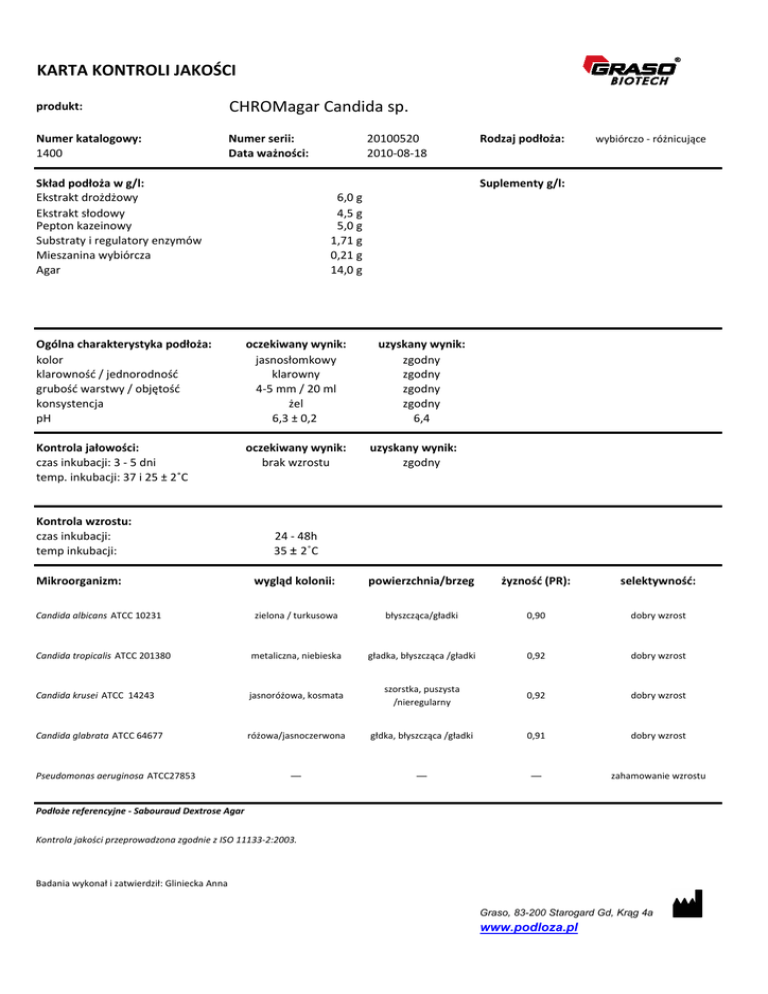KARTA KONTROLI JAKOŚCI produkt: CHROMagar Candida sp. Numer katalogowy: 1400 Numer serii: Data ważności: Skład podłoża w g/l: Ekstrakt drożdżowy Ekstrakt słodowy Pepton kazeinowy Substraty i regulatory enzymów Mieszanina wybiórcza Agar 20100520 2010-08-18 wybiórczo - różnicujące Suplementy g/l: 6,0 g 4,5 g 5,0 g 1,71 g 0,21 g 14,0 g Ogólna charakterystyka podłoża: kolor klarowność / jednorodność grubość warstwy / objętość konsystencja pH oczekiwany wynik: jasnosłomkowy klarowny 4-5 mm / 20 ml żel 6,3 ± 0,2 Kontrola jałowości: czas inkubacji: 3 - 5 dni temp. inkubacji: 37 i 25 ± 2˚C oczekiwany wynik: brak wzrostu Kontrola wzrostu: czas inkubacji: temp inkubacji: Rodzaj podłoża: uzyskany wynik: zgodny zgodny zgodny zgodny 6,4 uzyskany wynik: zgodny 24 - 48h 35 ± 2˚C Mikroorganizm: wygląd kolonii: powierzchnia/brzeg żyzność (PR): selektywność: Candida albicans ATCC 10231 zielona / turkusowa błyszcząca/gładki 0,90 dobry wzrost Candida tropicalis ATCC 201380 metaliczna, niebieska gładka, błyszcząca /gładki 0,92 dobry wzrost Candida krusei ATCC 14243 jasnoróżowa, kosmata szorstka, puszysta /nieregularny 0,92 dobry wzrost Candida glabrata ATCC 64677 różowa/jasnoczerwona głdka, błyszcząca /gładki 0,91 dobry wzrost — — — zahamowanie wzrostu Pseudomonas aeruginosa ATCC27853 Podłoże referencyjne - Sabouraud Dextrose Agar Kontrola jakości przeprowadzona zgodnie z ISO 11133-2:2003. Badania wykonał i zatwierdził: Gliniecka Anna Graso, 83-200 Starogard Gd, Krąg 4a www.podloza.pl