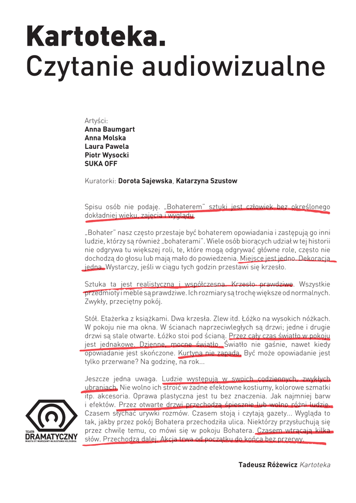 Kartoteka. Czytanie audiowizualne Artyści: Anna Baumgart Anna Molska Laura Pawela Piotr Wysocki SUKA OFF Kuratorki: Dorota Sajewska, Katarzyna Szustow Spisu osób nie podaję. „Bohaterem” sztuki jest człowiek bez określonego dokładniej wieku, zajęcia i wyglądu. „Bohater” nasz często przestaje być bohaterem opowiadania i zastępują go inni ludzie, którzy są również „bohaterami”. Wiele osób biorących udział w tej historii nie odgrywa tu większej roli, te, które mogą odgrywać główne role, często nie dochodzą do głosu lub mają mało do powiedzenia. Miejsce jest jedno. Dekoracja jedna. Wystarczy, jeśli w ciągu tych godzin przestawi się krzesło. Sztuka ta jest realistyczna i współczesna. Krzesło prawdziwe. Wszystkie przedmioty i meble są prawdziwe. Ich rozmiary są trochę większe od normalnych. Zwykły, przeciętny pokój. Stół. Etażerka z książkami. Dwa krzesła. Zlew itd. Łóżko na wysokich nóżkach. W pokoju nie ma okna. W ścianach naprzeciwległych są drzwi; jedne i drugie drzwi są stale otwarte. Łóżko stoi pod ścianą. Przez cały czas światło w pokoju jest jednakowe. Dzienne, mocne światło. Światło nie gaśnie, nawet kiedy opowiadanie jest skończone. Kurtyna nie zapada. Być może opowiadanie jest tylko przerwane? Na godzinę, na rok... Jeszcze jedna uwaga. Ludzie występują w swoich codziennych, zwykłych ubraniach. Nie wolno ich stroić w żadne efektowne kostiumy, kolorowe szmatki itp. akcesoria. Oprawa plastyczna jest tu bez znaczenia. Jak najmniej barw i efektów. Przez otwarte drzwi przechodzą śpiesznie lub wolno różni ludzie. Czasem słychać urywki rozmów. Czasem stoją i czytają gazety... Wygląda to tak, jakby przez pokój Bohatera przechodziła ulica. Niektórzy przysłuchują się przez chwilę temu, co mówi się w pokoju Bohatera. Czasem wtrącają kilka słów. Przechodzą dalej. Akcja trwa od początku do końca bez przerwy. Tadeusz Różewicz Kartoteka Sala im. Haliny Mikołajskiej. Krótka historia W dniach 26-28 marca 2010 roku zapraszamy widzów Teatru Dramatycznego do Sali im. Haliny Mikołajskiej, czyli do dawnej, nienależącej już do teatru Sali Prób, gdzie 50 lat temu odbyła się prapremiera dramatu Tadeusza Różewicza w reżyserii Wandy Laskowskiej. Otwarcie Sali Prób nastąpiło 25 sierpnia 1957 roku polską prapremierą sztuki Eugene`a Ionesco Krzesła w reżyserii Lu` dwika René. Przez ponad trzydzieści lat w tej przestrzeni wystawiono kilkadziesiąt przedstawień. To tutaj grano sztuki Zbigniewa Herberta: Rekonstrukcja Poety, Drugi Pokój i Jaskinia Filozofów (1961), Sławomira Mrożka: Indyk (1961), Śmierć porucznika (1963), Zabawa (1983), a także inne dramaty Tadeusza Różewicza: Grupa Laokoona (1962), Spaghetti i miecz (1967). W Sali Prób reżyserował m.in.: Konrad Swinarski (Ptaki Andrzeja Jareckiego wg Arystofanesa z piosenkami Agnieszki Osieckiej, 1960), Aleksander Bardini (Śmierć porucznika Sławomira Mrożka, 1963) i Gustaw Holoubek (Nora Henryka Ibsena,1973 i Karykatury Jana Augusta Kisielewskiego,1976). Nadanie Sali Prób imienia wielkiej aktorki Teatru Dramatycznego, Haliny Mikołajskiej, miało miejsce 19 stycznia 1991 roku. Z tej okazji ponownie wystawiono ` Krzesła Eugene`a Ionesco. Kilka lat póêniej teatr utracił tę przestrzeń. Dzisiaj Sala im. Haliny Mikołajskiej słu˝y głównie jako sala konferencyjna PKiN. Kartoteka. Czytanie audiowizualne powstało w ramach projektu PAMIĘĆ. PLAC DEFILAD #2: 50 lat Kartoteki.