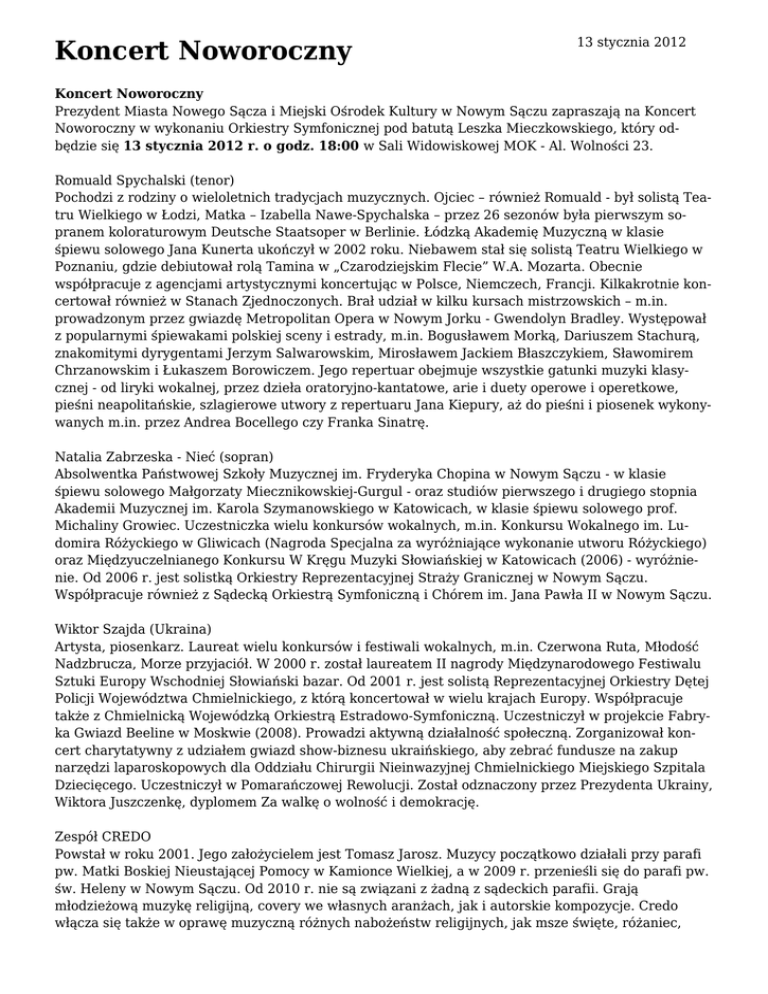 Koncert Noworoczny 13 stycznia 2012 Koncert Noworoczny Prezydent Miasta Nowego Sącza i Miejski Ośrodek Kultury w Nowym Sączu zapraszają na Koncert Noworoczny w wykonaniu Orkiestry Symfonicznej pod batutą Leszka Mieczkowskiego, który odbędzie się 13 stycznia 2012 r. o godz. 18:00 w Sali Widowiskowej MOK - Al. Wolności 23. Romuald Spychalski (tenor) Pochodzi z rodziny o wieloletnich tradycjach muzycznych. Ojciec – również Romuald - był solistą Teatru Wielkiego w Łodzi, Matka – Izabella Nawe-Spychalska – przez 26 sezonów była pierwszym sopranem koloraturowym Deutsche Staatsoper w Berlinie. Łódzką Akademię Muzyczną w klasie śpiewu solowego Jana Kunerta ukończył w 2002 roku. Niebawem stał się solistą Teatru Wielkiego w Poznaniu, gdzie debiutował rolą Tamina w „Czarodziejskim Flecie” W.A. Mozarta. Obecnie współpracuje z agencjami artystycznymi koncertując w Polsce, Niemczech, Francji. Kilkakrotnie koncertował również w Stanach Zjednoczonych. Brał udział w kilku kursach mistrzowskich – m.in. prowadzonym przez gwiazdę Metropolitan Opera w Nowym Jorku - Gwendolyn Bradley. Występował z popularnymi śpiewakami polskiej sceny i estrady, m.in. Bogusławem Morką, Dariuszem Stachurą, znakomitymi dyrygentami Jerzym Salwarowskim, Mirosławem Jackiem Błaszczykiem, Sławomirem Chrzanowskim i Łukaszem Borowiczem. Jego repertuar obejmuje wszystkie gatunki muzyki klasycznej - od liryki wokalnej, przez dzieła oratoryjno-kantatowe, arie i duety operowe i operetkowe, pieśni neapolitańskie, szlagierowe utwory z repertuaru Jana Kiepury, aż do pieśni i piosenek wykonywanych m.in. przez Andrea Bocellego czy Franka Sinatrę. Natalia Zabrzeska - Nieć (sopran) Absolwentka Państwowej Szkoły Muzycznej im. Fryderyka Chopina w Nowym Sączu - w klasie śpiewu solowego Małgorzaty Miecznikowskiej-Gurgul - oraz studiów pierwszego i drugiego stopnia Akademii Muzycznej im. Karola Szymanowskiego w Katowicach, w klasie śpiewu solowego prof. Michaliny Growiec. Uczestniczka wielu konkursów wokalnych, m.in. Konkursu Wokalnego im. Ludomira Różyckiego w Gliwicach (Nagroda Specjalna za wyróżniające wykonanie utworu Różyckiego) oraz Międzyuczelnianego Konkursu W Kręgu Muzyki Słowiańskiej w Katowicach (2006) - wyróżnienie. Od 2006 r. jest solistką Orkiestry Reprezentacyjnej Straży Granicznej w Nowym Sączu. Współpracuje również z Sądecką Orkiestrą Symfoniczną i Chórem im. Jana Pawła II w Nowym Sączu. Wiktor Szajda (Ukraina) Artysta, piosenkarz. Laureat wielu konkursów i festiwali wokalnych, m.in. Czerwona Ruta, Młodość Nadzbrucza, Morze przyjaciół. W 2000 r. został laureatem II nagrody Międzynarodowego Festiwalu Sztuki Europy Wschodniej Słowiański bazar. Od 2001 r. jest solistą Reprezentacyjnej Orkiestry Dętej Policji Województwa Chmielnickiego, z którą koncertował w wielu krajach Europy. Współpracuje także z Chmielnicką Wojewódzką Orkiestrą Estradowo-Symfoniczną. Uczestniczył w projekcie Fabryka Gwiazd Beeline w Moskwie (2008). Prowadzi aktywną działalność społeczną. Zorganizował koncert charytatywny z udziałem gwiazd show-biznesu ukraińskiego, aby zebrać fundusze na zakup narzędzi laparoskopowych dla Oddziału Chirurgii Nieinwazyjnej Chmielnickiego Miejskiego Szpitala Dziecięcego. Uczestniczył w Pomarańczowej Rewolucji. Został odznaczony przez Prezydenta Ukrainy, Wiktora Juszczenkę, dyplomem Za walkę o wolność i demokrację. Zespół CREDO Powstał w roku 2001. Jego założycielem jest Tomasz Jarosz. Muzycy początkowo działali przy parafi pw. Matki Boskiej Nieustającej Pomocy w Kamionce Wielkiej, a w 2009 r. przenieśli się do parafi pw. św. Heleny w Nowym Sączu. Od 2010 r. nie są związani z żadną z sądeckich parafii. Grają młodzieżową muzykę religijną, covery we własnych aranżach, jak i autorskie kompozycje. Credo włącza się także w oprawę muzyczną różnych nabożeństw religijnych, jak msze święte, różaniec, Droga Krzyżowa czy Apel Jasnogórski; występuje także podczas koncertów ewangelizacyjnych. W skład zespołu wchodzą: Aleksandra Maślanka - wokal (Absolwentka Państwowej Szkoły Muzycznej w Nowym Sączu w klasie fortepianu; obecnie naukę kontynuuje w Szkole Jazzu i Muzyki Rozrywkowej w Krakowie na wydziale wokalnym. Współpracuje z kilkoma sądeckimi i krakowskimi zespołami oraz ośrodkami, a także Sądecką Orkiestrą Symfoniczną. Jest laureatką wielu konkursów i festiwali wokalnych.) Adrian Marczyk - gitara elektryczna, akustyczna, klasyczna (Zdobywca wyróżnień w Małopolskich przeglądach gitarzystów. Założyciel zespołu Wariant Zero. Poza muzyką spędza wolny czas m.in. na graniu w koszykówkę oraz jeżdżąc freeridowo na rowerze.) Damian Borkowski - instrumenty klawiszowe (Gry na fortepianie uczył się w szkole muzycznej, a swoją pasję realizuje także w zespole Wariant Zero. Jest absolwentem krakowskiej Akademii Wychowania Fizycznego. Oprócz fortepianu i muzyki ma jeszcze wiele innych pasji m. in. podróże najdalsze zakątki świata, jazdę na rowerze, narciarstwo, wspinaczka.) Dariusz Kapułka - gitara basowa (Student krakowskiej Akademii Wychowania Fizycznego. Muzycznie udziela się w kilku projektach, grając na gitarze basowej. Na swoim koncie ma liczne nagrody i wyróżnienia muzyczne, głównie w kategorii gitara basowa. W wolnych chwilach zajmuje się wspinaczką oraz wyprawami rowerowymi.) Tomasz Jarosz - wokal, saksofon, instrumenty ludowe (Absolwent Wydziału Sztuki (muzyka) na Uniwersytecie Śląskim w Katowicach (filia w Cieszynie). Udziela się w wielu projektach muzycznych na Sądecczyźnie m. in. w Sądeckiej Orkiestrze Symfonicznej. Na codzień pracuje w Orkiestrze Reprezentacyjnej Straży Granicznej jako muzyk-solista.) Wojtek Szczygieł - saksofon sopranowy, altowy, tenorowy (Absolwent wydziału artystyczno-pedagogicznego Uniwersytetu Rzeszowskiego, ukończył także I i II stopień Szkoły Muzycznej na wydziale in