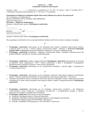 Umowa Nr …../2016 o udzielenie świadczeń zdrowotnych zawarta w dniu …………. r. w Rzeszowie na podstawie art. 26, 26a i 27 ustawy z dnia 15 kwietnia 2011 r. o działalności leczniczej (tekst jednolity Dz. U. 2013 poz. 217) pomiędzy: Samodzielnym Publicznym Zakładem Opieki Zdrowotnej Ministerstwa Spraw Wewnętrznych 35-111 Rzeszów, ul. Krakowska 16 REGON 690028840, NIP 8132892063, KRS 0000020148 reprezentowanym przez: Dyrektora – Zbigniewa Widomskiego zwanym w dalszej części umowy Udzielającym zamówienia a ………………. ….-………………, ul. ………. REGON ……………., NIP ……………. reprezentowany przez: …………… – ……………… zwanym w dalszej części umowy Przyjmującym zamówienie Mocą zgodnego oświadczenia woli, po przeprowadzeniu konkursu ofert strony umowy ustalają co następuje: §1 1. Przyjmujący zamówienie zobowiązuje się do udzielania przez lekarzy świadczeń zdrowotnych osobom, o których mowa w §2 ust. 1 umowy poprzez wykonywanie badań i zabiegów w Pracowni Endoskopii Szpitala MSW w Rzeszowie dla potrzeb oddziałów szpitalnych i lecznictwa ambulatoryjnego. 2. Przyjmujący zamówienie koordynuje i nadzoruje wykonywanie badań i zabiegów endospowowych dla potrzeb oddziałów szpitalnych i lecznictwa ambulatoryjnego. §2 1. Przyjmujący zamówienie świadczy usługi pacjentom Udzielającego zamówienia uprawnionym do leczenia na podstawie umów podpisanych z NFZ i innymi podmiotami, a takŜe w przypadkach wymagających udzielania pomocy doraźnej (zwanymi w treści umowy pacjentami). 2. Przyjmujący zamówienie zobowiązuje się do wykonywania świadczeń w sposób ciągły i systematyczny w czasie trwania umowy. §3 1. Przyjmujący zamówienie zobowiązuje się do udzielania świadczeń zdrowotnych będących przedmiotem umowy w dniach i godzinach określonych w harmonogramie stanowiącym załącznik nr 1 do umowy. 2. Udzielane na podstawie umowy świadczenia zdrowotne muszą być niezbędne, celowe i adekwatne do potrzeb wynikających ze stanu zdrowia pacjentów pod rygorem odmowy zapłaty wynagrodzenia przez Udzielającego zamówienia. §4 1. Przyjmujący zamówienie zobowiązuje się do rzetelnego wykonywania świadczeń z jak najlepszym wykorzystaniem wiedzy medycznej i umiejętności zawodowych, z uwzględnieniem postępu w zakresie medycyny oraz zgodnie z zasadami etyki zawodowej. 2. Przyjmujący zamówienie zobowiązuje się do przestrzegania: a) przepisów określających prawa i obowiązki pacjentów, b) standardów udzielania świadczeń zdrowotnych zgodnie z obowiązującymi przepisami, c) Regulaminu Organizacyjnego SP ZOZ MSW w Rzeszowie, d) Procedur i standardów obowiązujących w SP ZOZ MSW w Rzeszowie. 1 §5 1. Przyjmujący zamówienie zobowiązuje się do prowadzenia dokumentacji medycznej zgodnie z aktualnie obowiązującymi przepisami, w tym dokumentacji medycznej elektronicznej obowiązującej u Udzielającego zamówienia. 2. Informacje dotyczące pacjenta a w szczególności jego choroby mogą być przekazane uprawnionym osobom trzecim tylko na zasadach wynikających z aktualnie obowiązujących przepisów. 3. Przyjmujący zamówienie ponosi całkowitą odpowiedzialność za prowadzone leczenie i prowadzoną dokumentację lekarską. §6 1. Przyjmujący zamówienie zobowiązany jest do przestrzegania przepisów ustawy z dnia 29 sierpnia 1997 r. o ochronie danych osobowych (Dz. U. 2014 poz. 1182) oraz stosowania zarządzeń i dokumentów obowiązujących u Udzielającego zamówienia związanych z przetwarzaniem danych osobowych. 2. UpowaŜnienie imienne do przetwarzania danych osobowych przez Przyjmującego zamówienie stanowi załącznik nr 2 do umowy. §7 Przyjmujący zamówienie zobowiązany jest do: a) zawarcia umowy ubezpieczenia od odpowiedzialności cywilnej za szkody wyrządzone w związku z udzielaniem lub zaniechaniem udzielania świadczeń zdrowotnych z minimalną sumą gwarancyjną określoną odpowiednimi przepisami, b) dostarczenia Udzielającemu zamówienia kopii polisy ubezpieczenia, o którym mowa w pkt a), c) utrzymywania przez cały okres obowiązywania umowy stałej sumy gwarancyjnej. §8 Przyjmującego zamówienie obowiązuje bezwzględny zakaz pobierania opłat oraz innych dóbr od pacjentów, członków ich rodzin lub osób trzecich działających w imieniu bądź na rzecz wcześniej wymienionych z tytułu udzielania świadczeń zdrowotnych objętych niniejszą umową, jak równieŜ udzielania świadczeń zdrowotnych w stanie wskazującym na spoŜycie alkoholu lub jego spoŜywanie w czasie wykonywania świadczeń. §9 Przyjmujący zamówienie dla celów realizacji niniejszej umowy we własnym zakresie na własny koszt zabezpieczy: a) odzieŜ ochronną, b) aktualne szkolenia z zakresu BHP, c) aktualne badania profilaktyczne zgodnie z obowiązującymi wymogami. §10 1. Przyjmujący zamówienie przyjmuje na siebie obowiązek poddania się kontroli Udzielającego zamówienia, Narodowego Funduszu Zdrowia oraz innych uprawnionych przepisami prawa podmiotów. 2. Przyjmujący zamówienie ponosi odpowiedzialność za szkody wyrządzone przy udzielaniu świadczeń zdrowotnych określonych w niniejszej umowie wg zasad określonych w art. 27 ust. 7 ustawy z dnia ustawy z dnia 15 kwietnia 2011 r. o działalności leczniczej. 3. W razie stwierdzenia przez Narodowy Fundusz Zdrowia nieprawidłowości przy udzielaniu świadczeń zdrowotnych wynikających z niniejszej umowy i obciąŜenia Udzielającego zamówienia skutkami finansowymi tych nieprawidłowości, Przyjmujący zamówienie zobowiązuje się pokryć szkody wynikłe w związku z udzielaniem świadczeń zdrowotnych na rzecz Udzielającego zamówienia. W szczególności dotyczy to następujących przypadków: a) nieudzielania świadczeń w czasie i miejscu ustalonym w harmonogramie stanowiącym załącznik do umowy, b) udaremniania kontroli albo niewykonania w wyznaczonym terminie zaleceń pokontrolnych, c) nieuzasadnionej 