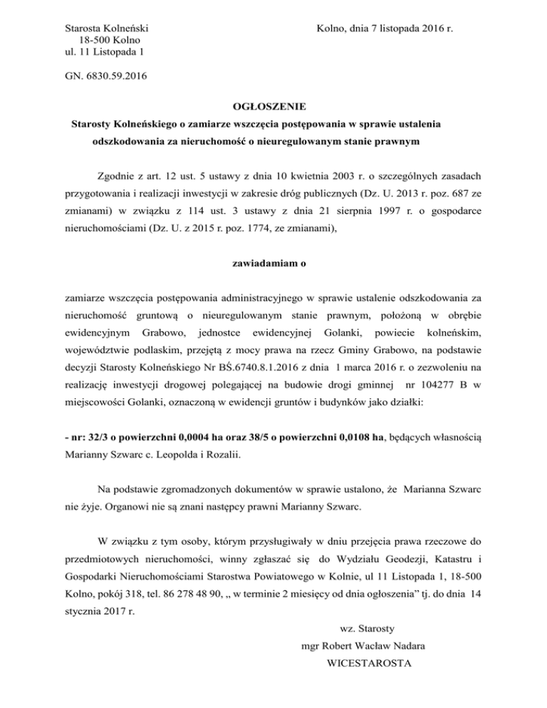 Starosta Kolneński 18-500 Kolno ul. 11 Listopada 1 Kolno, dnia 7 listopada 2016 r. GN. 6830.59.2016 OGŁOSZENIE Starosty Kolneńskiego o zamiarze wszczęcia postępowania w sprawie ustalenia odszkodowania za nieruchomość o nieuregulowanym stanie prawnym Zgodnie z art. 12 ust. 5 ustawy z dnia 10 kwietnia 2003 r. o szczególnych zasadach przygotowania i realizacji inwestycji w zakresie dróg publicznych (Dz. U. 2013 r. poz. 687 ze zmianami) w związku z 114 ust. 3 ustawy z dnia 21 sierpnia 1997 r. o gospodarce nieruchomościami (Dz. U. z 2015 r. poz. 1774, ze zmianami), zawiadamiam o zamiarze wszczęcia postępowania administracyjnego w sprawie ustalenie odszkodowania za nieruchomość gruntową o nieuregulowanym stanie prawnym, położoną w obrębie ewidencyjnym Grabowo, jednostce ewidencyjnej Golanki, powiecie kolneńskim, województwie podlaskim, przejętą z mocy prawa na rzecz Gminy Grabowo, na podstawie decyzji Starosty Kolneńskiego Nr BŚ.6740.8.1.2016 z dnia 1 marca 2016 r. o zezwoleniu na realizację inwestycji drogowej polegającej na budowie drogi gminnej nr 104277 B w miejscowości Golanki, oznaczoną w ewidencji gruntów i budynków jako działki: - nr: 32/3 o powierzchni 0,0004 ha oraz 38/5 o powierzchni 0,0108 ha, będących własnością Marianny Szwarc c. Leopolda i Rozalii. Na podstawie zgromadzonych dokumentów w sprawie ustalono, że Marianna Szwarc nie żyje. Organowi nie są znani następcy prawni Marianny Szwarc. W związku z tym osoby, którym przysługiwały w dniu przejęcia prawa rzeczowe do przedmiotowych nieruchomości, winny zgłaszać się do Wydziału Geodezji, Katastru i Gospodarki Nieruchomościami Starostwa Powiatowego w Kolnie, ul 11 Listopada 1, 18-500 Kolno, pokój 318, tel. 86 278 48 90, „ w terminie 2 miesięcy od dnia ogłoszenia” tj. do dnia 14 stycznia 2017 r. wz. Starosty mgr Robert Wacław Nadara WICESTAROSTA