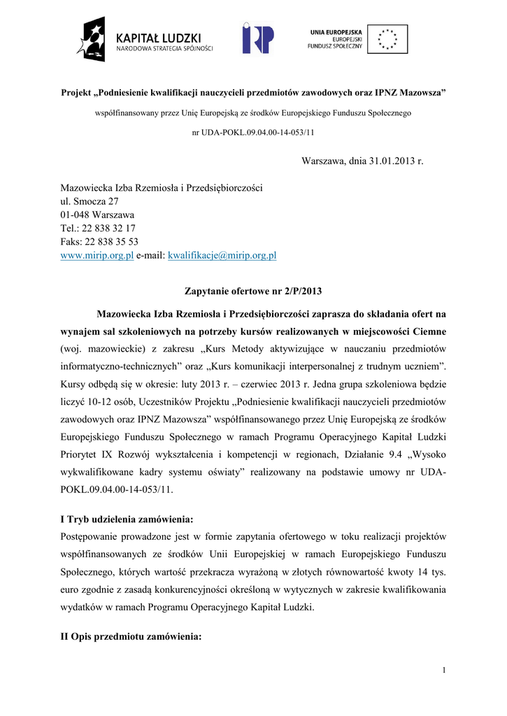 Projekt „Podniesienie kwalifikacji nauczycieli przedmiotów zawodowych oraz IPNZ Mazowsza” współfinansowany przez Unię Europejską ze środków Europejskiego Funduszu Społecznego nr UDA-POKL.09.04.00-14-053/11 Warszawa, dnia 31.01.2013 r. Mazowiecka Izba Rzemiosła i Przedsiębiorczości ul. Smocza 27 01-048 Warszawa Tel.: 22 838 32 17 Faks: 22 838 35 53 www.mirip.org.pl e-mail: [email protected] Zapytanie ofertowe nr 2/P/2013 Mazowiecka Izba Rzemiosła i Przedsiębiorczości zaprasza do składania ofert na wynajem sal szkoleniowych na potrzeby kursów realizowanych w miejscowości Ciemne (woj. mazowieckie) z zakresu „Kurs Metody aktywizujące w nauczaniu przedmiotów informatyczno-technicznych” oraz „Kurs komunikacji interpersonalnej z trudnym uczniem”. Kursy odbędą się w okresie: luty 2013 r. – czerwiec 2013 r. Jedna grupa szkoleniowa będzie liczyć 10-12 osób, Uczestników Projektu „Podniesienie kwalifikacji nauczycieli przedmiotów zawodowych oraz IPNZ Mazowsza” współfinansowanego przez Unię Europejską ze środków Europejskiego Funduszu Społecznego w ramach Programu Operacyjnego Kapitał Ludzki Priorytet IX Rozwój wykształcenia i kompetencji w regionach, Działanie 9.4 „Wysoko wykwalifikowane kadry systemu oświaty” realizowany na podstawie umowy nr UDAPOKL.09.04.00-14-053/11. I Tryb udzielenia zamówienia: Postępowanie prowadzone jest w formie zapytania ofertowego w toku realizacji projektów współfinansowanych ze środków Unii Europejskiej w ramach Europejskiego Funduszu Społecznego, których wartość przekracza wyrażoną w złotych równowartość kwoty 14 tys. euro zgodnie z zasadą konkurencyjności określoną w wytycznych w zakresie kwalifikowania wydatków w ramach Programu Operacyjnego Kapitał Ludzki. II Opis przedmiotu zamówienia: 1 Projekt „Podniesienie kwalifikacji nauczycieli przedmiotów zawodowych oraz IPNZ Mazowsza” współfinansowany przez Unię Europejską ze środków Europejskiego Funduszu Społecznego nr UDA-POKL.09.04.00-14-053/11 1. Przedmiotem zamówienia jest wynajem sal szkoleniowych do przeprowadzenia kursów w ramach Projektu „Podniesienie kwalifikacji nauczycieli przedmiotów zawodowych oraz IPNZ Mazowsza” . Rodzaje kursów: Kurs Metody aktywizujące w nauczaniu przedmiotów informatyczno-technicznych – 90h dydaktycznych x jedna grupa szkoleniowa, Kurs komunikacji interpersonalnej z trudnym uczniem – 50h dydaktycznych x jedna grupa szkoleniowa, Miejsce realizacji kursów – woj. mazowieckie, powiat wołomiński, Ciemne, 2. W/w kursy mogą być prowadzone w systemach mieszanych, uwzględniających: dzień szkoleniowy w systemie sobotnio-niedzielnym w wymiarze średnio 8-9 godzin (1h szkoleniowa = 45 min) lub w wymiarze krótszym, w godzinach popołudniowych po wcześniejszym ustaleniu ilości dni szkoleniowych z Wynajmującym, dzień szkoleniowy w dni powszednie w wymiarze 8-9 godzin (1h szkoleniowa = 45 min) lub w wymiarze krótszym, w godzinach popołudniowych po wcześniejszym ustaleniu ilości dni szkoleniowych z Wynajmującym, 3. Wymagania dotyczące sal, w których odbywać będą się zajęcia: 3.1 Sala szkoleniowa na Kurs komunikacji interpersonalnej z trudnym uczniem musi być wyposażona w: - stoły/ stoliki z możliwością ich przestawiania dla 10 - 12 uczestników szkolenia wraz z 10-12 miejscami siedzącymi, - oddzielny stół/stolik wraz z miejscem siedzącym dla wykładowcy, skierowany frontem do uczestników, - ekran do prezentacji multimedialnych; - tablicę ścieralną/flipchart wraz z wyposażeniem (gąbka, kolorowe pisaki); - dostęp do sieci energetycznej zapewniającej podłączenie laptopa i rzutnika multimedialnego; 2 Projekt „Podniesienie kwalifikacji nauczycieli przedmiotów zawodowych oraz IPNZ Mazowsza” współfinansowany przez Unię Europejską ze środków Europejskiego Funduszu Społecznego nr UDA-POKL.09.04.00-14-053/11 - stolik na sprzęt multimedialny; - przedłużacz, itp. - mocne oświetlenie; - dostęp do pomieszczeń sanitarnych wraz ze środkami higienicznymi (mydło, papier toaletowy, ręczniki papierowe); 3.2 Sala szkoleniowa na Kurs Metody aktywizujące w nauczaniu przedmiotów informatyczno-technicznych musi być wyposażona w: - stoły/ stoliki z możliwością ich przestawiania dla 10 - 12 uczestników szkolenia wraz z 10-12 miejscami siedzącymi, - oddzielny stół/stolik wraz z miejscem siedzącym dla wykładowcy, skierowany frontem do uczestników, - ekran do prezentacji multimedialnych; - tablicę ścieralną/flipchart wraz z wyposażeniem (gąbka, kolorowe pisaki); - dostęp do sieci energetycznej zapewniającej podłączenie laptopa i rzutnika multimedialnego; - stolik na sprzęt multimedialny; - przedłużacz, itp. - mocne oświetlenie; - dostęp do pomieszczeń sanitarnych wraz ze środkami higienicznymi (mydło, papier toaletowy, ręczniki papierowe); - dostęp do Internetu o przepustowości min. 512 MB, - rzutnik multimedialny oraz minimum 1 tablica interaktywna. Sale muszą spełniać wszystkie wymagania bezpieczeństwa i higieny pracy stawiane pomieszczeniom, w których będą prowadzone zajęcia. Oferent musi zapewnić oświetlenie naturalne i sztuczne, odpowiednią temperaturę w zależności od pory roku, wymianę powietrza, zabezpieczenie przed wilgocią, niekorzystnymi warunkami cieplnymi i nasłonecznieniem. 3 Projekt „Podniesienie kwalifikacji nauczycieli przedmiotów zawodowych oraz IPNZ Mazowsza” współfinansowany przez Unię Europejską ze środków Europejskiego Funduszu Społecznego nr UDA-POKL.09.04.00-14-053/11 Sale muszą być zlokalizowane na terenie powiatu wołomińskiego, w miejscowości Ciemne lub w odległości do 10 km od centrum miejscowości. Lokalizacja sal musi zapewniać bardzo dobry dojazd komunikacją PKS z terenów powiatu wołomińskiego i okolic. W bezpośredniej lokalizacji sal powinien znajdować się także parking samochodowy. Wynajmujący zobowiązany będzie również do: a) przystosowania sal