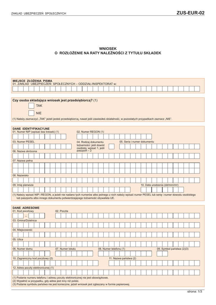 ZUS-EUR-02 ZAKŁAD UBEZPIECZEŃ SPOŁECZNYCH WNIOSEK O ROZŁOŻENIE NA RATY NALEŻNOŚCI Z TYTUŁU SKŁADEK MIEJSCE ZŁOŻENIA PISMA 01. ZAKŁAD UBEZPIECZEŃ SPOŁECZNYCH – ODDZIAŁ /INSPEKTORAT w: Czy osoba składająca wniosek jest przedsiębiorcą? (1) TAK NIE (1) Należy zaznaczyć „TAK” jeżeli jesteś przedsiębiorcą, nawet jeśli zawiesiłeś działalność, w pozostałych przypadkach zaznacz „NIE”. DANE IDENTYFIKACYJNE 01. Numer NIP (wpisać bez kresek) (1) 02. Numer REGON (1) 03. Numer PESEL 04. Rodzaj dokumentu tożsamości: jeśli dowód osobisty, wpisać 1, jeśli paszport – 2 06. Nazwa skrócona 05. Seria i numer dokumentu 07. Nazwa pełna 08. Nazwisko 09. Imię pierwsze 10. Data urodzenia (dd/mm/rrrr) (1) Należy wpisać NIP i REGON, a jeżeli nie nadano tych numerów albo jednego z nich należy wpisać numer PESEL lub serię i numer dowodu osobistego lub paszportu albo innego dokumentu potwierdzającego tożsamość obywatela UE. DANE ADRESOWE 01. Kod pocztowy 02. Poczta – 03. Gmina/Dzielnica 04. Miejscowość 05. Ulica 06. Numer domu 10. Zagraniczny kod pocztowy (2) 07. Numer lokalu 08. Numer telefonu (1) 09. Symbol państwa (2)(3) 11. Nazwa państwa (2) 12. Adres poczty elektronicznej (1) (1) Podanie numeru telefonu i adresu poczty elektronicznej nie jest obowiązkowe. (2) Wypełnić w przypadku, gdy adres jest inny niż polski. (3) Podanie symbolu państwa nie jest konieczne, jeżeli wniosek jest zgłaszany w formie papierowej. strona: 1/3 ZUS-EUR-02 ZAKŁAD UBEZPIECZEŃ SPOŁECZNYCH I. TREŚĆ WNIOSKU Zwracam się z wnioskiem o rozłożenie na raty należności z tytułu składek: (1) całości zadłużenia z tytułu składek (2) należności z tytułu składek na: (3) ubezpieczenie społeczne za okres do 31.12.1998 r. w kwocie zł w kwocie zł w kwocie zł w kwocie zł w kwocie zł w kwocie zł za okres Fundusz Ubezpieczeń Społecznych za okres ubezpieczenie zdrowotne za okres Fundusz Pracy za okres Fundusz Gwarantowanych Świadczeń Pracowniczych za okres Fundusz Emerytur Pomostowych za okres w ramach pomocy: (4) de minimis indywidualnej przeznaczonej na restrukturyzację indywidualnej przeznaczonej na naprawę szkód wyrządzonych przez klęski żywiołowe lub inne nadzwyczajne zdarzenia. (1) Należy zaznaczyć właściwy kwadrat wpisując „X”. (2) Nieopłaconych należności z tytułu składek, tj.: składek, odsetek za zwłokę, kosztów upomnienia oraz dodatkowej opłaty. (3) Należy wskazać właściwy/e fundusz/e. (4) Należy zaznaczyć właściwy kwadrat jeżeli jesteś przedsiębiorcą, nawet jeśli zawiesiłeś działalność, w pozostałych przypadkach pozostaw niezaznaczone. II. UZASADNIENIE Przyczyny braku możliwości jednorazowego uregulowania należności, możliwości płatnicze wnioskodawcy oraz proponowane formy zabezpieczenia należności: ............................................................................................................................... ............................................................................................................................... ............................................................................................................................... ............................................................................................................................... ............................................................................................................................... ............................................................................................................................... ............................................................................................................................... ............................................................................................................................... ............................................................................................................................... ............................................................................................................................... ............................................................................................................................... ............................................................................................................................... ............................................................................................................................... ............................................................................................................................... ............................................................................................................................... Przyczyny powstania zadłużenia: ............................................................................................................................... ............................................................................................................................... ............................................................................................................................... strona: 2/3 ZUS-EUR-02 ZAKŁAD UBEZPIECZEŃ SPOŁECZNYCH III. PROPONOWANE WARUNKI SPŁATY: Ilość rat Termin płatności rat (1) Kwota miesięcznej raty zł (1) Należy wskazać właściwy dzień miesiąca w okresie od 1 do 20 dnia miesiąca IV. FORMA OPODATKOWANIA (dotyczy zeznań podatkowych składanych w ciągu ostatnich trzech lat oraz w roku bieżącym) r. r. r. r. Pełna księgowość Pełna księgowość Pełna księgowość Pełna księgowość Zasady ogólne Zasady ogólne Zasady ogólne Zasady ogólne Podatek liniowy Podatek liniowy Podatek liniowy Podatek liniowy Karta podatkowa Karta podatkowa Karta podatkowa Karta podatkowa Ryczałt od przychodów Ryczałt od przychodów Ryczałt od przychodów Ryczałt od przychodów Nie dotyczy Nie dotyczy Nie dotyczy Nie dotyczy V. ZAŁĄCZNIKI Załą