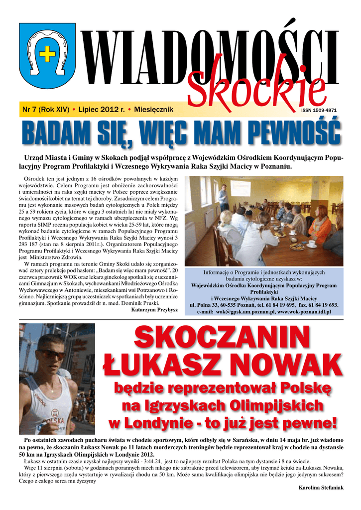 Nr 7 (Rok XIV) • Lipiec 2012 r. • Miesięcznik badam się, więc mam pewność Urząd Miasta i Gminy w Skokach podjął współpracę z Wojewódzkim Ośrodkiem Koordynującym Populacyjny Program Profilaktyki i Wczesnego Wykrywania Raka Szyjki Macicy w Poznaniu. Ośrodek ten jest jednym z 16 ośrodków powołanych w każdym województwie. Celem Programu jest obniżenie zachorowalności i umieralności na raka szyjki macicy w Polsce poprzez zwiększanie świadomości kobiet na temat tej choroby. Zasadniczym celem Programu jest wykonanie masowych badań cytologicznych u Polek między 25 a 59 rokiem życia, które w ciągu 3 ostatnich lat nie miały wykonanego wymazu cytologicznego w ramach ubezpieczenia w NFZ. Wg raportu SIMP roczna populacja kobiet w wieku 25-59 lat, które mogą wykonać badanie cytologiczne w ramach Populacyjnego Programu Profilaktyki i Wczesnego Wykrywania Raka Szyjki Macicy wynosi 3 293 187 (stan na 8 sierpnia 2011r.). Organizatorem Populacyjnego Programu Profilaktyki i Wczesnego Wykrywania Raka Szyjki Macicy jest Ministerstwo Zdrowia. W ramach programu na terenie Gminy Skoki udało się zorganizować cztery prelekcje pod hasłem: „Badam się więc mam pewność”. 20 czerwca pracownik WOK oraz lekarz ginekolog spotkali się z uczennicami Gimnazjum w Skokach, wychowankami Młodzieżowego Ośrodka Wychowawczego w Antoniewie, mieszkankami wsi Potrzanowo i Rościnno. Najliczniejszą grupą uczestniczek w spotkaniach były uczennice gimnazjum. Spotkanie prowadził dr n. med. Dominik Pruski. Katarzyna Przybysz Informację o Programie i jednostkach wykonujących badania cytologiczne uzyskasz w: Wojewódzkim Ośrodku Koordynującym Populacyjny Program Profilaktyki i Wczesnego Wykrywania Raka Szyjki Macicy ul. Polna 33, 60-535 Poznań, tel. 61 84 19 695, fax. 61 84 19 693. e-mail: [email protected], www.wok-poznan.idl.pl Skoczanin Łukasz nowak będzie reprezentował Polskę na Igrzyskach Olimpijskich w Londynie - to już jest pewne! Po ostatnich zawodach pucharu świata w chodzie sportowym, które odbyły się w Sarańsku, w dniu 14 maja br. już wiadomo na pewno, że skoczanin Łukasz Nowak po 11 latach morderczych treningów będzie reprezentował kraj w chodzie na dystansie 50 km na Igrzyskach Olimpijskich w Londynie 2012. Łukasz w ostatnim czasie uzyskał najlepszy wyniki - 3:44.24, jest to najlepszy rezultat Polaka na tym dystansie i 8 na świecie. Więc 11 sierpnia (sobota) w godzinach porannych niech nikogo nie zabraknie przed telewizorem, aby trzymać kciuki za Łukasza Nowaka, który z pierwszego rzędu wystartuje w rywalizacji chodu na 50 km. Może sama kwalifikacja olimpijska nie będzie jego jedynym sukcesem? Czego z całego serca mu życzymy Karolina Stefaniak 2 Starosta Wągrowiecki oraz Burmistrz Miasta i Gminy Skoki serdecznie zapraszają na DOŻYNKI 25 sierpnia (sobota) 2012r. Stadion w Skokach PROGRAM DOŻYNEK: 13:15 - Formowanie korowodu dożynkowego - plac targowy w Skokach 13:30 - Msza św. w intencji rolników - kościół pw. św. Mikołaja Biskupa w Skokach Po mszy przemarsz korowodu na stadion: prezentacja wieńców dożynkowych, uświęcone tradycją zwyczaje i obrzędy dożynkowe, wystąpienia zaproszonych gości ok. 16:00 - Tańce narodowe w wykonaniu Zespołu Pieśni i Tańca “ŁANY” ok. 16:45 - Konkurs na “Najdłuższy Warkocz” 17:00 - Dożynkowy Turniej Gmin Powiatu Wągrowieckiego o “ZŁOTY KŁOS” Pomiędzy konkurencjami prezentacje artystyczne gmin i ogłoszenie wyników plebiscytu na Sołtysa Roku 2012 (Głos Wągrowiecki) 19:30 - Koncert zespołu “TRUBADURZY” ok. 21:30 - Zabawa taneczna z zespołem “TAKT” ATRAKCJE TOWARZYSZĄCE: - wiejskie przysmaki - degustacja - prezentacje rękodzielnicze i kulinarne gmin - przejażdżki konne - animacje dla dzieci Organizator: Biblioteka Publiczna Miasta i Gmina w Skokach Serdecznie zapraszamy Europejski Fundusz Rolny na rzecz Rozwoju Obszarów Wiejskich Projekt współfinansowany ze środków Unii Europejskiej w ramach Osi 4 LEADER Programu Rozwoju Obszarów Wiejskich na lata 2007 - 2013 Europejski Fundusz Rolny na rzecz Rozwoju Obszarów Wiejskich: Europa inwestująca w obszary wiejskie KONCERT Irena Santor recital Czesław Majewski fortepian 7 października 2012 roku (niedziela) godz. 17 - hala widowiskowa w Skokach Bilety w cenie 25 zł do nabycia w Bibliotece Publicznej w Skokach tel. 61 892 5822, 798 824 520 Organizator: Biblioteka Publiczna Miasta i gminy w Skokach 3 Burmistrz Miasta i Gminy Skoki przypomina, że 15 maja 2012 roku upłynął termin płatności II raty podatków: rolnego, leśnego i od nieruchomości. Od sum nie zapłaconych w wyżej wymienionym terminie zgodnie z Obwieszczeniem Ministra Finansów są naliczane odsetki za zwłokę. Termin płatności III raty wyżej wymienionych podatków przypada 15 września 2012 r. DROGI TURYSTO I MIESZKAŃCU NASZ! Korzystasz z naszej pięknej przyrody. Szukasz wypoczynku, wytchnienia po nauce, po pracy i po zgiełku miejskiego życia. Przybywasz nad nasze wody by łowić ryby, udajesz się do naszych lasów w poszukiwaniu grzybów. Niestety, czasem pobyt Twój obrzydzają pozostawione w lasach i nad wodami lub po prostu przy drogach i ścieżkach różnego rodzaju odpadki. Zastanów się więc, czy nie są one wynikiem Twego wcześniejszego pobytu w tym miejscu. A może to wynik pobytu Twych dobrych przyjaciół, kolegów, lub sąsiadów. Dlatego pamiętaj, że łowiąc ryby, zbierając grzyby czy nawet spacerując po lesie i spożywając w tym czasie posiłki lub napoje, wytwarzasz różnego rodzaju odpadki, które zaśmiecają środowisko. Pamiętaj, by zabrać je ze sobą i wrzucić do miejsc do tego przeznaczonych. Inaczej, za dzień, za tydzień, za miesiąc, a może za rok, Ty sam, a może Twoi przyjaciele, koledzy lub sąsiedzi, irytować się będą zalegającymi nad wodą lub w lesie różnego rodzaju odpadkami. PROJEKT „LEPSZE JUTRO” Ośrodek Pomocy Społecznej w Skokach od miesiąca lipca 2012r. rozpoc