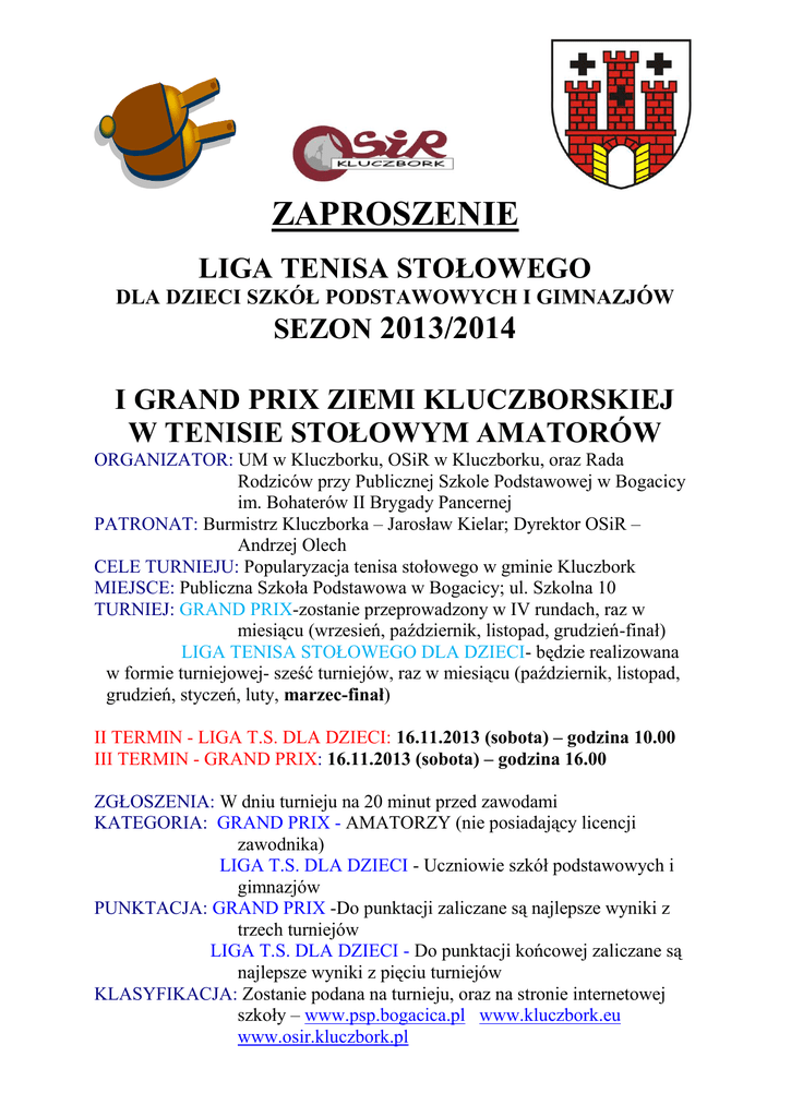 ZAPROSZENIE LIGA TENISA STOŁOWEGO DLA DZIECI SZKÓŁ PODSTAWOWYCH I GIMNAZJÓW SEZON 2013/2014 I GRAND PRIX ZIEMI KLUCZBORSKIEJ W TENISIE STOŁOWYM AMATORÓW ORGANIZATOR: UM w Kluczborku, OSiR w Kluczborku, oraz Rada Rodziców przy Publicznej Szkole Podstawowej w Bogacicy im. Bohaterów II Brygady Pancernej PATRONAT: Burmistrz Kluczborka – Jarosław Kielar; Dyrektor OSiR – Andrzej Olech CELE TURNIEJU: Popularyzacja tenisa stołowego w gminie Kluczbork MIEJSCE: Publiczna Szkoła Podstawowa w Bogacicy; ul. Szkolna 10 TURNIEJ: GRAND PRIX-zostanie przeprowadzony w IV rundach, raz w miesiącu (wrzesień, październik, listopad, grudzień-finał) LIGA TENISA STOŁOWEGO DLA DZIECI- będzie realizowana w formie turniejowej- sześć turniejów, raz w miesiącu (październik, listopad, grudzień, styczeń, luty, marzec-finał) II TERMIN - LIGA T.S. DLA DZIECI: 16.11.2013 (sobota) – godzina 10.00 III TERMIN - GRAND PRIX: 16.11.2013 (sobota) – godzina 16.00 ZGŁOSZENIA: W dniu turnieju na 20 minut przed zawodami KATEGORIA: GRAND PRIX - AMATORZY (nie posiadający licencji zawodnika) LIGA T.S. DLA DZIECI - Uczniowie szkół podstawowych i gimnazjów PUNKTACJA: GRAND PRIX -Do punktacji zaliczane są najlepsze wyniki z trzech turniejów LIGA T.S. DLA DZIECI - Do punktacji końcowej zaliczane są najlepsze wyniki z pięciu turniejów KLASYFIKACJA: Zostanie podana na turnieju, oraz na stronie internetowej szkoły – www.psp.bogacica.pl www.kluczbork.eu www.osir.kluczbork.pl WPISOWE: GRAND PRIX - 15,00zł. od osoby na każdym turnieju z przeznaczeniem na nagrody i sprzęt sportowy dla PSP w Bogacicy NAGRODY: Puchary, nagrody rzeczowe, medale, wszyscy uczestnicy okolicznościowe dyplomy PODSUMOWNIA KOŃCOWE: Organizator nie ponosi odpowiedzialności z tytułu następstw nieszczęśliwych wypadków. Obowiązek ubezpieczenia zgodnie z art. 52 o Kulturze Fizycznej z dnia 19.01.1996r. należy do uczestników. Osoby niepełnoletnie obowiązuje zgoda rodzica. Dowóz dzieci na zawody zapewniają rodzice. INFORMACJE: Kierownik turnieju Janusz Poprawa – tel. 694 643 301 Sekretariat PSP w Bogacicy – tel.: 77 414 86 17 SPONSORZY TURNIEJU: Zakład stolarski w Bogacicy-Benk Alfred. Stolarstwo, okna, drzwi. PIEKARNIA BOGACICA –SYLWESTER ROJOWSKI