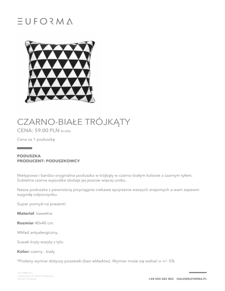 CZARNO-BIAŁE TRÓJKĄTY CENA: 59.00 PLN brutto Cena za 1 poduszkę PODUSZKA PRODUCENT: PODUSZKOWCY Nietypowa i bardzo oryginalna poduszka w trójkąty w czarno-białym kolorze z czarnym tyłem. Subtelna czarna wypustka dodaje jej jeszcze więcej uroku. Nasza poduszka z pewnością przyciągnie ciekawe spojrzenia waszych znajomych a wam zapewni wygodę odpoczynku. Super pomysł na prezent! Materiał: bawełna Rozmiar 40x40 cm. Wkład antyalergiczny. Suwak kryty wszyty z tyłu Kolor: czarny , biały *Podany wymiar dotyczy poszewki (bez wkładów). Wymiar może się wahać o +/- 5% Materiał: bawełna Rozmiar 40×40 cm. Wkład antyalergiczny. Suwak kryty wszyty z tyłu Kolor: czarny, biały Czas oczekiwania: ok.3-4 dni Powered by TCPDF (www.tcpdf.org)