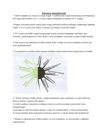 Surowce energetyczne 1. Gdzie znajduje się więcej czystego węgla: w jednej tonie węgla kamiennego zawierającego 85% tego pierwiastka, czy w 1,5 tony węgla brunatnego zawartości 65 % węgla? 2.Napisz równania trzech reakcji jakie mogą zachodzić podczas pełnego i półpełnego spalania węgla. Czy w czasie tych reakcji wydziela się energia na sposób ciepła? 3. W wyniku przeróbki węgla kamiennego można uzyskać następujące produkty: gaz świetlny, smołę pogazową i koks. Które z tych produktów stosowane są jako źródła energii? 4. Jak nazywa się największe źródło energii, które wydaje się niewyczerpalna, chociaż jest stale eksploatowane? 5. Na podstawie rysunku omów ujemne dodatnie skutki emitowania energii przez to źródło. 6. Wskaż, którego źródła energii: węgla kamiennego, gazu ziemnego czy ropy naftowej, dotyczy każdy z poniższych opisów: 1) wylew podczas transportu wodnego a nawet wyciek powoduje zniszczenie życia biologicznego; 2) pociąga za sobą dewastację gruntu i wiąże się z katastrofami, w których giną ludzie; 3) stwarza bardzo duże zagrożenie pożarowe zarówno w stanie lotnym jak skroplonym. 7. Biogaz to alternatywne źródło energii i to tym cenniejsze, że wytwarzane z odpadów organicznych. Wiedząc, że zawartość metanu CH4 w biogazie wynosi 70 % objętościowych, dwutlenku węgla CO2 około 30 % oblicz: ile m3 dwutlenku węgla znajduje się 25 m3 biogazu wytworzonego w ciągu doby na fermie. 8. Biogaz otrzymywany z osadu powstałego w oczyszczalni ścieków zera około 15 % toksycznej substancji A o charakterystycznym zapachu zepsutych jaj. Podczas spalania tworzy ona kolejną toksyczną substancję B i wzory substancji A i B. 9. Ile palnych składników zawiera gaz świetlny składający się z wodoru, tlenku węgla, węglowodorów, azotu i dwutlenku węgla? 10. Napisz równanie reakcji całkowitego spalania tego węglowodoru, którego nie ma w gazie ziemnym „suchym”, ale którego pary znajdują się w gazie „mokrym”. 11. W 5 dm3 pewnego gazu ziemnego zawarte jest 4500 cm3 metanu, 250 cm3 etanu, 180 cm3 dwutlenku węgla i 70 cm3 helu. Podaj skład procentowy tego gazu ziemnego. 12. W pomieszczeniu opalanym gazem ziemnym stwierdzono obecność tlenku węgla(II) CO. Co mogło być przyczyną tego, że gaz spalał się niecałkowicie? Napisz równanie reakcji spalania głównego składnika gazu ziemnego, gdy produktem jest ten tlenek zwany czadem. 13. Niektóre gatunki gazu ziemnego są „zasiarczone”, ponieważ zawierają siarkowodór lub dwutlenek siarki. Czy przepuszczenie takiego gazu przez płuczkę z wodą wapienną usunęłoby z niego związki siarki? Odpowiedź uzasadnij za pomocą odpowiednich równań reakcji. 14. Podaj równania reakcji, jakie zachodzą podczas pełnego spalania paliwa z butli turystycznej, składającego się z mieszaniny propanu C3H8 i butanu C4H10, 15. W wyniku destylacji frakcjonowanej ropy naftowej można uzyskać następujące produkty: benzynę, naftę, oleje, asfalt. Które z tych produktów stosowane są jako źródła energii?
