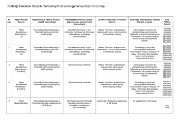 Rodzaje Pakietów Danych oferowanych do udostępnienia przez CS Group Nr poz . Nazwa Pakietu Danych Przeznaczenie Pakietu Danych – sposób komunikacji Przeznaczenie Pakietu Danych dopuszczalna prawnie treść komunikacji Zawartość Rekordu w Pakiecie Danych Możliwość wykorzystania Pakietu Danych w czasie 1 Pakiet Standardowy Jednorazowy – List Komunikacja Zamawiającego z Podmiotem przy użyciu listu tradycyjnego Wszelkie informacje, w tym informacje handlowe lub informacje o charakterze marketingu bezpośredniego Nazwa Podmiotu, województwo, miejscowość, ulica, numer budynku, numer lokalu, branża Zamawiający ma prawo do jednokrotnego wykorzystania Rekordów w terminie określonym w Zamówieniu, nie przekraczającym 60 dni od daty udostępnienia danych. SDAJ046 SDAJ042 SDAJ036 SDAJ030 SDAJN064 SDAJN057 SDAJN050 SDAJN042 2 Pakiet Standardowy Wielokrotny – List Komunikacja Zamawiającego z Podmiotem przy użyciu listu tradycyjnego Wszelkie informacje, w tym informacje handlowe lub informacje o charakterze marketingu bezpośredniego Nazwa Podmiotu, województwo, miejscowość, ulica, numer budynku, numer lokalu, branża Zamawiający ma prawo wykorzystania Rekordów maksymalnie 4 razy w miesiącu. W ciągu 12 miesięcy Zamawiający może z nich skorzystać maksymalnie 48 razy SDAW093 SDAW083 SDAW072 SDAW061 SDAWN128 SDAWN115 SDAWN099 SDAWN084 3 Pakiet Standardowy Jednorazowy – E-mailing Komunikacja zamawiającego z Podmiotem przy użyciu poczty elektronicznej Tylko informacje handlowe Nazwa Podmiotu, województwo, miejscowość, adres poczty elektronicznej, branża Zamawiający ma prawo do jednokrotnego wykorzystania Rekordów w terminie określonym w Zamówieniu, nie przekraczającym 60 dni od daty udostępnienia danych. SDEJ038 SDEJ034 SDEJ028 SDEJ022 SDEJN053 SDEJN046 SDEJN039 SDEJN031 4 Pakiet Standardowy Wielokrotny – E-mailing Komunikacja Zamawiającego z Podmiotem przy użyciu poczty elektronicznej Tylko informacje handlowe Nazwa Podmiotu, województwo, miejscowość, adres poczty elektronicznej, branża Zamawiający ma prawo wykorzystania Rekordów maksymalnie 4 razy w miesiącu. W ciągu 12 miesięcy Zamawiający może z nich skorzystać maksymalnie 48 razy SDEW077 SDEW067 SDEW056 SDEW045 SDEWN106 SDEWN093 SDEWN077 SDEWN062 5 Pakiet Niestandardowy Komunikacja Zamawiającego z Podmiotem kanałem uzgodnionym z CS Group Informacje inne niż informacje handlowe lub informacje o charakterze marketingu bezpośredniego Informacje o Podmiocie uzgodnione z CS Group Do uzgodnienia z CS Group Kod Pakietu Danych SDN SDNN Definicje: Podmiot - podmiot gospodarczy lub organizacja zarejestrowana w Centralnej Ewidencji i Informacji o Działalności Gospodarczej, prowadzonej przez Ministra Rozwoju lub w Krajowym Rejestrze Sądowym, prowadzonym przez Ministra Sprawiedliwości. Informacje Handlowe - opracowana przez Zamawiającego treść komunikatu zawierająca informacje przeznaczone bezpośrednio lub pośrednio do promowania towarów, usług lub wizerunku Zamawiającego. Informacje o charakterze marketingu bezpośredniego - opracowana przez Zamawiającego treść komunikatu, którego celem jest bezpośrednie zaoferowanie Podmiotowi do nabycia towarów lub usług Zamawiającego. Telekomunikacyjne urządzenia końcowe – wszelkie urządzenia telekomunikacyjne których użytkownikiem końcowym jest Podmiot, umożliwiające komunikację z Podmiotem poprzez połączenie głosowe, SMS/MMS, komunikator internetowy. Nazwa kodu pakietu z dodatkową literą „N” na końcu (SDAJN, SDAWN, SDEWN, SDNN) oznacza bazę zawierającą firmy nowopowstałe (w 2015 lub 2016 roku).