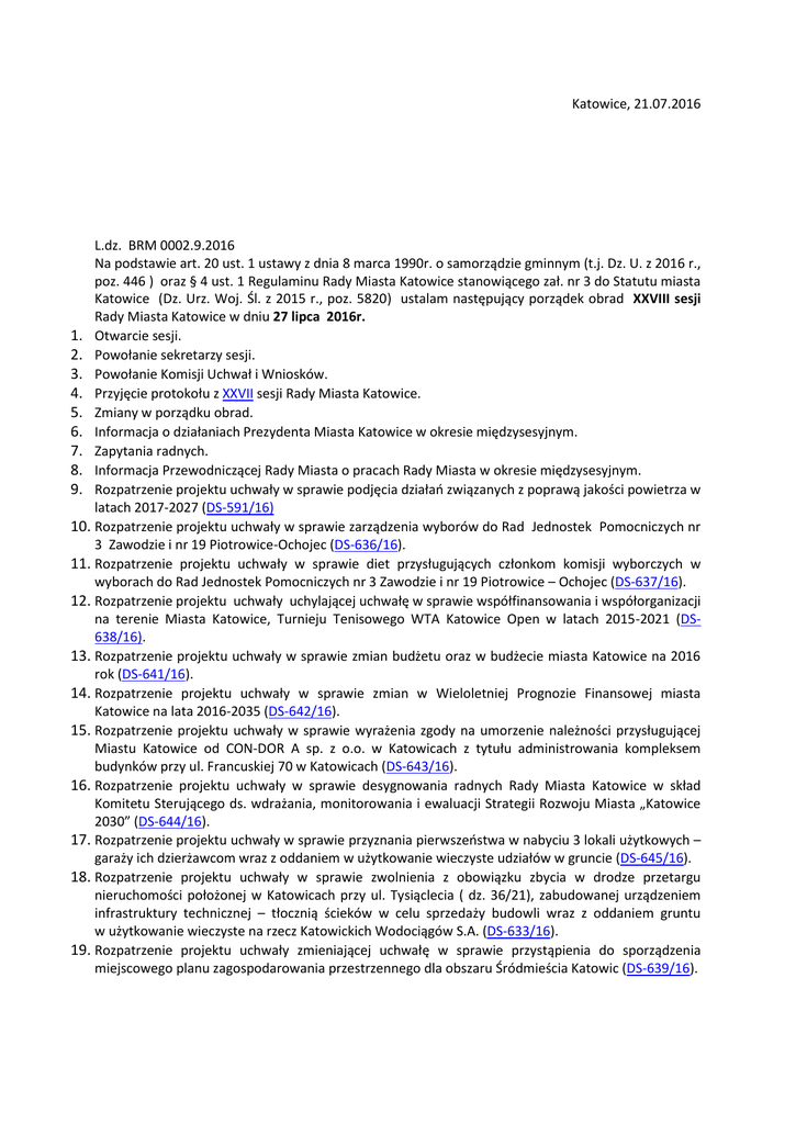 Katowice, 21.07.2016 L.dz. BRM 0002.9.2016 Na podstawie art. 20 ust. 1 ustawy z dnia 8 marca 1990r. o samorządzie gminnym (t.j. Dz. U. z 2016 r., poz. 446 ) oraz § 4 ust. 1 Regulaminu Rady Miasta Katowice stanowiącego zał. nr 3 do Statutu miasta Katowice (Dz. Urz. Woj. Śl. z 2015 r., poz. 5820) ustalam następujący porządek obrad XXVIII sesji Rady Miasta Katowice w dniu 27 lipca 2016r. 1. Otwarcie sesji. 2. Powołanie sekretarzy sesji. 3. Powołanie Komisji Uchwał i Wniosków. 4. Przyjęcie protokołu z XXVII sesji Rady Miasta Katowice. 5. Zmiany w porządku obrad. 6. Informacja o działaniach Prezydenta Miasta Katowice w okresie międzysesyjnym. 7. Zapytania radnych. 8. Informacja Przewodniczącej Rady Miasta o pracach Rady Miasta w okresie międzysesyjnym. 9. Rozpatrzenie projektu uchwały w sprawie podjęcia działań związanych z poprawą jakości powietrza w latach 2017-2027 (DS-591/16) 10. Rozpatrzenie projektu uchwały w sprawie zarządzenia wyborów do Rad Jednostek Pomocniczych nr 3 Zawodzie i nr 19 Piotrowice-Ochojec (DS-636/16). 11. Rozpatrzenie projektu uchwały w sprawie diet przysługujących członkom komisji wyborczych w wyborach do Rad Jednostek Pomocniczych nr 3 Zawodzie i nr 19 Piotrowice – Ochojec (DS-637/16). 12. Rozpatrzenie projektu uchwały uchylającej uchwałę w sprawie współfinansowania i współorganizacji na terenie Miasta Katowice, Turnieju Tenisowego WTA Katowice Open w latach 2015-2021 (DS638/16). 13. Rozpatrzenie projektu uchwały w sprawie zmian budżetu oraz w budżecie miasta Katowice na 2016 rok (DS-641/16). 14. Rozpatrzenie projektu uchwały w sprawie zmian w Wieloletniej Prognozie Finansowej miasta Katowice na lata 2016-2035 (DS-642/16). 15. Rozpatrzenie projektu uchwały w sprawie wyrażenia zgody na umorzenie należności przysługującej Miastu Katowice od CON-DOR A sp. z o.o. w Katowicach z tytułu administrowania kompleksem budynków przy ul. Francuskiej 70 w Katowicach (DS-643/16). 16. Rozpatrzenie projektu uchwały w sprawie desygnowania radnych Rady Miasta Katowice w skład Komitetu Sterującego ds. wdrażania, monitorowania i ewaluacji Strategii Rozwoju Miasta „Katowice 2030” (DS-644/16). 17. Rozpatrzenie projektu uchwały w sprawie przyznania pierwszeństwa w nabyciu 3 lokali użytkowych – garaży ich dzierżawcom wraz z oddaniem w użytkowanie wieczyste udziałów w gruncie (DS-645/16). 18. Rozpatrzenie projektu uchwały w sprawie zwolnienia z obowiązku zbycia w drodze przetargu nieruchomości położonej w Katowicach przy ul. Tysiąclecia ( dz. 36/21), zabudowanej urządzeniem infrastruktury technicznej – tłocznią ścieków w celu sprzedaży budowli wraz z oddaniem gruntu w użytkowanie wieczyste na rzecz Katowickich Wodociągów S.A. (DS-633/16). 19. Rozpatrzenie projektu uchwały zmieniającej uchwałę w sprawie przystąpienia do sporządzenia miejscowego planu zagospodarowania przestrzennego dla obszaru Śródmieścia Katowic (DS-639/16). 20. Rozpatrzenie projektu uchwały w sprawie uchwalenia miejscowego planu zagospodarowania przestrzennego dla obszaru w rejonie ulic Gliwickiej, Brackiej i Grundmanna w Katowicach, z wyłączeniem części wschodniej obszaru dawnej Huty Baildon (DS-640/16). 21. Rozpatrzenie projektu uchwały w sprawie uchwalenia miejscowego planu zagospodarowania przestrzennego południowych dzielnic miasta Katowice, w obszarze fragmentów terenów górniczych Murcki I i Giszowiec I – KWK „Murcki - Staszic”- część obejmująca przebieg drogi od rejonu ul. Sandacza do ul. Rolniczej (DS-634/16). 22. Rozpatrzenie projektu uchwały w sprawie uchwalenia miejscowego planu zagospodarowania przestrzennego południowych dzielnic miasta Katowice, w obszarze fragmentów terenów górniczych Murcki I i Giszowiec I – KWK „Murcki – Staszic” – część obejmująca przebieg drogi od ul. Kościuszki do ul. Armii Krajowej (DS-635/16). 23. Interpelacje radnych. 24. Komunikaty i wolne wnioski. 25. Zamknięcie sesji. Krystyna Siejna Przewodnicząca Rady Miasta Katowice