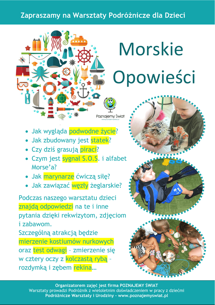 Zapraszamy na Warsztaty Podróżnicze dla Dzieci Morskie Opowieści Jak wygląda podwodne życie? Jak zbudowany jest statek? Czy dziś grasują piraci? Czym jest sygnał S.O.S. i alfabet Morse’a? Jak marynarze ćwiczą siłę? Jak zawiązać węzły żeglarskie? Podczas naszego warsztatu dzieci znajdą odpowiedzi na te i inne pytania dzięki rekwizytom, zdjęciom i zabawom. Szczególną atrakcją będzie mierzenie kostiumów nurkowych oraz test odwagi – zmierzenie się w cztery oczy z kolczastą rybą – rozdymką i zębem rekina… Organizatorem zajęć jest firma POZNAJEMY ŚWIAT Warsztaty prowadzi Podróżnik z wieloletnim doświadczeniem w pracy z dziećmi Podróżnicze Warsztaty i Urodziny - www.poznajemyswiat.pl