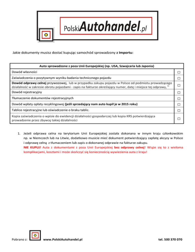 Jakie dokumenty musisz dostać kupując samochód sprowadzony z Importu: Auto sprowadzone z poza Unii Europejskiej (np. USA, Szwajcaria lub Japonia) Tablice rejestracyjne lub oświadczenie o braku tablic. □ □ □ □ □ □ □ Kopia zaświadczenia o wpisie do ewidencji działalności gospodarczej lub kopia KRS potwierdzająca prowadzenie przez zbywcę takiej działalności □ Dowód własności Zaświadczenia o pozytywnym wyniku badania technicznego pojazdu Dowód odprawy celnej przywozowej, lub w przypadku zakupu pojazdu w Polsce od podmiotu prowadzącego działalność w zakresie obrotu pojazdami - zapis na fakturze określający numer, datę i miejsce tej odprawy, 1) Dowód rejestracyjny Tłumaczenie dokumentów rejestracyjnych Dowód wpłaty opłaty recyklingowej (jeśli sprzedający nam auto kupił je w 2015 roku) 1. Jeżeli odprawa celna na terytorium Unii Europejskiej została dokonana w innym kraju członkowskim np. w Niemczech lub na Litwie, dodatkowo musicie mieć dokument potwierdzający zapłatę akcyzy w Polsce i odprawę celną z tłumaczeniem lub zapis o dokonanej odprawie na fakturze zakupu. NIE KUPUJ! Auta z dokumentami z poza Unii Europejskiej bez odprawy celnej! Wiąże się to z wieloma komplikacjami, kosztami i może skończyć się koniecznością wywiezienia auta z kraju! Pobrano z: www.PolskiAutohandel.pl tel. 500 370 070
