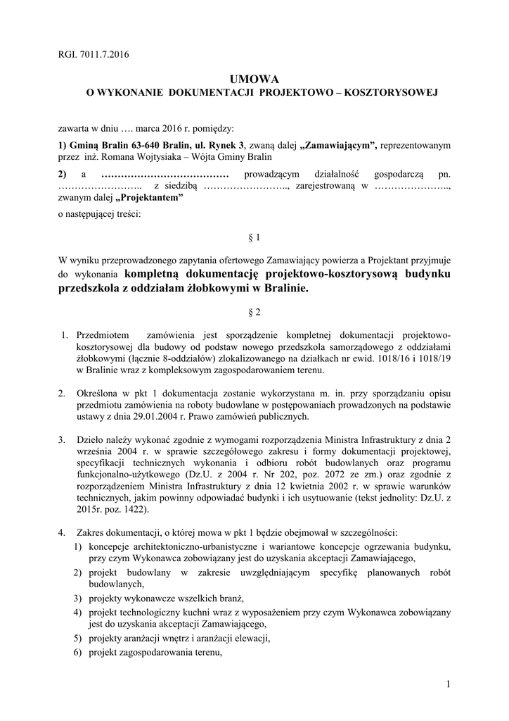 zał 8 -UMOWA -projekt Przedszkola Bralin 2016