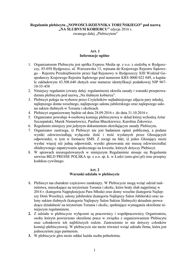 Regulamin plebiscytu „NOWOŚCI-DZIENNIKA TORUŃSKIEGO” pod nazwą „NA ŚLUBNYM KOBIERCU” edycja 2016 r. zwanego dalej „Plebiscytem” Art. 1 Informacje ogólne 1. Organizatorem Plebiscytu jest spółka Express Media sp. z o.o. z siedzibą w Bydgoszczy, 85-058 Bydgoszcz, ul. Warszawska 13, wpisana do Krajowego Rejestru Sądowego – Rejestru Przedsiębiorców przez Sąd Rejonowy w Bydgoszczy XIII Wydział Gospodarczy Krajowego Rejestru Sądowego pod numerem KRS 0000 022 049, o kapitale zakładowym 43.508.640 złotych oraz numerze identyfikacji podatkowej NIP 96710-55-458 2. Niniejszy regulamin (zwany dalej: regulaminem) określa zasady i warunki przeprowadzenia plebiscytu pod nazwą „Na ślubnym kobiercu”. 3. Plebiscyt polega na wyborze przez Czytelników najładniejszego zdjęcia pary młodej, najlepszego domu weselnego, najlepszego salonu jubilerskiego oraz najlepszego salonu sukien ślubnych w Toruniu i okolicach. 4. Plebiscyt organizowany będzie od dnia 28.09.2016 r. do dnia 31.10.2016 r. 5. Organizator powołuje 4-osobową komisję plebiscytową w skład której wchodzą Artur Szczepański, Marek Nienartowicz, Paulina Błaszkiewicz, Karolina Żakowicz. 6. Regulamin niniejszy jest jedynym dokumentem określającym zasady Plebiscytu. 7. Organizator zastrzega, iż Plebiscyt nie jest badaniem opinii publicznej, a podane wyniki odzwierciedlają wyłącznie ilość i treść wysłanych przez Głosujących odpowiedzi, w tym w formacie SMS. Z uwagi na fakt, iż jeden Głosujący może wysłać więcej niż jedną odpowiedź, wyniki głosowania nie muszą odzwierciedlać obiektywnego zapatrywania społecznego na kwestie, których dotyczy Plebiscyt. 8. W sprawach nieuregulowanych w niniejszym Regulaminie stosuje się Regulamin serwisu BILD PRESSE POLSKA sp. z o.o. sp. k. w Łodzi (sms.qiwi.pl) oraz przepisy kodeksu cywilnego. Art. 2 Warunki udziału w plebiscycie 1. Plebiscyt ma charakter częściowo zamknięty. W Plebiscycie mogą wziąć udział małżeństwa, mieszkające na terytorium Torunia i okolic, które brały ślub najpóźniej w 2014 r. (kategoria Najpiękniejsza Para Młoda) oraz domy weselne (kategoria Najlepszy Dom Weselny), salony jubilerskie (kategoria Najlepszy Salon Jubilerski) oraz salony sukien ślubnych (kategoria Najlepszy Salon Sukien Ślubnych) aktualnie prowadzące działalność na terytorium Torunia i okolic, spełniające wymagania określone niniejszym regulaminem. 2. Z udziału w plebiscycie wyłączeni są pracownicy i współpracownicy Organizatora, osoby którym powierzono określone prace w związku z organizowaniem Plebiscytu oraz członkowie ich najbliższych rodzin. Zastrzeżenie to nie dotyczy członków komisji plebiscytowej. W plebiscycie nie może również wziąć udziału firma, która jest jednocześnie jego partnerem. 3. W plebiscycie głos może oddać każda osoba pełnoletnia. 1 Art. 3 Zasady przeprowadzania Plebiscytu – kategoria Najpiękniejsza Para Młoda I. Zgłaszanie kandydatur 1. Plebiscyt będzie się odbywał w dniach od 28.09.2016 od godz. 00:01 do 31.10.2016 r. do godz. 23:59 . Zgłoszenia będą przyjmowane od 28.09.2016 r. od godz. 00:01 do 11.10.2016 r. do godz. 23:59. 2. Zgłoszenie powinno zawierać: a. Zdjęcie pary młodej ze ślubu, wesela lub ślubnej sesji plenerowej b. Imiona i nazwiska osób na zdjęciu (uczestników plebiscytu) c. Data ślubu d. Adres zamieszkania e. Numer telefonu do kontaktu w sprawach plebiscytu f. Zgoda na wykorzystanie wizerunku (WZÓR: Ja ……….(imię i nazwisko), urodzony/a …………(data urodzenia), wyrażam zgodę na nieodpłatną publikację wizerunku swojego oraz posiadam również zgodę na wykorzystanie wizerunku małżonki/małżonka ……………. (imię i nazwisko małżonki/małżonka) przez Organizatora plebiscytu. Pisemne potwierdzenie obejmuje zgodę na wykorzystanie, utrwalanie, obróbkę i powielanie wykonanych zdjęć, za pośrednictwem mediów elektronicznych i drukowanych. ) 3. Zgłoszenia można dokonać: a. drogą elektroniczną nadsyłając zgłoszenie na adres e-mail [email protected] W przypadku, gdy zgłoszenie pochodzi od innej osoby niż kandydat, należy przesłać zgodę kandydata na wykorzystanie wizerunku w celach i na zasadach określonych niniejszym regulaminem. Prawidłowe zgłoszenia należy dostarczyć drogą elektroniczną, na w/w adres e-mail do godz. 23:59 w dniu 11.10.2016 roku. b. Zgłoszenia może również dokonać Komisja Plebiscytowa. 4. Organizator zastrzega sobie prawo do weryfikacji zgłoszeń pod kątem ich zgodności z regulaminem, w szczególności weryfikacji zgłoszeń w zakresie ich zgodności z treścią pkt. 2 niniejszego artykułu oraz prawem. Zgłoszenia zweryfikowane negatywnie oznaczać będą, że kandydatura nie została dołączona do listy kandydatów o czym zgłaszający zostanie poinformowany niezwłocznie przez Organizatora na podane dane kontaktowe z informacją o przyczynach negatywnej weryfikacji. W przypadku prawidłowo dokonanego zgłoszenia kandydatura zostanie od dnia 17.10.2016 r. dołączona do listy kandydatów. W przypadku zgłoszenia zweryfikowanego negatywnie można dokonać ponownego poprawnego zgłoszenia zawierającego poprawne dane lub zgłosić do Organizatora reklamację na zasadach określonych w art. 6. 5. W dniu 17.10.2016 r. na stronie internetowej www.plebiscyty.expressmedia.pl oraz na łamach „Expressu Bydgoskiego” zostanie opublikowana lista zweryfikowanych kandydatur do udziału w Plebiscycie. 6. Organizator zastrzega sobie prawo do odwołania plebiscytu. Zgłaszający potencjalnych kandydatów do plebiscytu zostaną poinformowani o odwołaniu plebiscytu telefonicznie, SMS-owo lub e-mailowo. Plebiscyt może zostać odwołany nie później niż przed rozpoczęciem etapu głosowania SMS-owego. 2 II. Głosowanie 1. Głosowanie odbywać się będzie za pomocą SMS Premium i będzie trwało od 17.10.2016 r. od godz. 00:01 do 31.10.2016 r. do godz. 23:59 na następujących warunkach.