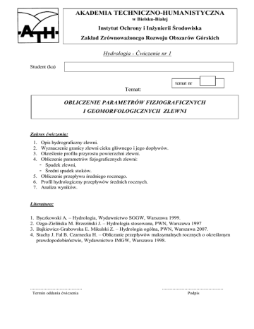 AKADEMIA TECHNICZNO-HUMANISTYCZNA w Bielsku-Białej Instytut Ochrony i Inżynierii Środowiska Zakład Zrównoważonego Rozwoju Obszarów Górskich Hydrologia - Ćwiczenie nr 1 Student (ka) temat nr Temat: OBLICZENIE PARAMETRÓW FIZJOGRAFICZNYCH I GEOMORFOLOGICZNYCH ZLEWNI Zakres ćwiczenia: 1. 2. 3. 4. Opis hydrograficzny zlewni. Wyznaczenie granicy zlewni cieku głównego i jego dopływów. Określenie profilu przyrostu powierzchni zlewni. Obliczenie parametrów fizjograficznych zlewni: - Spadek zlewni, - Średni spadek stoków. 5. Obliczenie przepływu średniego rocznego. 6. Profil hydrologiczny przepływów średnich rocznych. 7. Analiza wyników. Literatura: 1. 2. 3. 4. Byczkowski A. – Hydrologia, Wydawnictwo SGGW, Warszawa 1999. Ozga-Zielińska M. Brzeziński J. – Hydrologia stosowana, PWN, Warszawa 1997 Bajkiewicz-Grabowska E. Mikulski Z. – Hydrologia ogólna, PWN, Warszawa 2007. Stachy J. Fal B. Czarnecka H. – Obliczanie przepływów maksymalnych rocznych o określonym prawdopodobieństwie, Wydawnictwo IMGW, Warszawa 1998. ....................................... .............................................. Termin oddania ćwiczenia Podpis