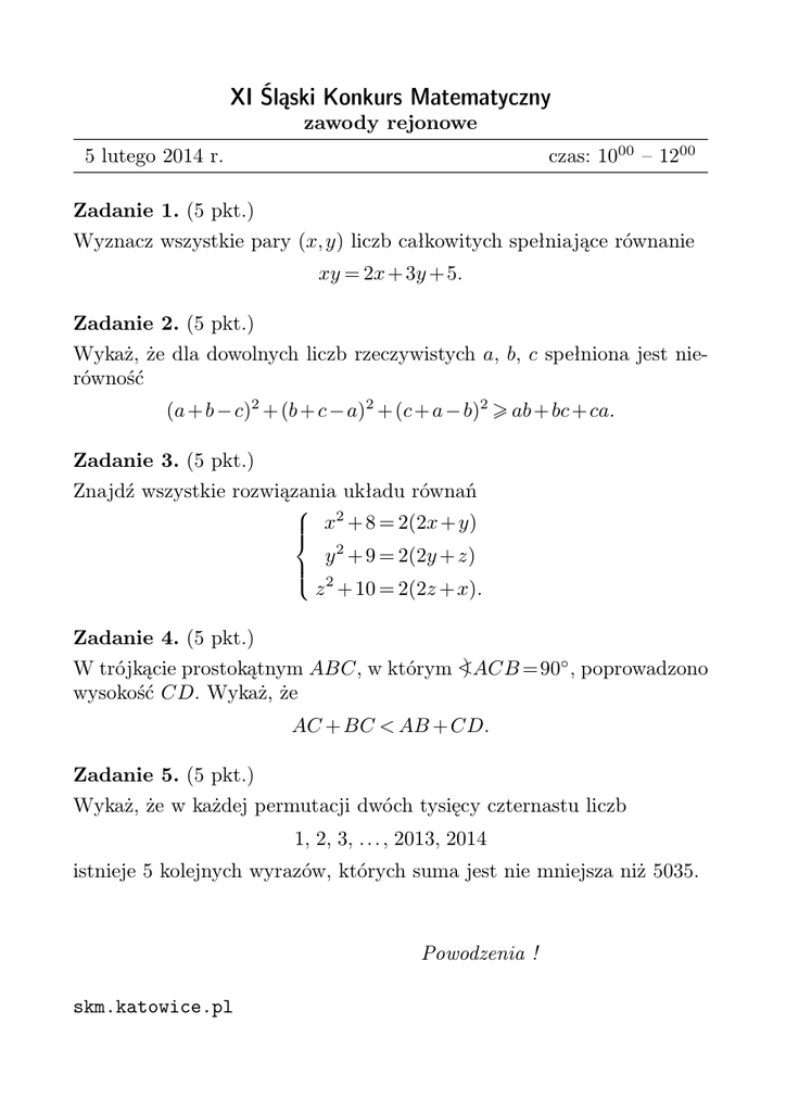 XI Śląski Konkurs Matematyczny zawody rejonowe czas: 1000 – 1200 5 lutego 2014 r. Zadanie 1. (5 pkt.) Wyznacz wszystkie pary (x, y) liczb całkowitych spełniające równanie xy = 2x + 3y + 5. Zadanie 2. (5 pkt.) Wykaż, że dla dowolnych liczb rzeczywistych a, b, c spełniona jest nierówność (a + b − c)2 + (b + c − a)2 + (c + a − b)2 ab + bc + ca. Zadanie 3. (5 pkt.) Znajdź wszystkie rozwiązania układu równań 2 x + 8 = 2(2x + y) y 2 + 9 = 2(2y + z) z 2 + 10 = 2(2z + x). Zadanie 4. (5 pkt.) ) ACB =90◦ , poprowadzono W trójkącie prostokątnym ABC, w którym < wysokość CD. Wykaż, że AC + BC < AB + CD. Zadanie 5. (5 pkt.) Wykaż, że w każdej permutacji dwóch tysięcy czternastu liczb 1, 2, 3, . . . , 2013, 2014 istnieje 5 kolejnych wyrazów, których suma jest nie mniejsza niż 5035. Powodzenia ! skm.katowice.pl