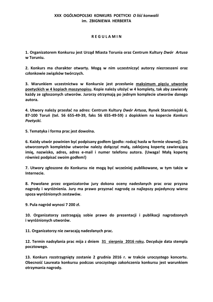 XXX OGÓLNOPOLSKI KONKURS POETYCKI O liść konwalii im. ZBIGNIEWA HERBERTA REGULAMIN 1. Organizatorem Konkursu jest Urząd Miasta Torunia oraz Centrum Kultury Dwór Artusa w Toruniu. 2. Konkurs ma charakter otwarty. Mogą w nim uczestniczyć autorzy niezrzeszeni oraz członkowie związków twórczych. 3. Warunkiem uczestnictwa w Konkursie jest przesłanie maksimum pięciu utworów poetyckich w 4 kopiach maszynopisu. Kopie należy ułożyć w 4 komplety, tak aby zawierały każdy ze zgłoszonych utworów. Jurorzy otrzymają po jednym komplecie utworów danego autora. 4. Utwory należy przesłać na adres: Centrum Kultury Dwór Artusa, Rynek Staromiejski 6, 87-100 Toruń (tel. 56 655-49-39, faks 56 655-49-59) z dopiskiem na kopercie Konkurs Poetycki. 5. Tematyka i forma prac jest dowolna. 6. Każdy utwór powinien być podpisany godłem (godło: rodzaj hasła w formie słownej). Do utworzonych kompletów utworów należy dołączyć małą, zaklejoną kopertę zawierającą imię, nazwisko, adres, adres e-mail i numer telefonu autora. (Uwaga! Małą kopertę również podpisać swoim godłem!) 7. Utwory zgłoszone do Konkursu nie mogą być wcześniej publikowane, w tym także w Internecie. 8. Powołane przez organizatorów jury dokona oceny nadesłanych prac oraz przyzna nagrody i wyróżnienia. Jury ma prawo przyznać nagrodę za najlepszy pojedynczy wiersz spoza wyróżnionych zestawów. 9. Pula nagród wynosi 7 200 zł. 10. Organizatorzy zastrzegają sobie prawo do prezentacji i publikacji nagrodzonych i wyróżnionych utworów. 11. Organizatorzy nie zwracają nadesłanych prac. 12. Termin nadsyłania prac mija z dniem 31 sierpnia 2016 roku. Decyduje data stempla pocztowego. 13. Konkurs rozstrzygnięty zostanie 2 grudnia 2016 r. w trakcie uroczystego koncertu. Obecność Laureata konkursu podczas uroczystego zakończenia konkursu jest warunkiem otrzymania nagrody.