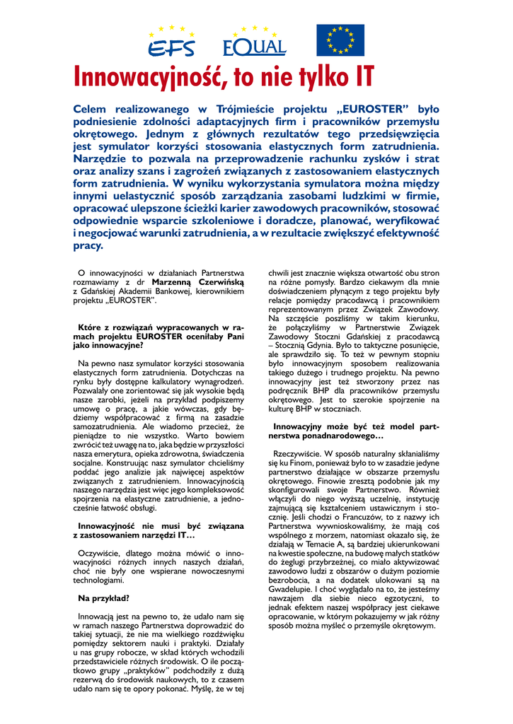 Innowacyjność, to nie tylko IT Celem realizowanego w Trójmieście projektu „EUROSTER” było podniesienie zdolności adaptacyjnych firm i pracowników przemysłu okrętowego. Jednym z głównych rezultatów tego przedsięwzięcia jest symulator korzyści stosowania elastycznych form zatrudnienia. Narzędzie to pozwala na przeprowadzenie rachunku zysków i strat oraz analizy szans i zagrożeń związanych z zastosowaniem elastycznych form zatrudnienia. W wyniku wykorzystania symulatora można między innymi uelastycznić sposób zarządzania zasobami ludzkimi w firmie, opracować ulepszone ścieżki karier zawodowych pracowników, stosować odpowiednie wsparcie szkoleniowe i doradcze, planować, weryfikować i negocjować warunki zatrudnienia, a w rezultacie zwiększyć efektywność pracy. O innowacyjności w działaniach Partnerstwa rozmawiamy z dr Marzenną Czerwińską z Gdańskiej Akademii Bankowej, kierownikiem projektu „EUROSTER”. Które z rozwiązań wypracowanych w ramach projektu EUROSTER oceniłaby Pani jako innowacyjne? Na pewno nasz symulator korzyści stosowania elastycznych form zatrudnienia. Dotychczas na rynku były dostępne kalkulatory wynagrodzeń. Pozwalały one zorientować się jak wysokie będą nasze zarobki, jeżeli na przykład podpiszemy umowę o pracę, a jakie wówczas, gdy będziemy współpracować z firmą na zasadzie samozatrudnienia. Ale wiadomo przecież, że pieniądze to nie wszystko. Warto bowiem zwrócić też uwagę na to, jaka będzie w przyszłości nasza emerytura, opieka zdrowotna, świadczenia socjalne. Konstruując nasz symulator chcieliśmy poddać jego analizie jak najwięcej aspektów związanych z zatrudnieniem. Innowacyjnością naszego narzędzia jest więc jego kompleksowość spojrzenia na elastyczne zatrudnienie, a jednocześnie łatwość obsługi. Innowacyjność nie musi być związana z zastosowaniem narzędzi IT… Oczywiście, dlatego można mówić o innowacyjności różnych innych naszych działań, choć nie były one wspierane nowoczesnymi technologiami. Na przykład? Innowacją jest na pewno to, że udało nam się w ramach naszego Partnerstwa doprowadzić do takiej sytuacji, że nie ma wielkiego rozdźwięku pomiędzy sektorem nauki i praktyki. Działały u nas grupy robocze, w skład których wchodzili przedstawiciele różnych środowisk. O ile początkowo grupy „praktyków” podchodziły z dużą rezerwą do środowisk naukowych, to z czasem udało nam się te opory pokonać. Myślę, że w tej chwili jest znacznie większa otwartość obu stron na różne pomysły. Bardzo ciekawym dla mnie doświadczeniem płynącym z tego projektu były relacje pomiędzy pracodawcą i pracownikiem reprezentowanym przez Związek Zawodowy. Na szczęście poszliśmy w takim kierunku, że połączyliśmy w Partnerstwie Związek Zawodowy Stoczni Gdańskiej z pracodawcą – Stocznią Gdynia. Było to taktyczne posunięcie, ale sprawdziło się. To też w pewnym stopniu było innowacyjnym sposobem realizowania takiego dużego i trudnego projektu. Na pewno innowacyjny jest też stworzony przez nas podręcznik BHP dla pracowników przemysłu okrętowego. Jest to szerokie spojrzenie na kulturę BHP w stoczniach. Innowacyjny może być też model partnerstwa ponadnarodowego… Rzeczywiście. W sposób naturalny skłanialiśmy się ku Finom, ponieważ było to w zasadzie jedyne partnerstwo działające w obszarze przemysłu okrętowego. Finowie zresztą podobnie jak my skonfigurowali swoje Partnerstwo. Również włączyli do niego wyższą uczelnię, instytucję zajmującą się kształceniem ustawicznym i stocznię. Jeśli chodzi o Francuzów, to z nazwy ich Partnerstwa wywnioskowaliśmy, że mają coś wspólnego z morzem, natomiast okazało się, że działają w Temacie A, są bardziej ukierunkowani na kwestie społeczne, na budowę małych statków do żeglugi przybrzeżnej, co miało aktywizować zawodowo ludzi z obszarów o dużym poziomie bezrobocia, a na dodatek ulokowani są na Gwadelupie. I choć wyglądało na to, że jesteśmy nawzajem dla siebie nieco egzotyczni, to jednak efektem naszej współpracy jest ciekawe opracowanie, w którym pokazujemy w jak różny sposób można myśleć o przemyśle okrętowym.