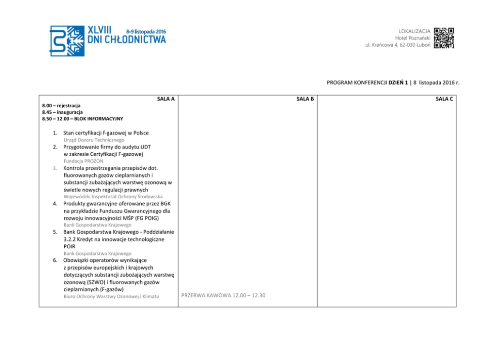 PROGRAM KONFERENCJI DZIEŃ 1 | 8 listopada 2016 r. SALA A SALA B 8.00 – rejestracja 8.45 – inauguracja 8.50 – 12.00 – BLOK INFORMACYJNY 1. Stan certyfikacji f-gazowej w Polsce Urząd Dozoru Technicznego 2. Przygotowanie firmy do audytu UDT w zakresie Certyfikacji F-gazowej Fundacja PROZON 3. Kontrola przestrzegania przepisów dot. fluorowanych gazów cieplarnianych i substancji zubażających warstwę ozonową w świetle nowych regulacji prawnych Wojewódzki Inspektorat Ochrony Środowiska 4. Produkty gwarancyjne oferowane przez BGK na przykładzie Funduszu Gwarancyjnego dla rozwoju innowacyjności MŚP (FG POIG) Bank Gospodarstwa Krajowego 5. Bank Gospodarstwa Krajowego - Poddziałanie 3.2.2 Kredyt na innowacje technologiczne POIR Bank Gospodarstwa Krajowego 6. Obowiązki operatorów wynikające z przepisów europejskich i krajowych dotyczących substancji zubożających warstwę ozonową (SZWO) i fluorowanych gazów cieplarnianych (F-gazów) Biuro Ochrony Warstwy Ozonowej i Klimatu PRZERWA KAWOWA 12.00 – 12.30 SALA C 12.30 – 15.00 BLOK PRODUKTOWO-TECHNOLOGICZNY 1. DAIKIN dostawca energooszczędnych, cichych i spełniających nowe cele, przepisów f-gaz i Ekoprojekt urządzeń chłodniczych Daikin 2. Wykorzystanie energii słonecznej do poprawy efektywności energetycznej układów chłodniczych Klimatherm 3. tytuł w przygotowaniu LG Electronic 4. Nowości produktowe SANHUA SANHUA Europe 5. Opteon ™ w Polsce Chemours 12.30 – 14.30 BLOK NAUKOWY 1. Niekonwencjonalne źródła ciepła w instalacjach ciepłej wody G. Krzyżaniak - Politechnika Poznańska 2. Zastosowanie pomp ciepła w układzie HVAC hali sportowej – studium przypadku Politechnika Poznańska 3. Efektywność pomp ciepła w centralach klimatyzacyjnych K. Ratajczak, E. Szczechowiak Politechnika Poznańska 4. Interaktywne narzędzie sieciowe do obliczeń i optymalizacji eżektorów EjectorPL Z. Buliński - Politechnika Śląska 5. Porównanie zależności służących do obliczania współczynników przyjmowania ciepła podczas skraplania czynników chłodniczych A. Szelągowski – Politechnika Warszawska 6. Analiza możliwości generacji prądu elektrycznego za pomocą modułów termoelektrycznych. K. Prochowicz, D. Kochanowski, A. Ruciński – Politechnika Warszawska PRZERWA OBIADOWA 14.30 – 15.45 12.30 – 15.00 BLOK INSTALACYJNY 1. Diagnostyka klimatyzatorów komercyjnych AUX za pomocą programu komputerowego Action Energy 2. Przyrządy pomiarowe Testo - nowoczesna diagnostyka instalacji elektrycznych Testo 3. Przyczyny uszkodzeń sprężarek SCROLL SYSTHERM 4. Praktyczne zagadnienia związane z odzyskiem czynnika chłodniczego Fundacja PROZON 5. Nowoczesne rozwiązania odprowadzania skroplin. Pompy akcesoria montażowe ASPEN oraz systemy BIG FOOT w praktyce. BIGFOOT SYSTEMS/ASPEN 15.45 – 17.15 BLOK PRODUKTOWO-TECHNOLOGICZNY 1. Oszczędność nakładów i energii w układach wodno-glikolowych z dynamicznym równoważeniem instalacji BELIMO 2. Gazowe pompy ciepła. Źródło ciepła i chłodu w obiektach biurowych KLIMATHERM 3. Badanie pompy ciepła w nawiewnowywiewnej centrali klimatyzacyjnej z odzyskiem ciepła SYSTHERM 15.45 – 17.05 BLOK NAUKOWY 1. Najnowsze trendy w czynnikach i instalacjach chłodniczych (supermarkety, lodówki na napoje, pompy ciepła itp.) J. Smołka – Politechnika Śląska 2. Model homogeniczny relaksacyjny na platformie obliczeniowej projektowania strumienic na dwutlenek węgla. M. Palacz, M. Haida – Politechnika Śląska 3. Przegląd instalacji chłodnictwa absorpcyjnego A. Grzebielec – Politechnika Warszawska 4. Analiza czynników niskowrzących do rozprężania w cylindrze z tłokiem hydraulicznym W. Bujalski, K. Futyma, A. Grzebielec, J. Milewski, J. Kucowski, Z. Rudowicz, A. Rusowicz – Politechnika Warszawska, "MESTIL" Sp. z o.o. KOLACJA BIZNESOWA 20.00 15.45 – 16.45 BLOK PRODUKTOWO-TECHNOLOGICZNY 1. Prezentacja oferty Seibu Giken DST Poland Seibu Giken DST Poland 2. Nowe produkty marki Gree dla klimatyzacji i chłodnictwa w obiektach biurowych i przemysłowych GREE 3. Rozwój zastosowań oraz udoskonalenia systemu klimatyzacyjnego VRF - GMV GREE