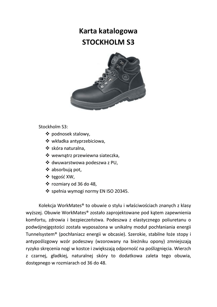 Karta katalogowa STOCKHOLM S3 Stockholm S3: podnosek stalowy, wkładka antyprzebiciowa, skóra naturalna, wewnątrz przewiewna siateczka, dwuwarstwowa podeszwa z PU, absorbują pot, tęgość XW, rozmiary od 36 do 48, spełnia wymogi normy EN ISO 20345. Kolekcja WorkMates® to obuwie o stylu i właściwościach znanych z klasy wyższej. Obuwie WorkMates® zostało zaprojektowane pod kątem zapewnienia komfortu, zdrowia i bezpieczeństwa. Podeszwa z elastycznego poliuretanu o podwójnejgęstości została wyposażona w unikalny moduł pochłaniania energii Tunnelsystem® (pochłaniacz energii w obcasie). Szerokie, stabilne łoże stopy i antypoślizgowy wzór podeszwy (wzorowany na bieżniku opony) zmniejszają ryzyko skręcenia nogi w kostce i zwiększają odporność na poślizgnięcia. Wierzch z czarnej, gładkiej, naturalnej skóry to dodatkowa zaleta tego obuwia, dostępnego w rozmiarach od 36 do 48.