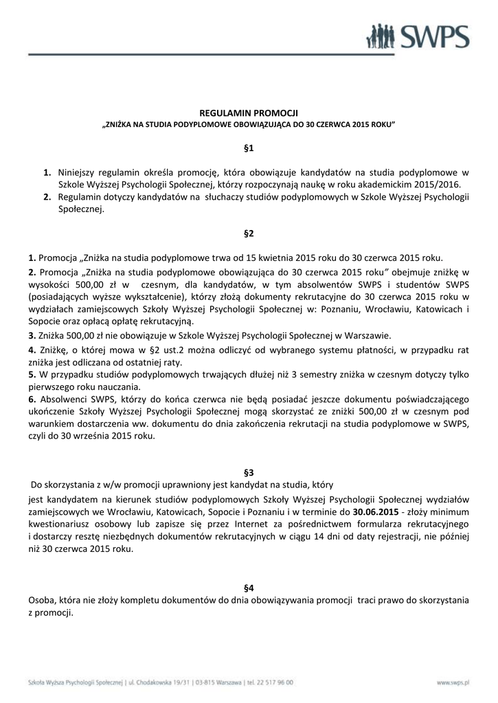 REGULAMIN PROMOCJI „ZNIŻKA NA STUDIA PODYPLOMOWE OBOWIĄZUJĄCA DO 30 CZERWCA 2015 ROKU” §1 1. Niniejszy regulamin określa promocję, która obowiązuje kandydatów na studia podyplomowe w Szkole Wyższej Psychologii Społecznej, którzy rozpoczynają naukę w roku akademickim 2015/2016. 2. Regulamin dotyczy kandydatów na słuchaczy studiów podyplomowych w Szkole Wyższej Psychologii Społecznej. §2 1. Promocja „Zniżka na studia podyplomowe trwa od 15 kwietnia 2015 roku do 30 czerwca 2015 roku. 2. Promocja „Zniżka na studia podyplomowe obowiązująca do 30 czerwca 2015 roku” obejmuje zniżkę w wysokości 500,00 zł w czesnym, dla kandydatów, w tym absolwentów SWPS i studentów SWPS (posiadających wyższe wykształcenie), którzy złożą dokumenty rekrutacyjne do 30 czerwca 2015 roku w wydziałach zamiejscowych Szkoły Wyższej Psychologii Społecznej w: Poznaniu, Wrocławiu, Katowicach i Sopocie oraz opłacą opłatę rekrutacyjną. 3. Zniżka 500,00 zł nie obowiązuje w Szkole Wyższej Psychologii Społecznej w Warszawie. 4. Zniżkę, o której mowa w §2 ust.2 można odliczyć od wybranego systemu płatności, w przypadku rat zniżka jest odliczana od ostatniej raty. 5. W przypadku studiów podyplomowych trwających dłużej niż 3 semestry zniżka w czesnym dotyczy tylko pierwszego roku nauczania. 6. Absolwenci SWPS, którzy do końca czerwca nie będą posiadać jeszcze dokumentu poświadczającego ukończenie Szkoły Wyższej Psychologii Społecznej mogą skorzystać ze zniżki 500,00 zł w czesnym pod warunkiem dostarczenia ww. dokumentu do dnia zakończenia rekrutacji na studia podyplomowe w SWPS, czyli do 30 września 2015 roku. §3 Do skorzystania z w/w promocji uprawniony jest kandydat na studia, który jest kandydatem na kierunek studiów podyplomowych Szkoły Wyższej Psychologii Społecznej wydziałów zamiejscowych we Wrocławiu, Katowicach, Sopocie i Poznaniu i w terminie do 30.06.2015 - złoży minimum kwestionariusz osobowy lub zapisze się przez Internet za pośrednictwem formularza rekrutacyjnego i dostarczy resztę niezbędnych dokumentów rekrutacyjnych w ciągu 14 dni od daty rejestracji, nie później niż 30 czerwca 2015 roku. §4 Osoba, która nie złoży kompletu dokumentów do dnia obowiązywania promocji traci prawo do skorzystania z promocji. §5 1. Kierunki objęte promocją są sygnowane specjalnym napisem : „Zapisz się do 30 czerwca 2015 roku otrzymasz zniżkę 500 zł w czesnym!” na stronie www.podyplomowe.pl 2. Promocja nie obejmuje: a. Promocja „Zniżka 500 zł do 30 czerwca 2015 roku” nie obejmuje kierunków: - Psychologia Transportu z Elementami Psychodiagnostyki - Akademia Trenerów Biznesu - Szkoła Psychoterapii Poznawczo-Behawioralnej Szkoły Wyższej Psychologii Społecznej pod kierownictwem dr Agnieszki Popiel i dr Ewy Pragłowskiej w Wydziale Zamiejscowym SWPS w Katowicach. b. Promocja „Zniżka 500 zł do 30 czerwca 2015 roku” nie obejmuje kierunków: - Specjalizacja w psychologii klinicznej - Szkoła Psychoterapii Poznawczo-Behawioralnej Szkoły Wyższej Psychologii Społecznej pod kierownictwem dr Agnieszki Popiel i dr Ewy Pragłowskiej - Psychologia Transportu z Elementami Psychodiagnostyki w Wydziale Zamiejscowym SWPS we Wrocławiu. c. Promocja „Zniżka 500 zł do 30 czerwca 2015 roku” nie obejmuje kierunku: - Szkoła Psychoterapii Poznawczo-Behawioralnej Szkoły Wyższej Psychologii Społecznej pod kierownictwem dr Agnieszki Popiel i dr Ewy Pragłowskiej, - Psychologia transportu z elementami psychodiagnostyki (dla magistrów psychologii), w Wydziale Zamiejscowym SWPS w Sopocie. d. Promocja „Zniżka 500 zł do 30 czerwca 2015 roku” nie obejmuje kierunku: - Szkoła Psychoterapii Poznawczo-Behawioralnej Szkoły Wyższej Psychologii Społecznej pod kierownictwem dr Agnieszki Popiel i dr Ewy Pragłowskiej w Wydziale Zamiejscowym SWPS w Poznaniu. e. Promocja „Zniżka 500 zł do 30 czerwca 2015 roku” nie obejmuje wszystkich kierunków w SWPS w Warszawie. §6 1. W sprawach nieuregulowanych w Regulaminie stosuje się odpowiednie przepisy, w szczególności Regulaminu Studiów Podyplomowych. 2. Regulamin wchodzi w życie z dniem 15 kwietnia 2015 roku.