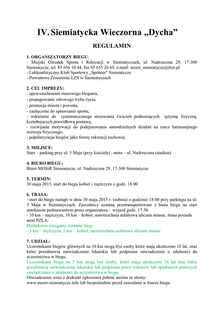 IV. Siemiatycka Wieczorna „Dycha” REGULAMIN 1. ORGANIZATORZY BIEGU: - Miejski Ośrodek Sportu i Rekreacji w Siemiatyczach, ul. Nadrzeczna 29, 17-300 Siemiatycze, tel. 85 656 10 44, fax 85 655 26 65, e-mail: [email protected] - Lekkoatletyczny Klub Sportowy „Sprinter” Siemiatycze - Powiatowe Zrzeszenie LZS w Siemiatyczach 2. CEL IMPREZY: - upowszechnienie masowego biegania, - propagowanie zdrowego trybu życia, - promocja miasta i powiatu, - zachęcenie do uprawiania sportu, - wdrażanie do systematycznego stosowania ćwiczeń podnoszących tężyznę fizyczną, kształtujących prawidłową postawę, - rozwijanie motywacji do podejmowania samodzielnych działań na rzecz harmonijnego rozwoju fizycznego, - popularyzacja biegów jako formy rekreacji ruchowej. 3. MIEJSCE: Start – parking przy ul. 3 Maja (przy kościele) , meta – ul. Nadrzeczna (stadion) 4. BIURO BIEGU: Biuro MOSiR Siemiatycze, ul. Nadrzeczna 29, 17-300 Siemiatycze 5. TERMIN: 30 maja 2015, start do biegu kobiet i mężczyzn o godz. 18:00 6. TRASA: - start do biegu nastąpi w dniu 30 maja 2015 r. (sobota) o godzinie 18:00 przy parkingu na ul. 3 Maja w Siemiatyczach. Zawodnicy zostaną przetransportowani z biura biegu na start autokarem podstawionym przez organizatora – wyjazd godz. 17:30. - 10 km – mężczyzn, 10 km – kobiet, nawierzchnia asfaltowa ulicami miasta, /trasa posiada atest PZLA/ Dodatkowo rozegrany zostanie bieg: - 5 km – mężczyzn, 5 km – kobiet, nawierzchnia asfaltowa ulicami miasta 7. UDZIAŁ: Uczestnikami biegów głównych na 10 km mogą być osoby które mają ukończone 18 lat, oraz które przedstawią zaświadczenie lekarskie lub podpisane oświadczenie o zdolności do uczestnictwa w biegu. Uczestnikami biegu na 5 km mogą być osoby, które mają ukończone 16 lat oraz które przedstawią zaświadczenie lekarskie lub podpisane przez rodziców lub opiekunów prawnych oświadczenie o zdolności do uczestnictwa w biegu. Oświadczenie wraz z drukiem zgłoszenia pobrać można ze strony: www.mosir-siemiatycze.info lub bezpośrednio przed zawodami w biurze biegu. 8. ZGŁOSZENIA: Imienne zgłoszenia elektroniczne po wypełnieniu formularza na stronie www.maratonypolskie.pl lub osobiście w dniu zawodów. Druk zgłoszenia dostępny na www.mosir-siemiatycze.info oraz w biurze zawodów. Zgłoszenia osobiste w dniu zawodów przyjmowane będą od godz. 15:30 do godz. 17:30. Weryfikacja i wydawanie numerów startowych odbędzie się w biurze zawodów. Decyduje kolejność zgłoszeń. Maksymalna ilość uczestników biegu głównego na 10 km – 150 osób. Podczas weryfikacji zawodnicy muszą posiadać dowód osobisty. 9. OPŁATA WPISOWA: Wpisowe do zawodów do dnia 9 maja 2015 wynosi 40 zł (słownie złotych: czterdzieści 00/100). Po tym terminie i w dniu zawodów wpisowe wynosić będzie 80 zł (słownie złotych: osiemdziesiąt 00/100). Wpisowe dla mieszkańców powiatu siemiatyckiego do dnia 9 maja 2015 wynosi 20 zł (słownie złotych: dwadzieścia 00/100). Po tym terminie i w dniu zawodów wpisowe wynosić będzie 50 zł (słownie złotych: pięćdziesiąt 00/100). Wpisowe do biegu na 5 km do dnia 9 maja 2015 wynosi 20 zł (słownie złotych: dwadzieścia 00/100). Po tym terminie i w dniu zawodów wpisowe wynosić będzie 40 zł (słownie złotych: czterdzieści 00/100). Wpisowe opłacić należy na konto Lekkoatletyczny Klub Sportowy „Sprinter” Siemiatycze, ul. Nadrzeczna 29, 17-300 Siemiatycze. Numer konta nr: 48 8092 0001 0004 7047 2000 0010 z dopiskiem IV. Siemiatycka Wieczorna Dycha. Wpisowe nie podlega zwrotowi. Startujący w kategoriach wiekowych: M 65+ oraz K 60+ nie ponoszą opłaty wpisowej do zawodów. 10. KLASYFIKACJE: IV. Siemiatycka Wieczorna Dycha - Generalna mężczyzn: oraz kategorie wiekowe mężczyzn: - M20 kategoria wiekowa od 18 do 29 lat - M30 kategoria wiekowa od 30 do 39 lat - M40 kategoria wiekowa od 40 do 49 lat - M50 kategoria wiekowa od 50 do 59 lat - M60 kategoria wiekowa od 60 do 64 lat - M65+ kategoria wiekowa 65 lat i starsi - Generalna kobiet, i kategorie wiekowe kobiet: - K20 kategoria wiekowa od 18 do 29 lat - K30 kategoria wiekowa od 30 do 39 lat - K40 kategoria wiekowa od 40 do 59 lat - K60+ kategoria wiekowa 60 lat i starsze Puchary za miejsca 1-3 będą przyznawane w przypadku startu co najmniej 3 osób w danej kategorii wiekowej. W biegu na 5 km: - generalna mężczyzn -generalna kobiet 11. NAGRODY: - W biegu głównym mężczyzn nagrody pieniężne: I. miejsce - 450 zł II. miejsce – 300 zł III. miejsce – 200 zł IV. miejsce – 150 zł V. miejsce – 100 zł VI. miejsce – 50 zł W biegu głównym kobiet nagrody pieniężne: I miejsce - 450 zł II miejsce - 300 zł III miejsce – 200 zł. IV. miejsce – 150 zł V. miejsce – 100 zł VI. miejsce – 50 zł - Puchary za I – III miejsce w klasyfikacjach generalnych i wiekowych. - Puchary dla najlepszego zawodnika i zawodniczki z powiatu siemiatyckiego. - Pamiątkowe medale dla wszystkich uczestników biegów - Pamiątkowe koszulki dla zgłoszonych uczestników W biegu na 5 km puchary za miejsca 1-3 w klasyfikacjach generalnych kobiet i mężczyzn, brak nagród finansowych!!! Wśród uczestników zawodów rozlosowane również zostaną nagrody rzeczowe. 12. POSTANOWIENIA KOŃCOWE: - Organizator zapewnia opiekę medyczną w trakcie biegu - Wodę na trasie i po zakończeniu biegu - Elektroniczny pomiar czasu - Ciepły posiłek po zakończeniu biegu (grill lub ognisko) - Podczas biegu wszyscy zawodnicy muszą posiadać numery startowe otrzymane od organizatora i przymocowane do koszulek na piersiach, - Bieg odbędzie się bez względu na pogodę, - Organizator nie ponosi odpowiedzialności za wypadki mające miejsce na trasie biegu, wynikające z winy uczestników. - Organizator zastrzega sobie prawo do przeprowadzenia kontroli antydopingowej. - Interpretacja regulaminu należy do organizatorów.