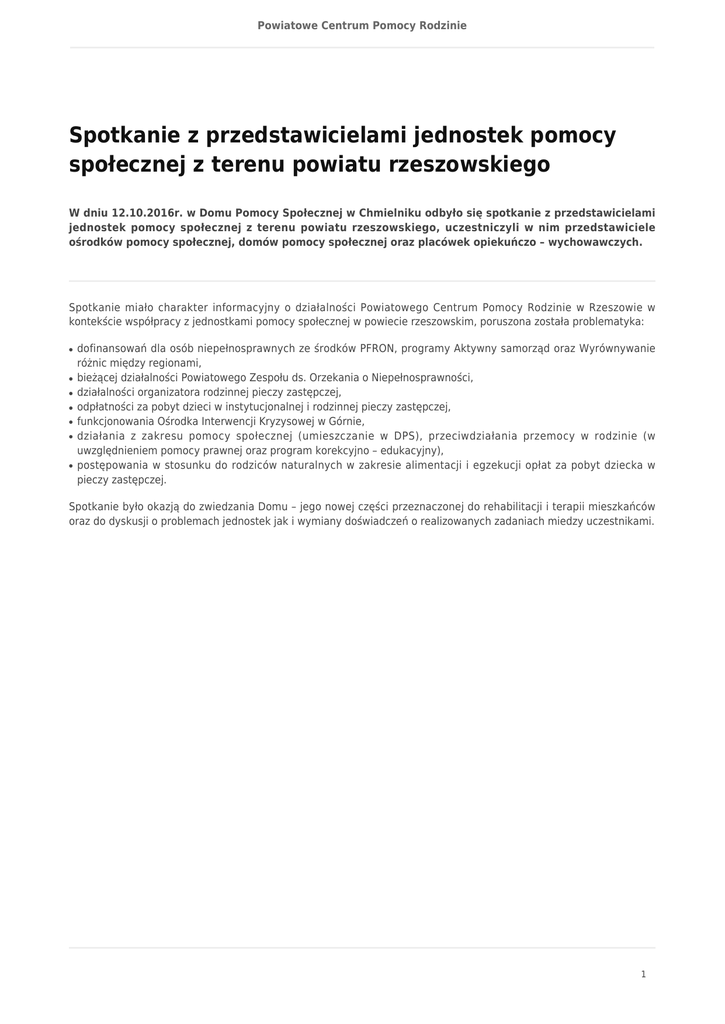 Powiatowe Centrum Pomocy Rodzinie Spotkanie z przedstawicielami jednostek pomocy społecznej z terenu powiatu rzeszowskiego W dniu 12.10.2016r. w Domu Pomocy Społecznej w Chmielniku odbyło się spotkanie z przedstawicielami jednostek pomocy społecznej z terenu powiatu rzeszowskiego, uczestniczyli w nim przedstawiciele ośrodków pomocy społecznej, domów pomocy społecznej oraz placówek opiekuńczo – wychowawczych. Spotkanie miało charakter informacyjny o działalności Powiatowego Centrum Pomocy Rodzinie w Rzeszowie w kontekście współpracy z jednostkami pomocy społecznej w powiecie rzeszowskim, poruszona została problematyka: ● ● ● ● ● ● ● dofinansowań dla osób niepełnosprawnych ze środków PFRON, programy Aktywny samorząd oraz Wyrównywanie różnic między regionami, bieżącej działalności Powiatowego Zespołu ds. Orzekania o Niepełnosprawności, działalności organizatora rodzinnej pieczy zastępczej, odpłatności za pobyt dzieci w instytucjonalnej i rodzinnej pieczy zastępczej, funkcjonowania Ośrodka Interwencji Kryzysowej w Górnie, działania z zakresu pomocy społecznej (umieszczanie w DPS), przeciwdziałania przemocy w rodzinie (w uwzględnieniem pomocy prawnej oraz program korekcyjno – edukacyjny), postępowania w stosunku do rodziców naturalnych w zakresie alimentacji i egzekucji opłat za pobyt dziecka w pieczy zastępczej. Spotkanie było okazją do zwiedzania Domu – jego nowej części przeznaczonej do rehabilitacji i terapii mieszkańców oraz do dyskusji o problemach jednostek jak i wymiany doświadczeń o realizowanych zadaniach miedzy uczestnikami. 1
