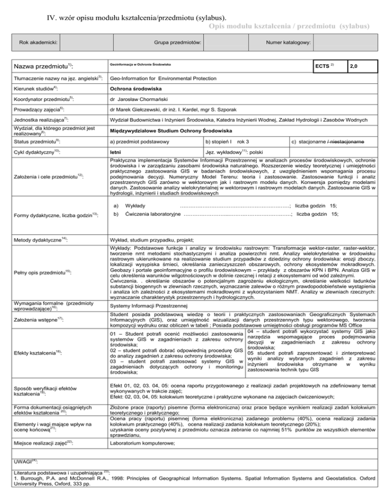 IV. wzór opisu modułu kształcenia/przedmiotu (sylabus). Opis modułu kształcenia / przedmiotu (sylabus) Rok akademicki: Grupa przedmiotów: Numer katalogowy: Nazwa przedmiotu1): Geoinformacja w Ochronie Środowiska Tłumaczenie nazwy na jęz. angielski3): Geo-Information for Environmental Protection 4) ECTS 2) 2,0 Ochrona środowiska Kierunek studiów : Koordynator przedmiotu5): dr Jarosław Chormański 6) Prowadzący zajęcia : dr Marek Giełczewski, dr inż. I. Kardel, mgr S. Szporak Jednostka realizująca7): Wydział Budownictwa i Inżynierii Środowiska, Katedra Inżynierii Wodnej, Zakład Hydrologii i Zasobów Wodnych Wydział, dla którego przedmiot jest realizowany8): Międzywydziałowe Studium Ochrony Środowiska Status przedmiotu9): a) przedmiot podstawowy 10) b) stopień I rok 3 c) stacjonarne / niestacjonarne 11) Cykl dydaktyczny : letni Założenia i cele przedmiotu12): Praktyczna implementacja Systemów Informacji Przestrzennej w analizach procesów środowiskowych, ochronie środowiska i w zarządzaniu zasobami środowiska naturalnego. Rozszerzenie wiedzy teoretycznej i umiejętności praktycznego zastosowania GIS w badaniach środowiskowych, z uwzględnieniem wspomagania procesu podejmowania decyzji. Numeryczny Model Terenu: teoria i zastosowanie. Zastosowanie funkcji i analiz przestrzennych GIS zarówno w wektorowym jak i rastrowym modelu danych. Konwersja pomiędzy modelami danych. Zastosowanie analizy wielokryterialnej w wektorowym i rastrowym modelach danych. Zastosowanie GIS w hydrologii, inżynierii i studiach środowiskowych 13) Formy dydaktyczne, liczba godzin : Jęz. wykładowy : polski a) Wykłady b) Ćwiczenia laboratoryjne ……………………..………………………………; liczba godzin 15; ………………………………………………………; liczba godzin 15; Metody dydaktyczne14): Wykład, studium przypadku, projekt; Pełny opis przedmiotu15): Wykłady: Podstawowe funkcje i analizy w środowisku rastrowym: Transformacje wektor-raster, raster-wektor, tworzenie nmt metodami stochastycznymi i analiza powierzchni nmt. Analizy wielokryterialne w środowisku rastrowym ukierunkowane na realizowanie studium przypadków z dziedziny ochrony środowiska: erozji zboczy, lokalizacji wysypiska śmieci, określania zanieczyszczeń obszarowych, ochrony ekosystemów mokradłowych. Geobazy i portale geoinformacyjne o profilu środowiskowym – przykłady z obszarów KPN i BPN. Analiza GIS w celu określenia warunków wilgotnościowych w dolinie rzecznej i relacji z ekosystemami od wód zależnymi. Ćwivczenia. . określanie obszarów o potencjalnym zagrożeniu ekologicznym, określanie wielkości ładunków substancji biogennych w zlewniach rzecznych, wyznaczanie zalewów o różnym prawdopodobieństwie wystąpienia i analiza ich zależności z ekosystemami mokradłowymi z wykorzystaniem NMT. Analizy w zlewniach rzecznych: wyznaczanie charakterystyk przestrzennych i hydrologicznych. Wymagania formalne (przedmioty wprowadzające)16): Założenia wstępne17): Efekty kształcenia18): Sposób weryfikacji efektów kształcenia19): Forma dokumentacji osiągniętych efektów kształcenia 20): Elementy i wagi mające wpływ na ocenę końcową21): Miejsce realizacji zajęć22): Systemy Informacji Przestrzennej Student posiada podstawową wiedzę o teorii i praktycznych zastosowaniach Geograficznych Systemach Informacyjnych (GIS), oraz umiejętność wizualizacji danych przestrzennych typu wektorowego, tworzenia kompozycji wydruku oraz obliczeń w tabeli ; Posiada podstawowe umiejętności obsługi programów MS Office 04 – student potrafi wykorzystać systemy GIS jako 01 – Student potrafi ocenić możliwości zastosowania narzędzia wspomagające proces podejmowania systemów GIS w zagadnieniach z zakresu ochrony decyzji w zagadnieniach z zakresu ochrony środowiska; środowiska; 02 – student potrafi dobrać odpowiednią procedurę GIS 05 student potrafi zaprezentować i zinterpretować do analizy zagadnień z zakresu ochrony środowiska; wyniki analizy wybranych zagadnień z zakresu 03 – student potrafi zastosować systemy GIS w inżynierii środowiska otrzymane w wyniku zagadnieniach dotyczących ochrony i monitoringu zastosowania technik typu GIS środowiska; Efekt 01, 02, 03. 04, 05: ocena raportu przygotowanego z realizacji zadań projektowych na zdefiniowany temat wykonywanych w trakcie zajęć; Efekt: 02, 03, 04, 05: kolokwium teoretyczne i praktyczne wykonane na zajęciach ćwiczeniowych; Złożone prace (raporty) pisemne (forma elektroniczna) oraz prace będące wynikiem realizacji zadań kolokwium teoretycznego i praktycznego; Ocena pracy (raportu) pisemnej (forma elektroniczna) zadanego problemu (40%), ocena realizacji zadania kolokwium praktycznego (40%), ocena realizacji zadania kolokwium teoretycznego (20%); uzyskanie oceny pozytywnej z przedmiotu oznacza zebranie co najmniej 51% punktów ze wszystkich elementów sprawdzianu, Laboratorium komputerowe; UWAGI24): Literatura podstawowa i uzupełniająca 23): 1. Burrough, P.A. and McDonnell R.A., 1998: Principles of Geographical Information Systems. Spatial Information Systems and Geostatistics. Oxford University Press, Oxford, 333 pp. 2. Using ArcMap in ArcGIS Desktop 10. http://training.esri.com/gateway/index.cfm 3. Litwin L., Myrda G., 2005, Systemy Informacji Geograficznej. Zarządzanie danymi przestrzennymi w GIS, SIP, SIT, LIS. Wyd. Helion 4. Longley P.A., Goodchild M.F., Maguire D.J., Rhind D.W., 2006, GIS. Teoria i Praktyka. Wydawnictwo naukowe PWN, Warszawa Wskaźniki ilościowe charakteryzujące moduł/przedmiot25) : Szacunkowa sumaryczna liczba godzin pracy studenta (kontaktowych i pracy własnej) niezbędna dla osiągnięcia zakładanych efektów kształcenia18) - na tej podstawie należy wypełnić pole ECTS2: Łączna liczba punktów ECTS, którą student uzyskuje na zajęciach wymagających bezpośredniego udziału nauczycieli akademickich: (15 h wykłady + 15 h ćwiczenia 