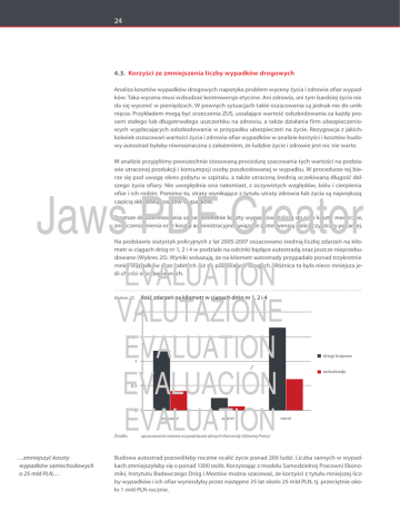 24 4.3. Korzyści ze zmniejszenia liczby wypadków drogowych Analiza kosztów wypadków drogowych napotyka problem wyceny życia i zdrowia ofiar wypadków. Taka wycena musi wzbudzać kontrowersje etyczne. Ani zdrowia, ani tym bardziej życia nie da się wycenić w pieniądzach. W pewnych sytuacjach takie oszacowania są jednak nie do uniknięcia. Przykładem mogą być orzeczenia ZUS, ustalające wartość odszkodowania za każdy procent stałego lub długotrwałego uszczerbku na zdrowiu, a także działania firm ubezpieczeniowych wypłacających odszkodowania w przypadku ubezpieczeń na życie. Rezygnacja z jakichkolwiek oszacowań wartości życia i zdrowia ofiar wypadków w analizie korzyści i kosztów budowy autostrad byłaby równoznaczna z założeniem, że ludzkie życie i zdrowie jest nic nie warte. W analizie przyjęliśmy powszechnie stosowaną procedurę szacowania tych wartości na podstawie utraconej produkcji i konsumpcji osoby poszkodowanej w wypadku. W procedurze tej bierze się pod uwagę okres pobytu w szpitalu, a także utraconą średnią oczekiwaną długość dalszego życia ofiary. Nie uwzględnia ona natomiast, z oczywistych względów, bólu i cierpienia ofiar i ich rodzin. Pomimo to, straty wynikające z tytułu utraty zdrowia lub życia są największą częścią składową kosztów wypadków. Prostsze do zdefiniowania są bezpośrednie koszty wypadków. Należą do nich koszty medyczne, zniszczenia mienia oraz koszty administracyjne związane z interwencją policji czy straży pożarnej. Na podstawie statystyk policyjnych z lat 2005-2007 oszacowano średnią liczbę zdarzeń na kilometr w ciągach dróg nr 1, 2 i 4 w podziale na odcinki będące autostradą oraz jeszcze nieprzebudowane (Wykres 25). Wyniki wskazują, że na kilometr autostrady przypadało ponad trzykrotnie mniej wypadków oraz zabitych niż na pozostałych drogach. Różnica ta była nieco mniejsza jeśli chodzi o liczbę rannych. …zmniejszyć koszty wypadków samochodowych o 25 mld PLN,… Wykres 25. Ilość zdarzeń na kilometr w ciągach dróg nr 1, 2 i 4 Źródło: opracowanie własne na podstawie danych Komendy Głównej Policji Budowa autostrad pozwoliłaby rocznie ocalić życie ponad 200 ludzi. Liczba rannych w wypadkach zmniejszyłaby się o ponad 1300 osób. Korzystając z modelu Samodzielnej Pracowni Ekonomiki, Instytutu Badawczego Dróg i Mostów można szacować, że korzyści z tytułu mniejszej liczby wypadków i ich ofiar wyniosłyby przez następne 25 lat około 25 mld PLN, tj. przeciętnie około 1 mld PLN rocznie. Którędy droga – Raport o tym, jak odblokować inwestycje drogowe w Polsce Wykres 26. 25 Koszty wypadków drogowych i ofiar w mld PLN w okresie analizy Ramka 1 – Bezpieczeństwo na jednojezdniowych drogach ekspresowych W ramach oszczędności buduje się niekiedy drogi ekspresowe jednojezdniowe z jednym pasem ruchu w każdym kierunku. W ten sposób powstały obwodnice Kielc czy Torunia. Takie rozwiązania nie powodują jednak poprawy bezpieczeństwa na drogach. Jak wynika z badań11 przeprowadzonych w Unii Europejskiej, jednojezdniowa droga ekspresowa jest jednym z najniebezpieczniejszych rodzajów dróg (Wykres 27). Wykres 27. Ilość wypadków dla poszczególnych kategorii dróg Źródło: opracowanie własne na podstawie Jaspers, Niebieska Księga Zarówno liczba wypadków śmiertelnych, jak i ciężkich na drogach ekspresowych jednojezdniowych ponad dwukrotnie przewyższa wartość tej statystyki dla pozostałych dróg ekspresowych. Przy wypadkach śmiertelnych drogi tej kategorii ustępują nawet drogom głównym jednojezdniowym ze skrzyżowaniami jednopoziomowymi. Wygląda na to, że wielu kierowcom znak drogi ekspresowej daje złudne poczucie bezpieczeństwa. 11 Niebieska księga – Infrastruktura drogowa, Jaspers, Kwiecień 2008 r. 26 4.4. Korzyści ze zmniejszenia zanieczyszczenia środowiska Koszty zanieczyszczenia środowiska to łączne koszty generowane przez wszystkich użytkowników poruszających się po drodze i obejmujące: t ujemny wpływ na zdrowie ludzkie, t straty w dobrach materialnych i w środowisku naturalnym. Podstawą ich obliczenia są jednostkowe koszty ekonomiczne (w PLN na pojazdokilometr) uzależnione przede wszystkim od prędkości i typu pojazdu. Ich oszacowania powszechnie przyjęte w analizach projektów infrastrukturalnych zaadoptowano do warunków polskich.12 …ograniczyć koszty środowiskowe o 7,2 mld PLN Oddanie dziś do użytku całej brakującej części autostrad (1150 km) sprawiłoby, że korzyści z tytułu zmniejszenia kosztów środowiskowych (przy prędkościach według IBDM) wyniosłyby przeciętnie 287 mln PLN rocznie. W całym okresie 25 lat analizy jest to ok. 7,2 mld PLN (Wykres 28), czyli ok. 6,2 mln PLN na kilometr. Wykres 28. Koszty środowiskowe w mld PLN (przez 25 lat) 12 Niebieska Księga – Infrastruktura drogowa, Jaspers, Kwiecień 2008 r. Którędy droga – Raport o tym, jak odblokować inwestycje drogowe w Polsce 27 Ramka 2 – Prędkości optymalne Tematem wzbudzającym wiele emocji jest maksymalna dozwolona prędkość na autostradach. W Polsce wynosi ona 130 km/h dla samochodów osobowych oraz 80 km/h dla większości samochodów ciężarowych i autobusów. Zwolennicy szybkiej jazdy zazwyczaj jako przykład podają Niemcy, gdzie na części autostrad nie obowiązują żadne ograniczenia prędkości. Tymczasem od kwietnia 2008 roku takie limity zaczęły obowiązywać powszechnie w pierwszym z niemieckich landów – Bremie. Maksymalna dozwolona prędkość wynosi tam 120 km/h. Władze Bremy tłumaczą swoją decyzję troską o ochronę środowiska i chęcią zmniejszenia kosztów społeczno-ekonomicznych użytkowania autostrad.13 Spostrzeżenia bremeńczyków potwierdza analiza przeprowadzona na potrzeby tego raportu. Zestawiono koszty eksploatacji pojazdów, czasu użytkowników infrastruktury drogowej oraz zanieczyszczenia środowiska dla różnych prędkości samochodów osobowych or