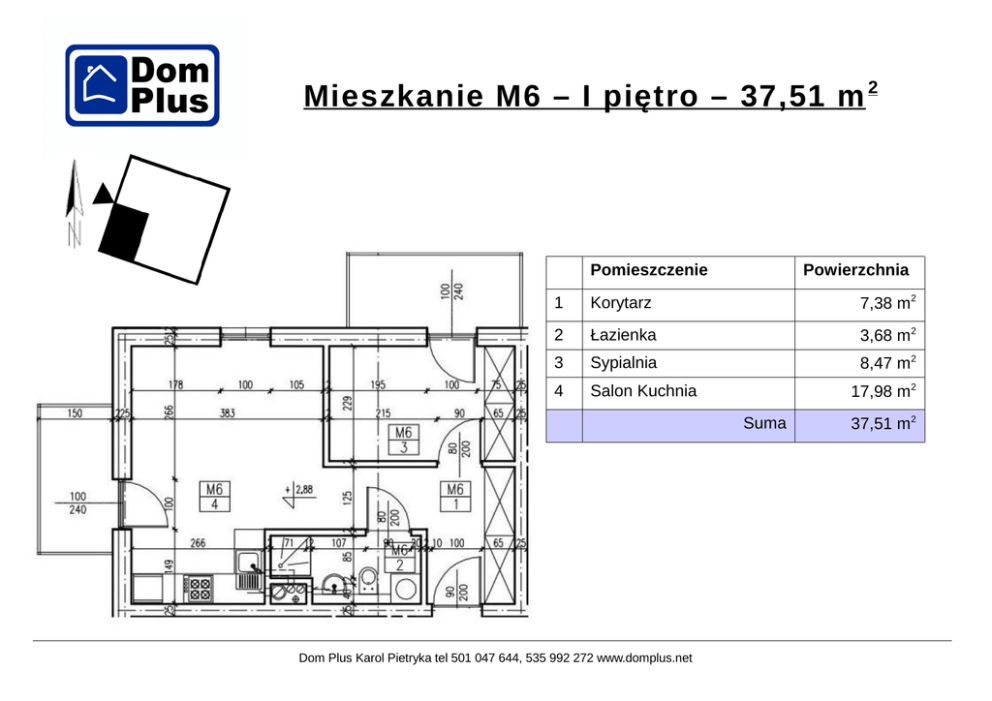 Mieszkanie M6 – I piętro – 37,51 m 2 Pomieszczenie Powierzchnia 1 Korytarz 7,38 m2 2 Łazienka 3,68 m2 3 Sypialnia 8,47 m2 4 Salon Kuchnia 17,98 m2 Suma Dom Plus Karol Pietryka tel 501 047 644, 535 992 272 www.domplus.net 37,51 m2
