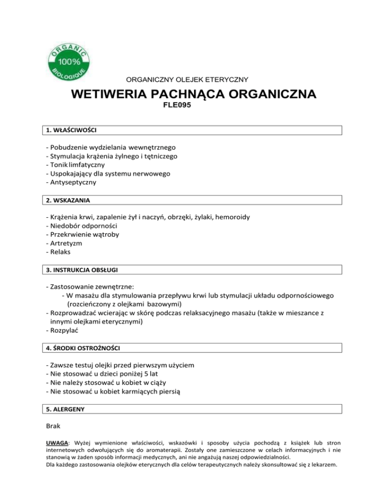 ORGANICZNY OLEJEK ETERYCZNY WETIWERIA PACHNĄCA ORGANICZNA FLE095 1. WŁAŚCIWOŚCI - Pobudzenie wydzielania wewnętrznego - Stymulacja krążenia żylnego i tętniczego - Tonik limfatyczny - Uspokajający dla systemu nerwowego - Antyseptyczny 2. WSKAZANIA - Krążenia krwi, zapalenie żył i naczyń, obrzęki, żylaki, hemoroidy - Niedobór odporności - Przekrwienie wątroby - Artretyzm - Relaks 3. INSTRUKCJA OBSŁUGI - Zastosowanie zewnętrzne: - W masażu dla stymulowania przepływu krwi lub stymulacji układu odpornościowego (rozcieńczony z olejkami bazowymi) - Rozprowadzać wcierając w skórę podczas relaksacyjnego masażu (także w mieszance z innymi olejkami eterycznymi) - Rozpylać 4. ŚRODKI OSTROŻNOŚCI - Zawsze testuj olejki przed pierwszym użyciem - Nie stosować u dzieci poniżej 5 lat - Nie należy stosować u kobiet w ciąży - Nie stosować u kobiet karmiących piersią 5. ALERGENY Brak UWAGA: Wyżej wymienione właściwości, wskazówki i sposoby użycia pochodzą z książek lub stron internetowych odwołujących się do aromaterapii. Zostały one zamieszczone w celach informacyjnych i nie stanowią w żaden sposób informacji medycznych, ani nie angażują naszej odpowiedzialności. Dla każdego zastosowania olejków eterycznych dla celów terapeutycznych należy skonsultować się z lekarzem.