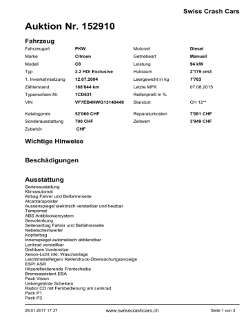 Swiss Crash Cars Auktion Nr. 152910 Fahrzeug Fahrzeugart PKW Motorart Diesel Marke Citroen Getriebeart Manuell Modell C8 Leistung 94 kW Typ 2.2 HDi Exclusive Hubraum 2'179 cm3 1. Inverkehrsetzung 12.07.2004 Leergewicht in kg 1'783 Zählerstand 168'844 km Letzte MFK 07.08.2015 Typenschein-Nr. 1CD631 Reifenprofil in % VIN VF7EB4HWG13148449 Standort CH 12** Katalogpreis 52'060 CHF Reparaturkosten 7'081 CHF Sonderausstattung 700 CHF Zeitwert 3'949 CHF Zubehör CHF Wichtige Hinweise Beschädigungen Ausstattung Serienaustattung Klimaautomat Airbag Fahrer und Beifahrerseite Alcantarapolster Aussenspiegel elektrisch verstellbar und heizbar Tempomat ABS Antiblockiersystem Servolenkung Seitenairbag Fahrer und Beifahrerseite Nebelscheinwerfer Kopfairbag Innenspiegel automatisch abblendbar Lenkrad verstellbar Drehbare Vordersitze Xenon-Licht inkl. Waschanlage Leichtmetallfelgen/ Reifendruck-Überwachungsanzeige ESP/ ASR Hitzereflektierende Frontscheibe Bremsassistent EBA Pack Vision Uebergetönte Scheiben Radio/ CD mit Fernbedienung am Lenkrad Pack P1 Pack P3 28.01.2017 17.37 www.swisscrashcars.ch Seite 1 von 3 Auktion Nr. 152910 Swiss Crash Cars Ausstattung Pack P4 Elektrische Schiebetüre Dachreling/ Fixierungsschienen Pack P6 Dieselpartikelfilter Keine Gewähr auf die Angaben der Serienausstattungen Sonderausstattung Metallic-Lackierung Fotos 28.01.2017 17.37 www.swisscrashcars.ch Seite 2 von 3 Auktion Nr. 152910 28.01.2017 17.37 Swiss Crash Cars www.swisscrashcars.ch Seite 3 von 3