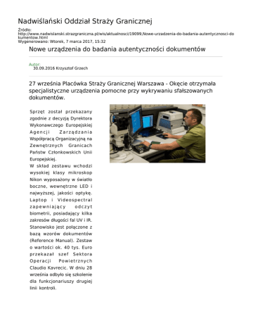 Nadwiślański Oddział Straży Granicznej Źródło: http://www.nadwislanski.strazgraniczna.pl/wis/aktualnosci/19099,Nowe-urzadzenia-do-badania-autentycznosci-do kumentow.html Wygenerowano: Wtorek, 7 marca 2017, 15:32 Nowe urządzenia do badania autentyczności dokumentów Autor: 30.09.2016 Krzysztof Grzech 27 września Placówka Straży Granicznej Warszawa - Okęcie otrzymała specjalistyczne urządzenia pomocne przy wykrywaniu sfałszowanych dokumentów. Sprzęt został przekazany zgodnie z decyzją Dyrektora Wykonawczego Europejskiej Agencji Zarządzania Współpracą Organizacyjną na Zewnętrznych Granicach Państw Członkowskich Unii Europejskiej. W skład zestawu wchodzi wysokiej klasy mikroskop Nikon wyposażony w światło boczne, wewnętrzne LED i najwyższej, jakości optykę. Laptop i Videospectral zapewniający odczyt biometrii, posiadający kilka zakresów długości fal UV i IR. Stanowisko jest połączone z bazą wzorów dokumentów (Reference Manual). Zestaw o wartości ok. 40 tys. Euro przekazał szef Sektora Operacji Powietrznych Claudio Kavrecic. W dniu 28 września odbyło się szkolenie dla funkcjonariuszy drugiej linii kontroli.