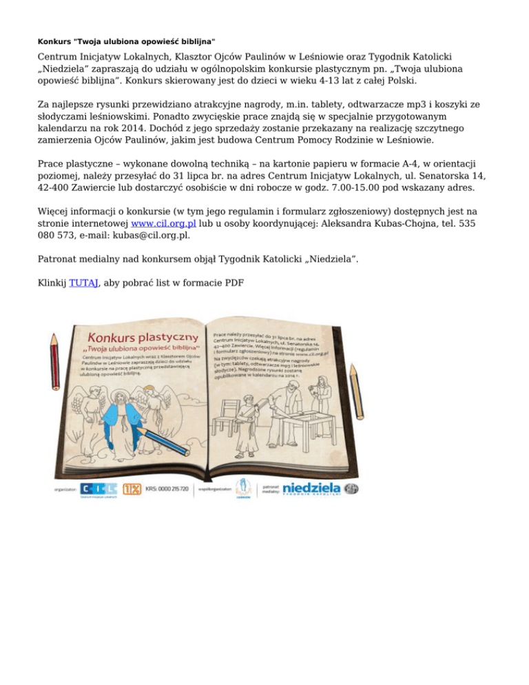 Konkurs "Twoja ulubiona opowieść biblijna" Centrum Inicjatyw Lokalnych, Klasztor Ojców Paulinów w Leśniowie oraz Tygodnik Katolicki „Niedziela” zapraszają do udziału w ogólnopolskim konkursie plastycznym pn. „Twoja ulubiona opowieść biblijna”. Konkurs skierowany jest do dzieci w wieku 4-13 lat z całej Polski. Za najlepsze rysunki przewidziano atrakcyjne nagrody, m.in. tablety, odtwarzacze mp3 i koszyki ze słodyczami leśniowskimi. Ponadto zwycięskie prace znajdą się w specjalnie przygotowanym kalendarzu na rok 2014. Dochód z jego sprzedaży zostanie przekazany na realizację szczytnego zamierzenia Ojców Paulinów, jakim jest budowa Centrum Pomocy Rodzinie w Leśniowie. Prace plastyczne – wykonane dowolną techniką – na kartonie papieru w formacie A-4, w orientacji poziomej, należy przesyłać do 31 lipca br. na adres Centrum Inicjatyw Lokalnych, ul. Senatorska 14, 42-400 Zawiercie lub dostarczyć osobiście w dni robocze w godz. 7.00-15.00 pod wskazany adres. Więcej informacji o konkursie (w tym jego regulamin i formularz zgłoszeniowy) dostępnych jest na stronie internetowej www.cil.org.pl lub u osoby koordynującej: Aleksandra Kubas-Chojna, tel. 535 080 573, e-mail: [email protected]. Patronat medialny nad konkursem objął Tygodnik Katolicki „Niedziela”. Klinkij TUTAJ, aby pobrać list w formacie PDF