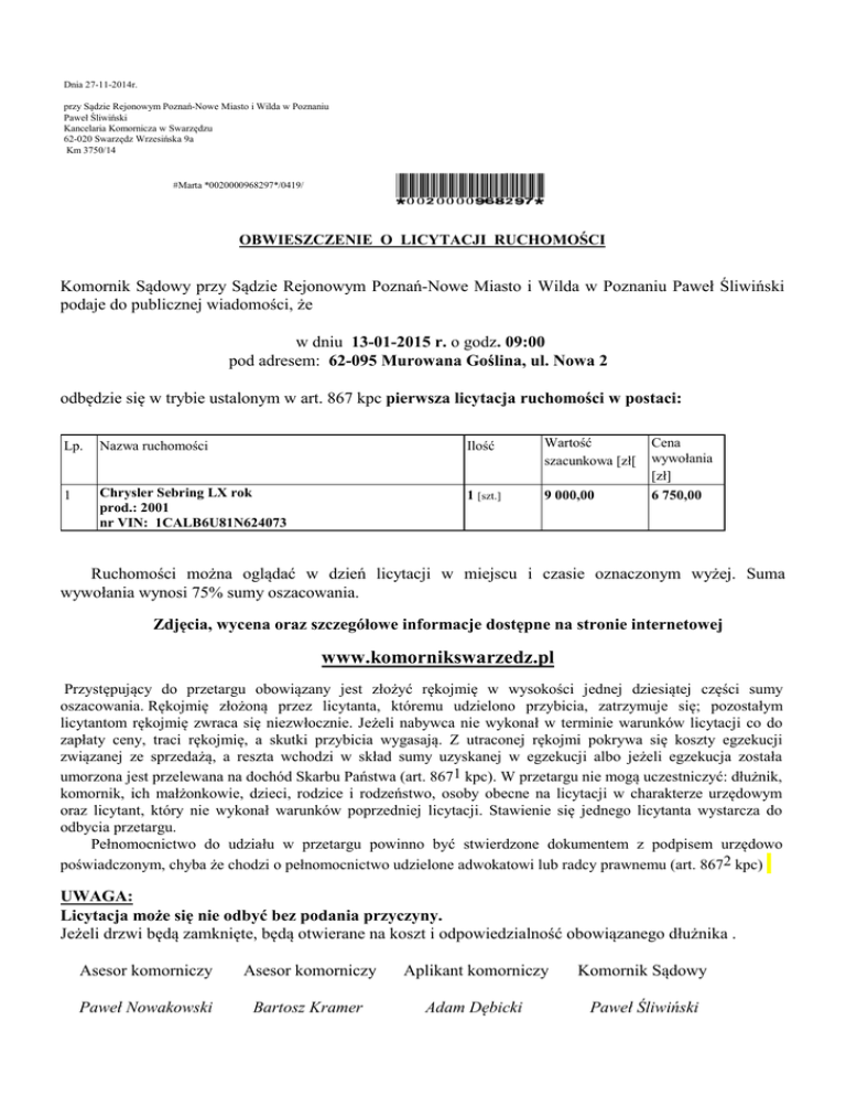 Dnia 27-11-2014r. przy Sądzie Rejonowym Poznań-Nowe Miasto i Wilda w Poznaniu Paweł Śliwiński Kancelaria Komornicza w Swarzędzu 62-020 Swarzędz Wrzesińska 9a Km 3750/14 *0020000968297* #Marta *0020000968297*/0419/ OBWIESZCZENIE O LICYTACJI RUCHOMOŚCI Komornik Sądowy przy Sądzie Rejonowym Poznań-Nowe Miasto i Wilda w Poznaniu Paweł Śliwiński podaje do publicznej wiadomości, że w dniu 13-01-2015 r. o godz. 09:00 pod adresem: 62-095 Murowana Goślina, ul. Nowa 2 odbędzie się w trybie ustalonym w art. 867 kpc pierwsza licytacja ruchomości w postaci: Lp. Nazwa ruchomości Ilość Wartość szacunkowa [zł[ 1 Chrysler Sebring LX rok prod.: 2001 nr VIN: 1CALB6U81N624073 1 [szt.] 9 000,00 Cena wywołania [zł] 6 750,00 Ruchomości można oglądać w dzień licytacji w miejscu i czasie oznaczonym wyżej. Suma wywołania wynosi 75% sumy oszacowania. Zdjęcia, wycena oraz szczegółowe informacje dostępne na stronie internetowej www.komornikswarzedz.pl Przystępujący do przetargu obowiązany jest złożyć rękojmię w wysokości jednej dziesiątej części sumy oszacowania. Rękojmię złożoną przez licytanta, któremu udzielono przybicia, zatrzymuje się; pozostałym licytantom rękojmię zwraca się niezwłocznie. Jeżeli nabywca nie wykonał w terminie warunków licytacji co do zapłaty ceny, traci rękojmię, a skutki przybicia wygasają. Z utraconej rękojmi pokrywa się koszty egzekucji związanej ze sprzedażą, a reszta wchodzi w skład sumy uzyskanej w egzekucji albo jeżeli egzekucja została umorzona jest przelewana na dochód Skarbu Państwa (art. 8671 kpc). W przetargu nie mogą uczestniczyć: dłużnik, komornik, ich małżonkowie, dzieci, rodzice i rodzeństwo, osoby obecne na licytacji w charakterze urzędowym oraz licytant, który nie wykonał warunków poprzedniej licytacji. Stawienie się jednego licytanta wystarcza do odbycia przetargu. Pełnomocnictwo do udziału w przetargu powinno być stwierdzone dokumentem z podpisem urzędowo poświadczonym, chyba że chodzi o pełnomocnictwo udzielone adwokatowi lub radcy prawnemu (art. 8672 kpc) UWAGA: Licytacja może się nie odbyć bez podania przyczyny. Jeżeli drzwi będą zamknięte, będą otwierane na koszt i odpowiedzialność obowiązanego dłużnika . Asesor komorniczy Asesor komorniczy Aplikant komorniczy Komornik Sądowy Paweł Nowakowski Bartosz Kramer Adam Dębicki Paweł Śliwiński