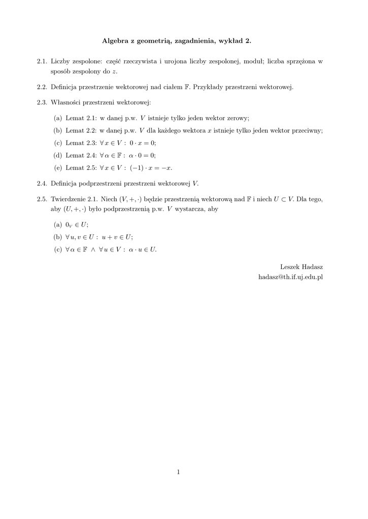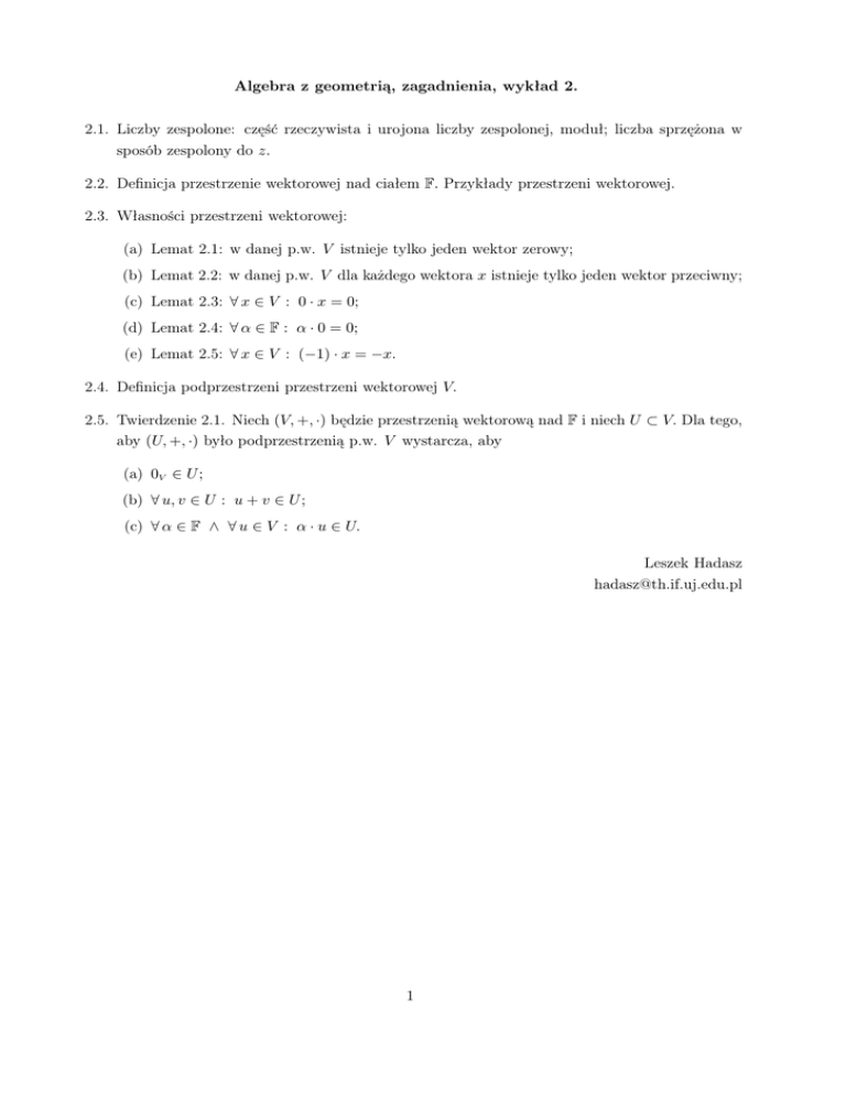 Algebra z geometrią, zagadnienia, wykład 2. 2.1. Liczby zespolone: część rzeczywista i urojona liczby zespolonej, moduł; liczba sprzężona w sposób zespolony do z. 2.2. Definicja przestrzenie wektorowej nad ciałem F. Przykłady przestrzeni wektorowej. 2.3. Własności przestrzeni wektorowej: (a) Lemat 2.1: w danej p.w. V istnieje tylko jeden wektor zerowy; (b) Lemat 2.2: w danej p.w. V dla każdego wektora x istnieje tylko jeden wektor przeciwny; (c) Lemat 2.3: ∀ x ∈ V : 0 · x = 0; (d) Lemat 2.4: ∀ α ∈ F : α · 0 = 0; (e) Lemat 2.5: ∀ x ∈ V : (−1) · x = −x. 2.4. Definicja podprzestrzeni przestrzeni wektorowej V. 2.5. Twierdzenie 2.1. Niech (V, +, ·) będzie przestrzenią wektorową nad F i niech U ⊂ V. Dla tego, aby (U, +, ·) było podprzestrzenią p.w. V wystarcza, aby (a) 0V ∈ U ; (b) ∀ u, v ∈ U : u + v ∈ U ; (c) ∀ α ∈ F ∧ ∀ u ∈ V : α · u ∈ U. Leszek Hadasz [email protected] 1