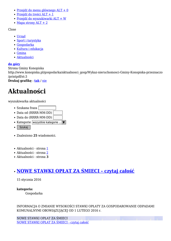 Przejdź do menu głównego ALT + 0 Przejdź do treści ALT + 1 Przejdź do wyszukiwarki ALT + W Mapa strony ALT + 2 Close Urząd Sport i turystyka Gospodarka Kultura i edukacja Gmina Aktualności do góry Strona Gminy Konopiska http://www.konopiska.pl/gospodarka/aktualnosci_gosp/Wykaz-nieruchomosci-Gminy-Konopiska-przeznaczo /printpdf/st:3 Drukuj grafikę : tak / nie Aktualności wyszukiwarka aktualności Szukana fraza Data od (RRRR-MM-DD) Data do (RRRR-MM-DD) Kategorie wszystkie kategorie ... ▼ Szukaj Znaleziono 25 wiadomości. Aktualności - strona 1 Aktualności - strona 2 Aktualności - strona 3 NOWE STAWKI OPŁAT ZA ŚMIECI - czytaj całość 15 stycznia 2016 kategoria: Gospodarka INFORMACJA O ZMIANIE WYSOKOŚCI STAWKI OPŁATY ZA GOSPODAROWANIE ODPADAMI KOMUNALNYMI OBOWIĄZUJĄCEJ OD 1 LUTEGO 2016 r. NOWE STAWKI OPŁAT ZA ŚMIECI NOWE STAWKI OPŁAT ZA ŚMIECI - czytaj całość Ogłoszenie o przetargu - czytaj całość 13 listopada 2015 kategoria: Gospodarka Wójt Gminy Konopiska ogłasza pierwszy ustny przetarg nieograniczony na wynajem, na czas nieokreślony lokali użytkowych położonych w Konopiskach, przy ul. Sportowej 1. Budynek posadowiony jest na działce geodezyjnej nr 1519 zapisanej w Księdze Wieczystej Sądu Rejonowego w Częstochowie pod numerem 61329. Ogłoszenie o przetargu Ogłoszenie o przetargu - czytaj całość Ogłoszenie o przetargu - czytaj całość 13 listopada 2015 kategoria: Gospodarka Wójt Gminy Konopiska ogłasza przetarg nieograniczony na sprzedaż nieruchomości stanowiącej własność Gminy Konopiska przeznaczonej w planie zagospodarowania przestrzennego gminy pod zabudowę mieszkaniową. Ogłoszenie o przetargu Ogłoszenie o przetargu - czytaj całość Obwieszczenie - czytaj całość 04 listopada 2015 kategoria: Gospodarka GR.6733.4.2015 Konopiska 03.11.2015r. Obwieszczenie Obwieszczenie - czytaj całość Plan gospodarki nisko emisyjnej dla Gminy Konopiska (PGN) - czytaj całość 05 października 2015 kategoria: Gospodarka W dniu 17.08.2015 r. w Katowicach zawarto umowę pomiędzy Wojewódzkim Funduszem Ochrony Środowiska i Gospodarki Wodnej w Katowicach a Gminą Konopiska na dofinansowywanie zadania pod nazwą: Plan gospodarki niskoemisyjnej dla Gminy Konopiska (PGN). Opracowanie planu zostało zlecone firmie Energia Oze Sp. z o. o. Plan gospodarki nisko emisyjnej dla Gminy Konopisk Plan gospodarki nisko emisyjnej dla Gminy Konopiska (PGN) - czytaj całość Aktualności - strona 1 Aktualności - strona 2 Aktualności - strona 3