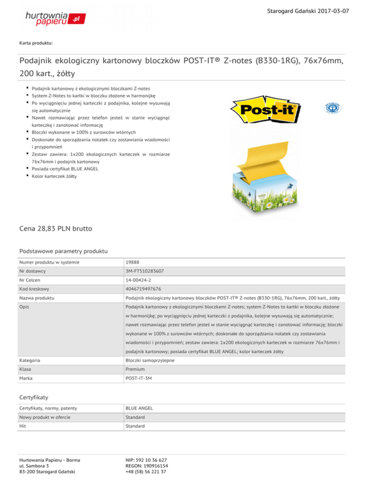 Starogard Gdański 2017-03-07 Karta produktu: Podajnik ekologiczny kartonowy bloczków POST-IT® Z-notes (B330-1RG), 76x76mm, 200 kart., żółty Podajnik kartonowy z ekologicznymi bloczkami Z-notes System Z-Notes to kartki w bloczku złożone w harmonijkę Po wyciągnięciu jednej karteczki z podajnika, kolejne wysuwają się automatycznie Nawet rozmawiając przez telefon jesteś w stanie wyciągnąć karteczkę i zanotować informację Bloczki wykonane w 100% z surowców wtórnych Doskonałe do sporządzania notatek czy zostawiania wiadomości i przypomnień Zestaw zawiera: 1x200 ekologicznych karteczek w rozmiarze 76x76mm i podajnik kartonowy Posiada certyfikat BLUE ANGEL Kolor karteczek żółty Cena 28,83 PLN brutto Podstawowe parametry produktu Numer produktu w systemie 19888 Nr dostawcy 3M-FT510283607 Nr Celcen 14-00424-2 Kod kreskowy 4046719497676 Nazwa produktu Podajnik ekologiczny kartonowy bloczków POST-IT® Z-notes (B330-1RG), 76x76mm, 200 kart., żółty Opis Podajnik kartonowy z ekologicznymi bloczkami Z-notes; system Z-Notes to kartki w bloczku złożone w harmonijkę; po wyciągnięciu jednej karteczki z podajnika, kolejne wysuwają się automatycznie; nawet rozmawiając przez telefon jesteś w stanie wyciągnąć karteczkę i zanotować informację; bloczki wykonane w 100% z surowców wtórnych; doskonałe do sporządzania notatek czy zostawiania wiadomości i przypomnień; zestaw zawiera: 1x200 ekologicznych karteczek w rozmiarze 76x76mm i podajnik kartonowy; posiada certyfikat BLUE ANGEL; kolor karteczek żółty Kategoria Bloczki samoprzylepne Klasa Premium Marka POST-IT-3M Certyfikaty Certyfikaty, normy, patenty BLUE ANGEL Nowy produkt w ofercie Standard Hit Standard Hurtowania Papieru - Borma ul. Sambora 3 83-200 Starogard Gdański NIP: 592 10 36 627 REGON: 190916154 +48 (58) 56 221 37 Starogard Gdański 2017-03-07 Karta katalogowa produktu cd. Podajnik ekologiczny kartonowy bloczków POST-IT® Z-notes (B330-1RG), 76x76mm, 200 kart., żółty Cecha W ofercie od 2014-02 Typ Kartonowy Produkt Podajnik Rodzaj Ekologiczny Kształt B.d. Ekologiczność 100% Materiał Papier Wymiary Pojemność (mm) B.d. Rozmiar B.d. Szerokość (mm) B.d. Grubość (mm) B.d. Gramatura (g/m2) B.d. Wymiary (mm) 76x76 Wspólny słownik zamówień CPV 22816300-6 Bloczki samoprzylepnych karteczek na notatki Kolor Kolor Żółty Ilość Ilość kartek 200 Pozostałe zdjęcia produktu Serdecznie zapraszamy do współpracy Hurtowania Papieru - Borma zespół. Hurtowania Papieru - Borma ul. Sambora 3 83-200 Starogard Gdański NIP: 592 10 36 627 REGON: 190916154 +48 (58) 56 221 37