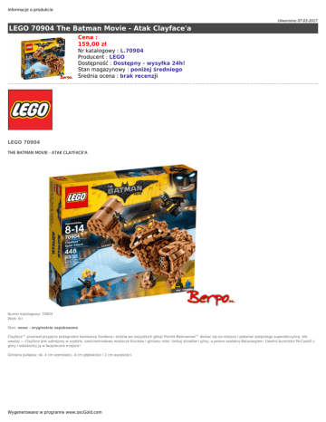 Informacje o produkcie Utworzono 07-03-2017 LEGO 70904 The Batman Movie - Atak Clayface'a Cena : 159,00 zł Nr katalogowy : L.70904 Producent : LEGO Dostępność : Dostępny - wysyłka 24h! Stan magazynowy : poniżej średniego Średnia ocena : brak recenzji LEGO 70904 THE BATMAN MOVIE - ATAK CLAYFACE'A Numer katalogowy: 70904 Wiek: 8+ Stan: nowe - oryginalnie zapakowane Clayface™ przerwał przyjęcie pożegnalne komisarza Gordona i strzela we wszystkich gliną! Pomóż Batmanowi™ dostać się na miejsce i pokonać potężnego superzłoczyńcę. Ale uważaj — Clayface jest uzbrojony w szybkie, sześciostrzałowe miotacze klocków i gliniany młot. Unikaj strzałów i gliny, a potem zaatakuj Batarangiem. Uwolnij burmistrz McCaskill z gliny i odeskortuj ją w bezpieczne miejsce! Gliniana pułapka: ok. 4 cm szerokości, 4 cm głębokości i 2 cm wysokości. Wygenerowano w programie www.oscGold.com Informacje o produkcie Wygenerowano w programie www.oscGold.com Dostępność w salonach: Ilość: Sklep - Złotniki: 3 Sklep - zlikwidowany: 0 Sklep - Szczepankowo: 1 Dostępne opcje LEGO 70904 The Batman Movie - Atak Clayface'a » Wiek: 8 - 11 lat, 12 lat i więcej.
