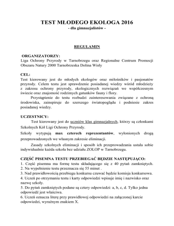 TEST MŁODEGO EKOLOGA 2016 - dla gimnazjalistów - REGULAMIN ORGANIZATORZY: Liga Ochrony Przyrody w Tarnobrzegu oraz Regionalne Centrum Promocji Obszaru Natury 2000 Tarnobrzeska Dolina Wisły CEL: Test kierowany jest do młodych ekologów oraz miłośników i pasjonatów przyrody. Celem testu jest sprawdzenie posiadanej wiedzy wśród młodzieży z zakresu ochrony przyrody, ekologicznych rozwiązań we współczesnym świecie oraz znajomość rodzimych gatunków fauny i flory. Przystąpienie do testu rozbudzi zainteresowania związane z ochroną środowiska, zainspiruje do szerszego światopoglądu i podniesie zakres posiadanej wiedzy. UCZESTNICY: Test kierowany jest do uczniów klas gimnazjalnych, którzy są członkami Szkolnych Kół Ligi Ochrony Przyrody. Szkoły wytypują max czterech reprezentantów, wyłonionych drogą przeprowadzonych we własnym zakresie eliminacji. Zasady szkolnych eliminacji i sposób ich przeprowadzania ustala sobie indywidualnie każda szkoła bez udziału ZOLOP w Tarnobrzegu. CZĘŚĆ PISEMNA TESTU PRZEBIEGAĆ BĘDZIE NASTĘPUJĄCO: 1. Część pisemna ma formę testu składającego się z 40 pytań zamkniętych. 2. Na wypełnienie testu przeznacza się 55 minut . 3. Nad prawidłowością przebiegu konkursu czuwać będzie komisja konkursowa. 4. Uczeń po otrzymaniu testu i karty odpowiedzi wpisuje imię i nazwisko oraz nazwę szkoły. 5. Do pytań zamkniętych podane są cztery odpowiedzi: a, b, c, d. Tylko jedna odpowiedź jest właściwa. 6. Uczeń oznacza literę przy prawidłowej odpowiedzi na załączonej karcie odpowiedzi, wyraźnym znakiem X. 7. W przypadku pomyłki, błędne zaznaczenie otacza kółkiem i zaznacza znakiem X inną odpowiedź. Postawienie znaku X przy dwóch odpowiedziach (nawet, jeśli wśród nich znajduje się właściwa odpowiedź) traktuje się jako odpowiedź niepoprawną. 8. Po upływie czasu przeznaczonego na wypełnienie testu konkursowego następuje ogłoszenie zakończenia przebiegu konkursu i zebranie prac. 9. Maksymalna ilość punktów do zdobycia to 40. Pytania w teście dotyczyć będą wiedzy ogólnej z zakresu ochrony przyrody w Polsce i Unii Europejskiej oraz z podstawy programowej przewidzianej dla klas gimnazjalnych. BIBLIOGRAFIA: - Przyroda Polska, miesięczniki Ligi Ochrony Przyrody. Nr od czerwca 2015 r. do kwietnia 2016r. - Zagadki przyrodnicze, 1400 pytań i odpowiedzi, Don Conroy / Chris Wilson. Warszawa 2003r. - Zagadnienia związane z obszarami Natura 2000 a w szczególności Tarnobrzeska Dolina Wisły oraz Puszcza Sandomierska. - www.lop.tarnobrzeg.pl - www.natura.tarnobrzeg.pl TERMINY: Zgłoszenia uczniów do testu odbywać się będą na formularzu wg. wzoru w załączniku. Zgłoszenia na formularzu należy przesyłać listownie na adres: Liga Ochrony Przyrody w Tarnobrzegu, ul. Moniuszki 16, 39-400 Tarnobrzeg z dopiskiem TEST MŁODEGO EKOLOGA lub za pomocą poczty elektronicznej na adres [email protected] Graniczny termin przeprowadzenia szkolnych eliminacji i przesłania formularza zgłoszeniowego mija 20 maja 2016r. Po tym terminie każda szkoła otrzyma informację o miejscu i terminie przeprowadzenia Testu Młodego Ekologa. Informacja podana będzie również na stronie internetowej www.lop.tarnobrzeg.pl Test odbędzie się w Tarnobrzegu na przełomie maja/czerwca br. NAGRODY: Rozstrzygnięcie i podsumowanie nastąpi tego samego dnia w siedzibie Regionalnego Centrum Promocji Obszaru Natura 2000 Tarnobrzeska Dolina Wisły przy ul. Sandomierskiej 27 (Zamek Dzikowski w Tarnobrzegu) po zakończeniu testu i sprawdzeniu przez komisję. Laureaci konkursu, którzy zdobędą największą ilość punktów otrzymają nagrody rzeczowe oraz dyplomy. Wszyscy uczestnicy za udział w teście otrzymają pamiątkowe dyplomy. Informacje o przeprowadzonym Teście Młodego Ekologa oraz o jego laureatach będą podane do lokalnych mediów oraz na stronę internetową www.lop.tarnobrzeg.pl ZAPRASZAMY DO UDZIAŁU