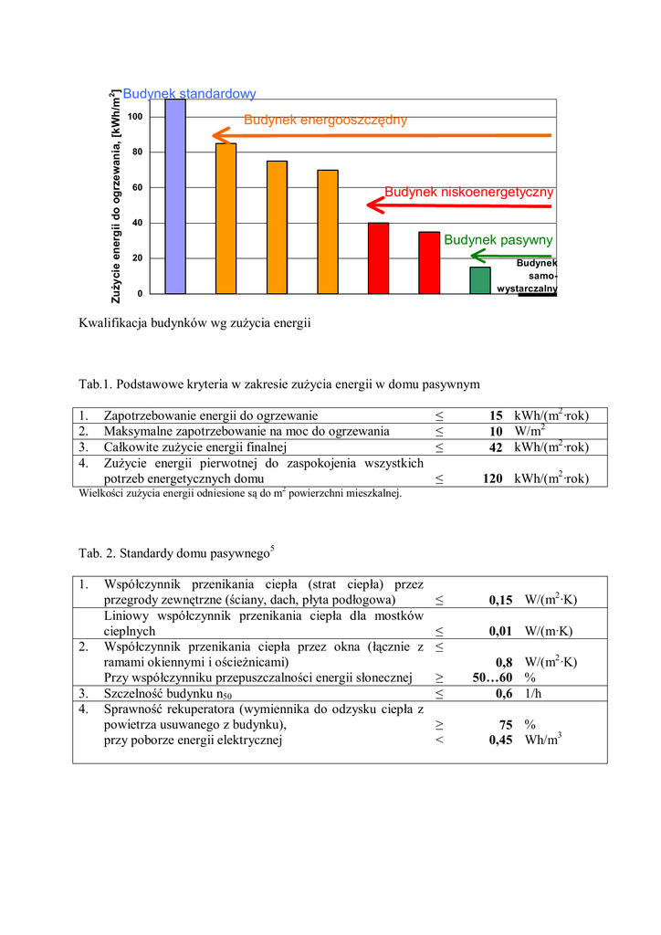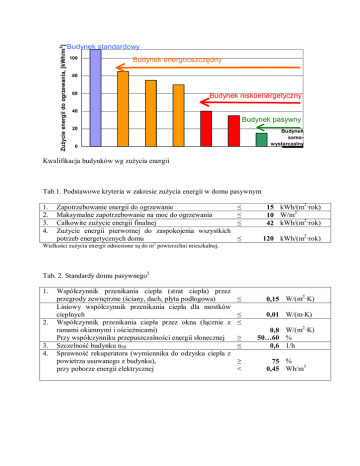 Zużycie energii do ogrzewania, [kWh/m 2] Budynek standardowy 100 Budynek energooszczędny 80 60 Budynek niskoenergetyczny 40 Budynek pasywny 20 Budynek samowystarczalny 0 Kwalifikacja budynków wg zużycia energii Tab.1. Podstawowe kryteria w zakresie zużycia energii w domu pasywnym 1. 2. 3. 4. Zapotrzebowanie energii do ogrzewanie Maksymalne zapotrzebowanie na moc do ogrzewania Całkowite zużycie energii finalnej Zużycie energii pierwotnej do zaspokojenia wszystkich potrzeb energetycznych domu ≤ ≤ ≤ 15 kWh/(m2·rok) 10 W/m2 42 kWh/(m2·rok) ≤ 120 kWh/(m2·rok) ≤ 0,15 W/(m2·K) ≤ ≤ 0,01 W/(m·K) 2 Wielkości zużycia energii odniesione są do m powierzchni mieszkalnej. Tab. 2. Standardy domu pasywnego5 1. 2. 3. 4. Współczynnik przenikania ciepła (strat ciepła) przez przegrody zewnętrzne (ściany, dach, płyta podłogowa) Liniowy współczynnik przenikania ciepła dla mostków cieplnych Współczynnik przenikania ciepła przez okna (łącznie z ramami okiennymi i ościeżnicami) Przy współczynniku przepuszczalności energii słonecznej Szczelność budynku n50 Sprawność rekuperatora (wymiennika do odzysku ciepła z powietrza usuwanego z budynku), przy poborze energii elektrycznej ≥ ≤ 0,8 W/(m2·K) 50…60 % 0,6 1/h ≥ < 75 % 0,45 Wh/m3