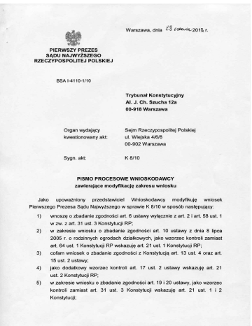 Warszawa, dnia ^ CWusC^2Q1Ł r. PIERWSZY PREZES SĄDU NAJWYŻSZEGO RZECZYPOSPOLITEJ POLSKIEJ BSA 1-4110-1/10 Trybunał Konstytucyjny Al. J. Ch. Szucha 12a 00-918 Warszawa Organ wydający kwestionowany akt: Sejm Rzeczypospolitej Polskiej ul. Wiejska 4/6/8 00-902 Warszawa Sygn. akt: K8/10 PISMO PROCESOWE WNIOSKODAWCY zawierające modyfikację zakresu wniosku Jako upoważniony przedstawiciel Wnioskodawcy modyfikuję wniosek Pierwszego Prezesa Sądu Najwyższego w sprawie K 8/10 w sposób następujący: 1) wnoszę o zbadanie zgodności art. 6 ustawy wyłącznie z art. 2 i art. 58 ust. 1 w zw. z art. 31 ust. 3 Konstytucji RP; 2) w zakresie wniosku o zbadanie zgodności art. 10 ustawy z dnia 8 lipca 2005 r. o rodzinnych ogrodach działkowych, jako wzorzec kontroli zamiast art. 64 ust. 1 Konstytucji RP wskazuję art. 21 ust. 1 Konstytucji RP; 3) cofam wniosek o zbadanie zgodności z Konstytucją art. 13 ust. 4 oraz art. 15 ust. 2 ustawy; 4) jako dodatkowy wzorzec kontroli art. 17 ust. 2 ustawy wskazuję art. 21 ust. 2 Konstytucji RP; 5) w zakresie wniosku o zbadanie zgodności art. 19 i 20 ustawy, jako wzorzec kontroli zamiast art. 31 ust. 3 Konstytucji wskazuję art. 21 ust. 1 i 2 Konstytucji; 2 6) w zakresie art. 24 ustawy, dodatkowo wnoszę o zbadanie jego zgodności z art. 21 ust. 2 Konstytucji, a także precyzuję, że do wzorców kontroli należy art. 167 ust. 1 i 4 Konstytucji RP; 7) w zakresie art. 30 ustawy precyzuję, iż przedmiotem kontroli konstytucyjności jest wyłącznie ust. 1 tego przepisu; 8) w zakresie art. 31 ust. 1 ustawy podtrzymuję wniosek o zbadanie jego zgodności wyłącznie z art. 58 ust. 1 Konstytucji RP; 9) cofam w całości wniosek o zbadanie zgodności art. 31 ust. 2, 3 i 4 ww. ustawy z Konstytucją RP. Uzasadnienie Wnioskodawca ogranicza wniosek o kontrolę konstytucyjności w zakresie art. 6 oraz art. 31 ust. 1 kwestionowanej ustawy w zakresie wskazanych pierwotnie wzorców kontroli, natomiast cofa w całości wniosek o zbadanie zgodności z konstytucją: art. 13 ust. 4, art. 15 ust. 2 i art. 31 ust. 2, 3 i 4 ustawy o rodzinnych ogrodach działkowych. W zakresie pozostałych wskazanych w piśmie przepisów ustawy, Wnioskodawca wywodzi co następuje. Artykuł 6 ustawy zawiera nie tylko definicję rodzinnego ogrodu działkowego. Stanowiąc bowiem, że ROD stanowi wydzielony obszar gruntu „będący we władaniu Polskiego Związku Działkowców", już z góry narzuca reżim prawny użytkowania gruntów ROD. W świetle dalszych przepisów ustawy: art. 13 ust. 1 ustawy, art. 15 ust. 1 ustawy, art. 25 ust. 1 w zw. z art. 27 ust. 3 i art. 28 ust. 1 pkt 1 ustawy, staje się oczywiste, że nikt oprócz PZD nie może ani utworzyć, ani prowadzić rodzinnego ogrodu działkowego. ROD jako podstawowa jednostka organizacyjna PZD nie ma sam praw do ogrodu, nie stanowi samodzielnej korporacji i nie może funkcjonować niezależnie od samego Związku. I to nie jest, jak twierdzi Sejm, kwestia obojętna konstytucyjnie. Tych, którzy uważają, że przecież można tworzyć i prowadzić ogród nierodzinny, zapytałbym: czy byłoby to prawidłowe, gdyby w Polsce utworzono jedną, ogólnopolską spółdzielnię mieszkaniową, przekazując jej nieodpłatnie wszystkie grunty pod istniejącymi budynkami mieszkalnymi, zobowiązując członkostwa oraz zakazując jej podziału? Brak możliwości lokatorów do autonomicznego funkcjonowania ogrodów, ich przechodzenia w zarząd zrzeszeń innych niż Związek, to nie jest luka czy też zwykłe zaniechanie, ale pominięcie prawodawcze, gdyż taka regulacja jest konieczna do faktycznego zrealizowania swobody zrzeszania się. Świadczy o tym orzecznictwo Trybunału, w tym zwłaszcza tezy wyroków: sygn. K 3 5/01 oraz K 42/02. Swoboda zrzeszania się to nie tylko tworzenie organizacji, przystępowanie do nich oraz możliwość wystąpienia, ale i prawo wpływu na ich los, możliwość dokonywania podziału oraz współdecydowanie o przeznaczeniu majątku, na którym członkowie korporacji mają ustanowione prawa podmiotowe. Tego, zdaniem Wnioskodawcy, wymaga zasada demokratyzmu zapisana w art. 2 oraz swoboda zrzeszania się, którą chroni art. 58 ust. 1 Konstytucji. Członkowie PZD, mimo że ogrody są tworzone ich pracą i ich wysiłkiem, nie mają gwarancji prawnych wywierania realnego wpływu na ich status prawny w organizacji, a także na jej ustrój i funkcjonowanie. Jeżeli chcą mieć działkę w ROD, muszą bezwzględnie należeć do Związku, bo innej konstrukcji nie dopuszcza art. 30 ust. 1 ustawy. Utrata członkostwa prowadzi do utraty prawa do działki prawa do działki, gdyż zgodnie z art. 14 i art. 30 ust. 1 ustawy jest ono niewątpliwie związane z członkostwem, co trafnie zauważył Trybunał m.in. w wyroku o sygn. K 14/98. To właśnie brak możliwości zachowania prawa poza strukturami Związku i jakichkolwiek przekształceń organizacyjnych ROD skutecznie gasi inicjatywę szeregowych członków. To nie wydaje się rozwiązaniem sprawiedliwym. Ustawa narusza w tym aspekcie art. 2 (zasada praw nabytych działkowca, zasada demokratyzmu, zasada zaufania obywatela do państwa i prawa), art. 21 ust. 1 i art. 64 Konstytucji. Innym, ważnym założeniem ustawy jest wyposażenie PZD w mienie, które ma pochodzić z zasobów Skarbu Państwa i jednostek samorządu. Przepisy te nadmiernie i w sposób nieuzasadniony premiują Polski Związek Działkowców. Artykuł 10 ustawy wciąż przyznaje PZD roszczenie o nabywanie nieodpłatnie prawa użytkowania oraz użytkowania wieczystego gruntów państwowych. Organizacja ta zachowuje także prawa i obowiązki nabyte przed dniem wejścia w życie ustawy (art. 39 ust. 2 ustawy). To nie jest rozwiązanie ani sprawiedliwe społecznie, ani zgodne z zasadą równości. Rzeczpospolita powinna wszystkie istniejące i potencjalnie powstające organizacje działkowców traktować równo, tzn. dać im równe szanse rozwoju. Takich szans, poza PZD, działkowcy nie mają. Nawet gdyby przyjąć, że prz