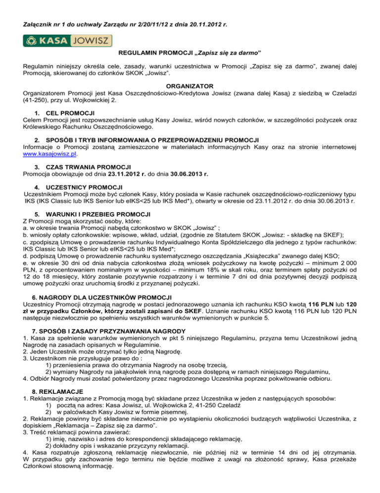 Załącznik nr 1 do uchwały Zarządu nr 2/20/11/12 z dnia 20.11.2012 r. REGULAMIN PROMOCJI „Zapisz się za darmo” Regulamin niniejszy określa cele, zasady, warunki uczestnictwa w Promocji „Zapisz się za darmo”, zwanej dalej Promocją, skierowanej do członków SKOK „Jowisz”. ORGANIZATOR Organizatorem Promocji jest Kasa Oszczędnościowo-Kredytowa Jowisz (zwana dalej Kasą) z siedzibą w Czeladzi (41-250), przy ul. Wojkowickiej 2. 1. CEL PROMOCJI Celem Promocji jest rozpowszechnianie usług Kasy Jowisz, wśród nowych członków, w szczególności pożyczek oraz Królewskiego Rachunku Oszczędnościowego. 2. SPOSÓB I TRYB INFORMOWANIA O PRZEPROWADZENIU PROMOCJI Informacje o Promocji zostaną zamieszczone w materiałach informacyjnych Kasy oraz na stronie internetowej www.kasajowisz.pl. 3. CZAS TRWANIA PROMOCJI Promocja obowiązuje od dnia 23.11.2012 r. do dnia 30.06.2013 r. 4. UCZESTNICY PROMOCJI Uczestnikiem Promocji może być członek Kasy, który posiada w Kasie rachunek oszczędnościowo-rozliczeniowy typu IKS (IKS Classic lub IKS Senior lub eIKS<25 lub IKS Med*), otwarty w okresie od 23.11.2012 r. do dnia 30.06.2013 r. 5. WARUNKI I PRZEBIEG PROMOCJI Z Promocji mogą skorzystać osoby, które: a. w okresie trwania Promocji nabędą członkostwo w SKOK „Jowisz” ; b. wniosły opłaty członkowskie: wpisowe, wkład, udział, (zgodnie ze Statutem SKOK „Jowisz: - składkę na SKEF); c. zpodpiszą Umowę o prowadzenie rachunku Indywidualnego Konta Spółdzielczego dla jednego z typów rachunków: IKS Classic lub IKS Senior lub eIKS<25 lub IKS Med*; d. podpiszą Umowę o prowadzenie rachunku systematycznego oszczędzania „Książeczka” zwanego dalej KSO; e. w okresie 30 dni od dnia nabycia członkostwa złożą wniosek pożyczkowy na kwotę pożyczki – minimum 2 000 PLN, z oprocentowaniem nominalnym w wysokości – minimum 18% w skali roku, oraz terminem spłaty pożyczki od 12 do 18 miesięcy, który zostanie pozytywnie rozpatrzony i w terminie 7 dni od dnia pozytywnej decyzji podpiszą umowę pożyczki oraz uruchomią środki z przyznanej pożyczki. 6. NAGRODY DLA UCZESTNIKÓW PROMOCJI Uczestnicy Promocji otrzymają nagrodę w postaci jednorazowego uznania ich rachunku KSO kwotą 116 PLN lub 120 zł w przypadku Członków, którzy zostali zapisani do SKEF. Uznanie rachunku KSO kwotą 116 PLN lub 120 PLN następuje niezwłocznie po spełnieniu wszystkich warunków wymienionych w punkcie 5. 7. SPOSÓB I ZASADY PRZYZNAWANIA NAGRODY 1. Kasa za spełnienie warunków wymienionych w pkt 5 niniejszego Regulaminu, przyzna temu Uczestnikowi jedną Nagrodę na zasadach opisanych w Regulaminie. 2. Jeden Uczestnik może otrzymać tylko jedną Nagrodę. 3. Uczestnikom nie przysługuje prawo do : 1) przeniesienia prawa do otrzymania Nagrody na osobę trzecią, 2) wymiany Nagrody na jakąkolwiek inną nagrodę poza dostępną w ramach niniejszego Regulaminu, 4. Odbiór Nagrody musi zostać potwierdzony przez nagrodzonego Uczestnika poprzez pokwitowanie odbioru. 8. REKLAMACJE 1. Reklamacje związane z Promocją mogą być składane przez Uczestnika w jeden z następujących sposobów: 1) pocztą na adres: Kasa Jowisz, ul. Wojkowicka 2, 41-250 Czeladź 2) w palcówkach Kasy Jowisz w formie pisemnej. 2. Reklamacje powinny być składane niezwłocznie po wystąpieniu okoliczności budzących wątpliwości Uczestnika, z dopiskiem „Reklamacja – Zapisz się za darmo”. 3. Treść reklamacji powinna zawierać: 1) imię, nazwisko i adres do korespondencji składającego reklamację, 2) dokładny opis i wskazanie przyczyny reklamacji. 4. Kasa rozpatruje zgłoszoną reklamację niezwłocznie, nie później niż w terminie 14 dni od jej otrzymania. W przypadku gdy zachowanie tego terminu nie będzie możliwe z uwagi na złożoność sprawy, Kasa przekaże Członkowi stosowną informację. 5. Kasa poinformuje uczestnika o rozpatrzeniu reklamacji w formie pisemnej (pocztą na adres podany w reklamacji). 9. POSTANOWIENIA KOŃCOWE 1. W sprawach nieuregulowanych niniejszym regulaminem zastosowanie mają: przepisy ogólnie obowiązującego prawa, Tabele Prowizji i opłat, Regulamin IKS, Regulamin rachunku systematycznego oszczędzania „Książeczka”, Statut SKOK „Jowisz”, Regulamin udzielania kredytów i pożyczek konsumenckich, Regulamin udzielania kredytów i pożyczek niekonsumenckich. 2. Udział w niniejszej Promocji nie wyłącza prawa do skorzystania z innych promocji organizowanych przez Kasę, o ile ich regulaminy nie stanowią inaczej. 3. Z promocji wyłączeni są pracownicy Kasy Jowisz. * z chwilą wdrożenia produktu do oferty