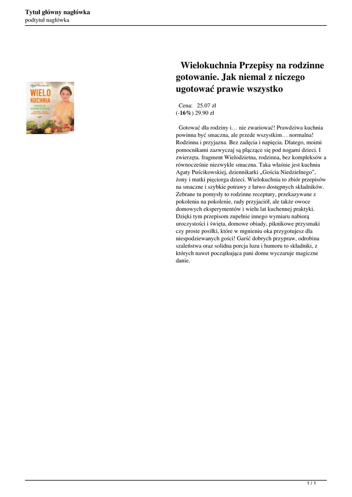 Tytuł główny nagłówka podtytuł nagłówka Wielokuchnia Przepisy na rodzinne gotowanie. Jak niemal z niczego ugotować prawie wszystko Cena: 25.07 zł (-16%) 29.90 zł Gotować dla rodziny i… nie zwariować! Prawdziwa kuchnia powinna być smaczna, ale przede wszystkim… normalna! Rodzinna i przyjazna. Bez zadęcia i napięcia. Dlatego, moimi pomocnikami zazwyczaj są plączące się pod nogami dzieci. I zwierzęta. fragment Wielodzietna, rodzinna, bez kompleksów a równocześnie niezwykle smaczna. Taka właśnie jest kuchnia Agaty Puścikowskiej, dziennikarki „Gościa Niedzielnego”, żony i matki pięciorga dzieci. Wielokuchnia to zbiór przepisów na smaczne i szybkie potrawy z łatwo dostępnych składników. Zebrane tu pomysły to rodzinne receptury, przekazywane z pokolenia na pokolenie, rady przyjaciół, ale także owoce domowych eksperymentów i wielu lat kuchennej praktyki. Dzięki tym przepisom zupełnie innego wymiaru nabiorą uroczystości i święta, domowe obiady, piknikowe przysmaki czy proste posiłki, które w mgnieniu oka przygotujesz dla niespodziewanych gości! Garść dobrych przypraw, odrobina szaleństwa oraz solidna porcja luzu i humoru to składniki, z których nawet początkująca pani domu wyczaruje magiczne danie. 1/1 Powered by TCPDF (www.tcpdf.org)