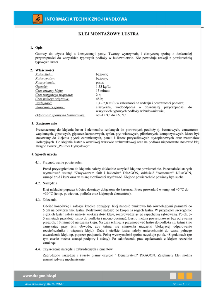 porządzona zgodnie z Rozporządzeniem REACH 1907/2006 z późniejszymi zmianami Sporządzona zgodnie z Rozporządzeniem (WE) nr 1907/2006 z późniejszymi zmianami KLEJ MONTAŻOWY LUSTRA 1. Opis Gotowy do użycia klej o konsystencji pasty. Tworzy wytrzymałą i elastyczną spoinę o doskonałej przyczepności do wszystkich typowych podłoży w budownictwie. Nie powoduje reakcji z powierzchnią typowych luster. 2. Właściwości Kolor kleju: Kolor spoiny: Konsystencja: Gęstość: Czas otwarty kleju: Czas wstępnego wiązania: Czas pełnego wiązania: Wydajność: Właściwości spoiny: Odporność spoiny na temperaturę: beżowy; beżowy; pasta; 1,33 kg/L; 15 minut; 2 h; 48 h; 1,4 - 2,8 m²/L w zależności od rodzaju i porowatości podłoża; elastyczna, wodoodporna o doskonałej przyczepności wszystkich typowych podłoży w budownictwie; od -15 ºC do +60 ºC. do 3. Zastosowanie Przeznaczony do klejenia luster i elementów szklanych do porowatych podłoży tj. betonowych, cementowowapiennych, gipsowych, gipsowo-kartonowych, tynku, płyt wiórowych, pilśniowych, kompozytowych. Może być stosowany do klejenia płytek ceramicznych, paneli i listew przysufitowych styropianowych oraz materiałów izolacyjnych. Do klejenia luster o wrażliwej warstwie srebrzankowej oraz na podłoża nieporowate stosować klej Dragon Power „Polimer Hybrydowy”. 4. Sposób użycia 4.1. Przygotowanie powierzchni Przed przystąpieniem do klejenia należy dokładnie oczyścić klejone powierzchnie. Pozostałości starych wymalowań usunąć "Zmywaczem farb i lakierów" DRAGON, odtłuścić "Acetonem" DRAGON, usunąć brud i kurz oraz w miarę możliwości wyrównać. Klejone powierzchnie powinny być suche. 4.2. Narzędzia Klej nakładać poprzez króciec dozujący dołączony do kartusza. Prace prowadzić w temp. od +5 ºC do +30 ºC (temp. powietrza, podłoża oraz klejonych elementów). 4.3. Zalecenia Odciąć końcówkę i założyć króciec dozujący. Klej nanosić punktowo lub równoległymi pasmami co 5 cm na powierzchnię lustra. Dodatkowo nałożyć po kropli na rogach lustra. W przypadku szczególnie ciężkich luster należy nanieść większą ilość kleju, rozprowadzając go szpachelką ząbkowaną. Po ok. 35 minutach przykleić lustro do podłoża i mocno docisnąć. Lustro można pozycjonować bez odrywania przez ok. 10 minut od nałożenia kleju. Na czas schnięcia przymocować lustro do podłoża np. taśmą (nie zamykając przy tym obwodu, aby taśma nie stanowiła uszczelki blokującej odparowanie rozcieńczalnika i wiązanie kleju). Duże i ciężkie lustra należy unieruchomić do czasu pełnego utwardzenia kleju np. poprzez podparcie. Pełną wytrzymałość spoina uzyskuje po ok. 48 godzinach (po tym czasie można usunąć podpory i taśmy). Po zakończeniu prac opakowanie z klejem szczelnie zamknąć. 4.4. Czyszczenie narzędzi i zabrudzonych elementów Zabrudzone narzędzia i świeże plamy czyścić " Denaturatem" DRAGON. Zaschnięty klej można usunąć jedynie mechanicznie. data aktualizacji: 04-11-2014 r. Strona 1 z 2 porządzona zgodnie z Rozporządzeniem REACH 1907/2006 z późniejszymi zmianami Sporządzona zgodnie z Rozporządzeniem (WE) nr 1907/2006 z późniejszymi zmianami 4.5. Rozcieńczanie kleju Nie zaleca się rozcieńczania kleju. 4.6. Ograniczenia i uwagi Nie gruntować powierzchni, do której będzie przyklejane lustro. W razie wątpliwości sprawdzić odporność lustra na działanie kleju. Nie stosować kleju do luster do przyklejania metalowych uchwytów lustra, można do tego celu użyć "Klej epoksydowy uniwersalny" DRAGON. 5. Gramatura Kod towaru DKLU050/BL/PL-BG-LT-RO-RU DKML300 Gramatura 50 ml 300 ml Typ opakowania tuba kartusz 6. Okres ważności 2 lata 7. Uwagi Warunki transportowania i magazynowania: Produkt transportować i przechowywać w szczelnie zamkniętym, oryginalnym opakowaniu w temperaturze od 0 °C do +30 °C. Chronić przed dziećmi. Pozostałe uwagi: Nie stosować do klejenia szkła lakierowanego, luster epoksydowych, PE, PP, PTFE i wszystkich typów luster do mokrych podłoży. Nie gruntować powierzchni, do której będzie przyklejane lustro. Przed zastosowaniem należy wykonać próbę na małej powierzchni lustra. Stosować z dala od ognia przy sprawnie działającej wentylacji. W trakcie prowadzenia prac oraz po ich zakończeniu pomieszczenie należy intensywnie wietrzyć aż do zaniku charakterystycznego zapachu. Mieszanina ta spełnia kryteria klasyfikacji jako niebezpieczna zgodnie z rozporządzeniem dyrektywy 1999/45/WE Parlamentu Europejskiego i Rady z dnia 31 maja 1999 r. w sprawie zbliżenia przepisów ustawowych, wykonawczych i administracyjnych Państw Członkowskich odnoszących się do klasyfikacji, pakowania i etykietowania preparatów Niebezpiecznych, w związku z czym jest dla niej sporządzona karta charakterystyki zgodnie z Rozporządzeniem (WE) Nr 1907/2006 Parlamentu Europejskiego i Rady z dnia 18 grudnia 2006 roku w sprawie rejestracji, oceny, udzielania zezwoleń i stosowanych ograniczeń w zakresie chemikaliów (REACH), utworzenia Europejskiej Agencji Chemikaliów, zmieniające dyrektywę 1999/45/WE oraz uchylające rozporządzenie Rady (EWG) nr 793/93 i rozporządzenie Komisji (WE) nr 1488/94, jak również dyrektywę Rady 76/769/EWG i dyrektywy Komisji 91/155/EWG, 93/67/EWG, 93/105/WE i 2000/21/WE z późniejszymi zmianami. data aktualizacji: 04-11-2014 r. Strona 2 z 2
