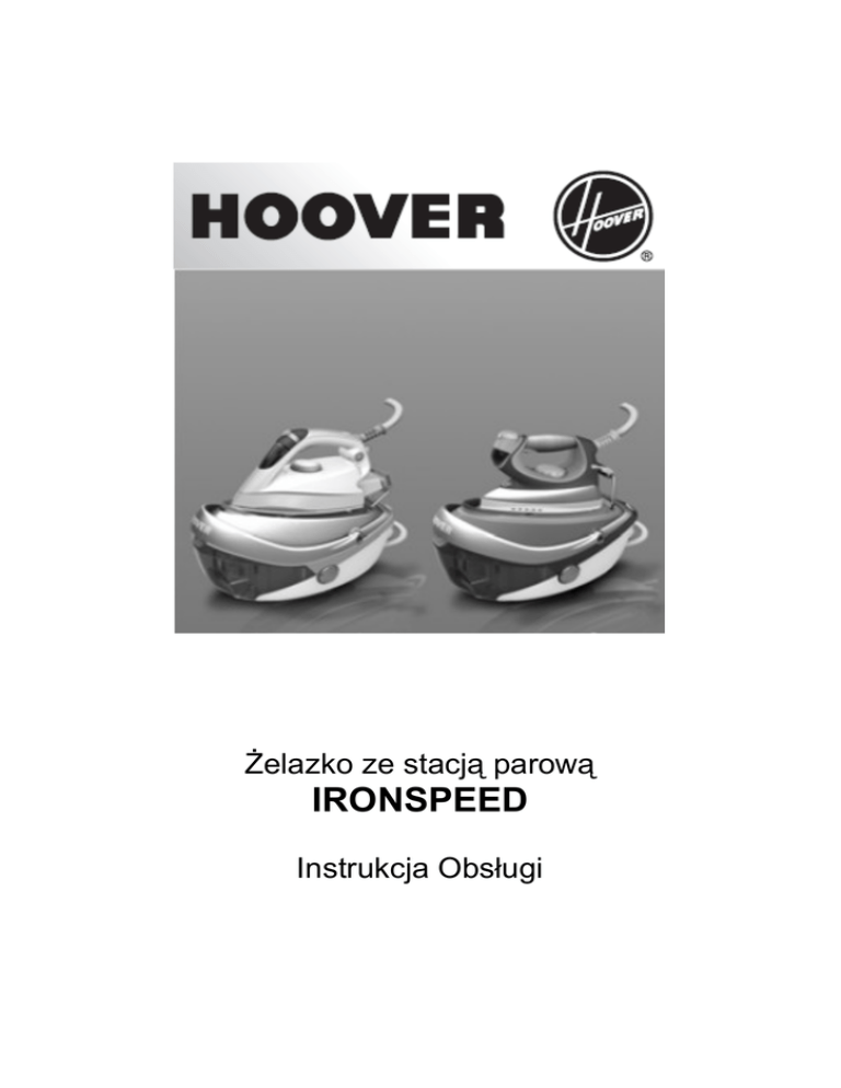 Żelazko ze stacją parową IRONSPEED Instrukcja Obsługi 1 2 3 4 5 6 Rys. 1 Opis stacji parowej 7 8 9 10 11 12 13 14 15 16 17 Panel sterowania Blokada żelazka Podkładka pod żelazko Uchwyt do przenoszenia Wyjmowany zbiornik na wodę Schowek na przewód zasilający i wąż dopływowy Przewód zasilający Wąż dopływowy Otwór wlewowy Przycisk zwalniający zbiornik na wodę Stopa żelazka Pokrętło regulacji temperatury Przycisk pary Przełącznik Multi-Steam Wskaźnik temperatury Podkładki do ustawienia żelazka w pozycji pionowej Nakładka na otwór do odkamieniania Rys. 2 Opis urządzenia 1A 1B 1C 1D 1E Rys. 3 Panel sterowania Przycisk On/Off ze wskaźnikiem zasilania Wskaźnik pustego zbiornika wody Wskaźnik automatycznego wyłączenia Wskaźnik gotowości do prasowania parowego Wskaźnik zakamienienia 1F 1G Przycisk On/Off stacji parowej ze wskaźnikiem zasilania Przycisk On/Off żelazka ze wskaźnikiem zasilania Rys. 4 Panel sterowania (model Professional) 18 19 20 21 Włosie Przycisk pary Wygodny uchwyt Baza i schowek na przewód 22 Przycisk zwalniający zbiornik na wodę Stopa żelazka Pokrętło regulacji temperatury Przycisk pary / blokada ciągłego wypływu pary (steam lock) Przełącznik Multi-Steam Wskaźnik temperatury Nakładka na otwór do odkamieniania Rys. 5 Szczotka parowa 23 24 25 26 27 28 Rys. 6 Opis urządzenia (model Professional) WSTĘP Szanowni Klienci! Gratulujemy zakupu systemu do prasowania Hoover i dziękujemy za okazane nam zaufanie. Zakupione przez Państwa urządzenie zostało wyprodukowane z zachowaniem najwyższych standardów jakości i wielokrotnie sprawdzone pod względem jakości przed wprowadzeniem do sprzedaży. Mamy nadzieję, że spełni ono Państwa oczekiwania. Jesteśmy przekonani, że od tej pory prasowanie będzie znacznie szybsze i łatwiejsze. Przed przystąpieniem do użytkowania prosimy dokładnie zapoznać się z instrukcją obsługi dołączoną do urządzenia. W celu uzyskania dalszych informacji oraz w przypadku pojawienia się problemów niewymienionych w niniejszej instrukcji prosimy o kontakt ze sprzedawcą lub serwisem pogwarancyjnym. WSKAZÓWKI DOTYCZĄCE BEZPIECZEŃSTWA Prosimy uważnie zapoznać się z niniejszą instrukcją obsługi i zachować ją do wglądu w przyszłości. Urządzenie jest przeznaczone wyłącznie do użytku domowego. Producent nie ponosi odpowiedzialności za ewentualne szkody powstałe wskutek wykorzystywania urządzania do jakichkolwiek celów komercyjnych, użytkowania w sposób niewłaściwy lub niezgodny z niniejszą instrukcją. W takim przypadku gwarancja traci ważności. Przed podłączeniem urządzenia do instalacji elektrycznej należy upewnić się, że wartość napięcia podana na tabliczce znamionowej urządzenia jest zgodna z napięciem w sieci elektrycznej oraz sprawdzić, czy gniazdko zasilania jest uziemione. Przed każdym użyciem należy upewnić się, czy przewód zasilający lub jakikolwiek inny ważny element urządzenia nie są uszkodzone. Dzieci oraz osoby z ograniczoną sprawnością psychiczną, sensoryczną lub umysłową mogą korzystać z urządzenia wyłącznie po wcześniejszym poinstruowaniu dotyczącym bezpiecznego użytkowania urządzenia przez osobę odpowiedzialną za ich bezpieczeństwo. Nie należy pozwalać dzieciom bawić się urządzeniem. Należy zawsze stawiać urządzenie na stabilnej, równej powierzchni. Przed odstawieniem urządzenia na podstawę należy upewnić się, że znajduje się ona na stabilnym podłożu. Nigdy nie należy kierować wylotu pary w stronę ludzi lub zwierząt. Nigdy nie należy kierować strumienia pary w stronę jakichkolwiek innych urządzeń elektrycznych lub elektronicznych. Nie należy korzystać z urządzenia, jeśli spadło lub nosi widoczne ślady uszkodzenia, awarii lub wycieku. W takim przypadku urządzenie powinno zostać sprawdzone w autoryzowanym punkcie serwisowym ze względów bezpieczeństwa. Przed wykonaniem jakichkolwiek czynności konserwacyjnych należy upewnić się, czy urządzenie jest wyłączone, odłączone od źródła zasilania oraz ostygło do bezpiecznej temperatury. Nigdy nie należy pozostawiać urządzenia bez nadzoru, gdy jest ono rozgrzane lub podłączone do sieci elektrycznej. Nie należy wyciągać wtyczki z gniazdka elektrycznego pociągając za przewód zasilający. Nigdy nie należy zanurzać urządzenia, stacji parowej, przewodów i wtyczek w wodzie ani płukać ich bezpośrednio pod strumieniem bieżącej wody. Podczas pracy stopa żelazka może rozgrzewać się do bardzo wysokich temperatur. Nigdy nie należy dotykać rozgrzanej stopy żelazka ze względu na ryzyko poparzeń. Nie należy dopuszczać do kontaktu przewodów zasilających z rozgrzaną stopą żelazka. Ze względów bezpieczeństwa wymianę uszkodzonego przewodu sieciowego należy zlecić wytwórcy, centrum serwisowemu lub osobie posiadającej odpowiednie kwalifikacje. 1.1 Panel sterowania Przycisk On/Off (1A): kontrolka na przycisku zapala się po włączeniu urządzenia (dotyczy modelu Domestic). Przycisk On/Off żelazka (1G): po naciśnięciu przycisku stopa żelazka nagrzewa się. Funkcja zalecana do prasowania bez pary (dotyczy modelu Professional). Przycisk On/Off stacji parowej (1F): po naciśnięciu przycisku stacja parowa zaczyna nagrzewać znajdującą się w niej wodę. Po włączeniu stacji parowej należy jednocześnie włączyć żelazko poprzez naciśnięcie przycisku On/Off znajdującego się na żelazku (dotyczy modelu Professional). Jeśli urządzenie jest włączone i wskaźnik gotowości do prasowania parowego (1D) przestał świecić, oznacza to, że urządzenie jest gotowe do prasowania parowego. Naciśnięcie przycisku pary spowoduje uwolnienie strumieni pary z otworów znajdujących się na stopie żelazka. W trakcie prasowania wskaźnik gotowości do prasowania parowego może włączać się co pewien czas. Nie ma to jednak wpływu na prasowanie i może być ono kontynuowane. „Wskaźnik pustego