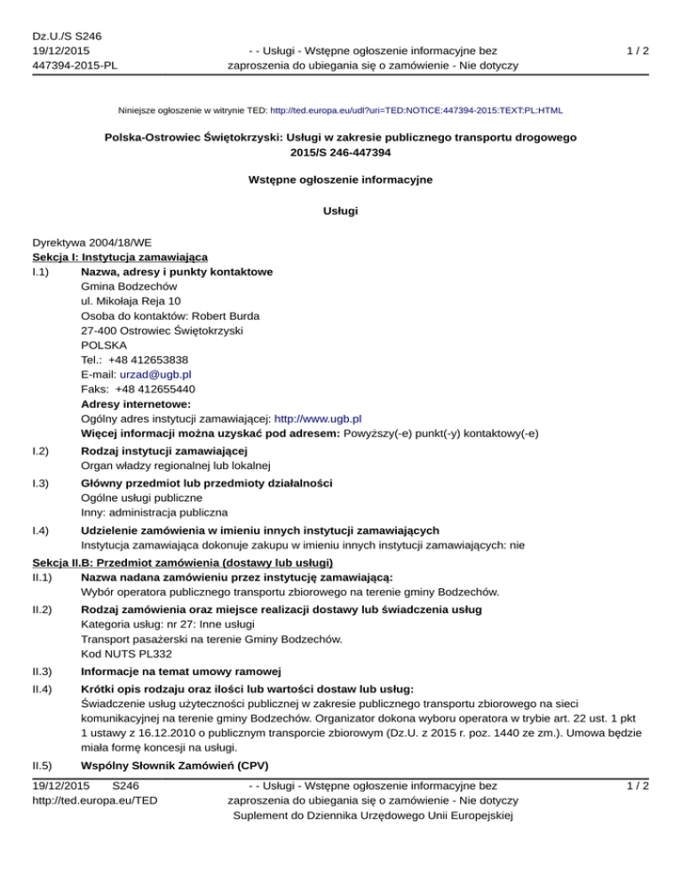 Dz.U./S S246 19/12/2015 447394-2015-PL - - Usługi - Wstępne ogłoszenie informacyjne bez zaproszenia do ubiegania się o zamówienie - Nie dotyczy 1/2 Niniejsze ogłoszenie w witrynie TED: http://ted.europa.eu/udl?uri=TED:NOTICE:447394-2015:TEXT:PL:HTML Polska-Ostrowiec Świętokrzyski: Usługi w zakresie publicznego transportu drogowego 2015/S 246-447394 Wstępne ogłoszenie informacyjne Usługi Dyrektywa 2004/18/WE Sekcja I: Instytucja zamawiająca I.1) Nazwa, adresy i punkty kontaktowe Gmina Bodzechów ul. Mikołaja Reja 10 Osoba do kontaktów: Robert Burda 27-400 Ostrowiec Świętokrzyski POLSKA Tel.: +48 412653838 E-mail: [email protected] Faks: +48 412655440 Adresy internetowe: Ogólny adres instytucji zamawiającej: http://www.ugb.pl Więcej informacji można uzyskać pod adresem: Powyższy(-e) punkt(-y) kontaktowy(-e) I.2) Rodzaj instytucji zamawiającej Organ władzy regionalnej lub lokalnej I.3) Główny przedmiot lub przedmioty działalności Ogólne usługi publiczne Inny: administracja publiczna I.4) Udzielenie zamówienia w imieniu innych instytucji zamawiających Instytucja zamawiająca dokonuje zakupu w imieniu innych instytucji zamawiających: nie Sekcja II.B: Przedmiot zamówienia (dostawy lub usługi) II.1) Nazwa nadana zamówieniu przez instytucję zamawiającą: Wybór operatora publicznego transportu zbiorowego na terenie gminy Bodzechów. II.2) Rodzaj zamówienia oraz miejsce realizacji dostawy lub świadczenia usług Kategoria usług: nr 27: Inne usługi Transport pasażerski na terenie Gminy Bodzechów. Kod NUTS PL332 II.3) Informacje na temat umowy ramowej II.4) Krótki opis rodzaju oraz ilości lub wartości dostaw lub usług: Świadczenie usług użyteczności publicznej w zakresie publicznego transportu zbiorowego na sieci komunikacyjnej na terenie gminy Bodzechów. Organizator dokona wyboru operatora w trybie art. 22 ust. 1 pkt 1 ustawy z 16.12.2010 o publicznym transporcie zbiorowym (Dz.U. z 2015 r. poz. 1440 ze zm.). Umowa będzie miała formę koncesji na usługi. II.5) Wspólny Słownik Zamówień (CPV) 19/12/2015 S246 http://ted.europa.eu/TED - - Usługi - Wstępne ogłoszenie informacyjne bez zaproszenia do ubiegania się o zamówienie - Nie dotyczy Suplement do Dziennika Urzędowego Unii Europejskiej 1/2 Dz.U./S S246 19/12/2015 447394-2015-PL - - Usługi - Wstępne ogłoszenie informacyjne bez zaproszenia do ubiegania się o zamówienie - Nie dotyczy 2/2 60112000 II.6) Planowana data rozpoczęcia procedury udzielania zamówienia 1.1.2017 II.7) Informacje na temat Porozumienia w sprawie zamówień rządowych (GPA) II.8) Informacje dodatkowe: Sekcja III: Informacje o charakterze prawnym, ekonomicznym, finansowym i technicznym III.1) Warunki dotyczące zamówienia III.1.1) Główne warunki finansowe i uzgodnienia płatnicze i/lub odniesienie do odpowiednich przepisów je regulujących: III.2) Warunki udziału III.2.1) Informacje o zamówieniach zastrzeżonych Sekcja VI: Informacje uzupełniające VI.1) Informacje o funduszach Unii Europejskiej VI.2) Informacje dodatkowe: VI.3) Informacje na temat ogólnych ram prawnych VI.4) Data wysłania niniejszego ogłoszenia: 17.12.2015 19/12/2015 S246 http://ted.europa.eu/TED - - Usługi - Wstępne ogłoszenie informacyjne bez zaproszenia do ubiegania się o zamówienie - Nie dotyczy Suplement do Dziennika Urzędowego Unii Europejskiej 2/2