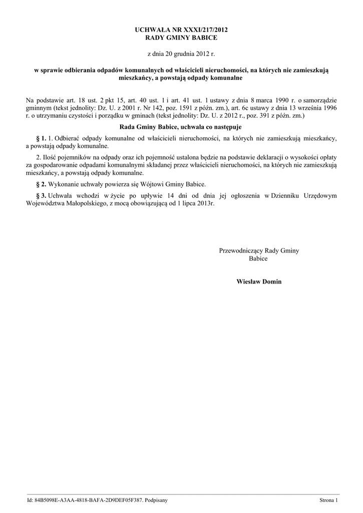 UCHWAŁA NR XXXI/217/2012 RADY GMINY BABICE z dnia 20 grudnia 2012 r. w sprawie odbierania odpadów komunalnych od właścicieli nieruchomości, na których nie zamieszkują mieszkańcy, a powstają odpady komunalne Na podstawie art. 18 ust. 2 pkt 15, art. 40 ust. 1 i art. 41 ust. 1 ustawy z dnia 8 marca 1990 r. o samorządzie gminnym (tekst jednolity: Dz. U. z 2001 r. Nr 142, poz. 1591 z późn. zm.), art. 6c ustawy z dnia 13 września 1996 r. o utrzymaniu czystości i porządku w gminach (tekst jednolity: Dz. U. z 2012 r., poz. 391 z późn. zm.) Rada Gminy Babice, uchwala co następuje § 1. 1. Odbierać odpady komunalne od właścicieli nieruchomości, na których nie zamieszkują mieszkańcy, a powstają odpady komunalne. 2. Ilość pojemników na odpady oraz ich pojemność ustalona będzie na podstawie deklaracji o wysokości opłaty za gospodarowanie odpadami komunalnymi składanej przez właścicieli nieruchomości, na których nie zamieszkują mieszkańcy, a powstają odpady komunalne. § 2. Wykonanie uchwały powierza się Wójtowi Gminy Babice. § 3. Uchwała wchodzi w życie po upływie 14 dni od dnia jej ogłoszenia w Dzienniku Urzędowym Województwa Małopolskiego, z mocą obowiązującą od 1 lipca 2013r. Przewodniczący Rady Gminy Babice Wiesław Domin ————————————————————————————————————————————————————————— Id: 84B5098E-A3AA-4818-BAFA-2D9DEF05F387. Podpisany Strona 1 Uzasadnienie Art.6c. ust.2 ustawy z dnia 13 września 1996r. o utrzymaniu czystości i porządku w gminach (tekst jednolity: Dz. U. z 2012 poz. 391) - „Rada gminy może, w drodze uchwały stanowiącej akt prawa miejscowego, postanowić o odbieraniu odpadów komunalnych od właścicieli nieruchomości, na których nie zamieszkują mieszkańcy, a powstają odpady komunalne”. Art. 40 ust. 1 ustawy z dnia 8 marca 1990r. o samorządzie gminnym tekst jednolity: (Dz. U z 2001r. Nr 142, poz. 1591 z późn. zm.) „ Na podstawie upoważnień ustawowych gminie przysługuje prawo stanowienia aktów prawa miejscowego obowiązujących na obszarze gminy”. Stosownie do art. 6c ust.2 ustawy z dnia 13 września 1996r. o utrzymaniu czystości i porządku w gminach Rada Gminy może w drodze uchwały stanowiącej akt prawa miejscowego, postanowić o odbieraniu odpadów komunalnych od właścicieli nieruchomości, na których nie zamieszkują mieszkańcy, a powstają odpady komunalne. Konsekwencją przejęcia prze gminę tego zadania, jest powstanie po stronie właścicieli nieruchomości, na których nie zamieszkują mieszkańcy, obowiązku uiszczania opłat za gospodarowanie odpadami komunalnymi. Taki obowiązek powstaje za każdy miesiąc, w którym na danej nieruchomości powstały odpady komunalne. W przypadku przedmiotowych nieruchomości opłata za gospodarowanie odpadami komunalnymi stanowi iloczyn liczby pojemników z tymi odpadami, powstałymi na danej nieruchomości oraz stawki opłaty ustalonej przez Radę Gminy. Opłata ta stanowi dochód gminy. Z pobranych opłat gmina pokrywa koszty funkcjonowania systemu gospodarowania odpadami komunalnymi, które obejmują koszty odbierania, transportu, odzysku i unieszkodliwiania, tworzenia i utrzymania punktu selektywnej zbiórki odpadów oraz obsługi administracyjnej tego systemu. ————————————————————————————————————————————————————————— Id: 84B5098E-A3AA-4818-BAFA-2D9DEF05F387. Podpisany Strona 1