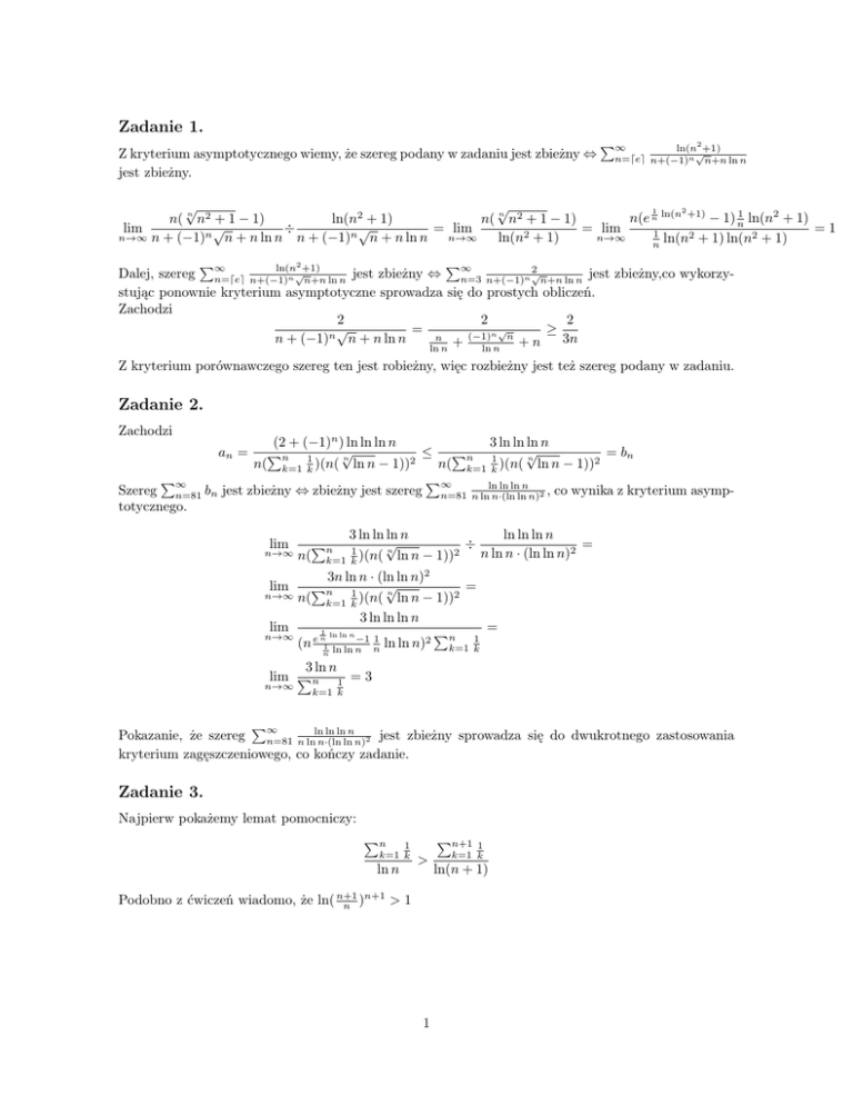 Zadanie 1. Z kryterium asymptotycznego wiemy, że szereg podany w zadaniu jest zbieżny ⇔ jest zbieżny. ln(n2 +1) √ n=dee n+(−1)n n+n ln n P∞ √ √ 2 1 n(e n ln(n +1) − 1) n1 ln(n2 + 1) n( n n2 + 1 − 1) ln(n2 + 1) n( n n2 + 1 − 1) √ √ lim = lim ÷ = lim =1 1 2 2 n→∞ n + (−1)n n + n ln n n + (−1)n n + n ln n n→∞ n→∞ ln(n2 + 1) n ln(n + 1) ln(n + 1) P∞ P∞ ln(n2 +1) 2 √ √ Dalej, szereg n=dee n+(−1) n n+n ln n jest zbieżny ⇔ n=3 n+(−1)n n+n ln n jest zbieżny,co wykorzystując ponownie kryterium asymptotyczne sprowadza się do prostych obliczeń. Zachodzi 2 2 2 √ √ = ≥ (−1)n n n 3n n + (−1)n n + n ln n + +n ln n ln n Z kryterium porównawczego szereg ten jest robieżny, więc rozbieżny jest też szereg podany w zadaniu. Zadanie 2. Zachodzi (2 + (−1)n ) ln ln ln n 3 ln ln ln n √ √ ≤ Pn 1 = bn Pn 1 n( k=1 k )(n( n ln n − 1))2 n( k=1 k )(n( n ln n − 1))2 P∞ P∞ ln ln n Szereg n=81 bn jest zbieżny ⇔ zbieżny jest szereg n=81 n lnlnn·(ln ln n)2 , co wynika z kryterium asymptotycznego. an = lim n→∞ ln ln ln n 3 ln ln ln n √ ÷ = Pn 1 n 2 n ln n · (ln ln n)2 n( k=1 k )(n( ln n − 1)) 3n ln n · (ln ln n)2 √ = Pn 1 n 2 n→∞ n( k=1 k )(n( ln n − 1)) 3 ln ln ln n lim = 1 ln ln n Pn n→∞ n (n e 1 ln ln n−1 n1 ln ln n)2 k=1 k1 lim n 3 ln n lim Pn 1 = 3 n→∞ k=1 k P∞ ln ln ln n Pokazanie, że szereg n=81 n ln n·(ln ln n)2 jest zbieżny sprowadza się do dwukrotnego zastosowania kryterium zagęszczeniowego, co kończy zadanie. Zadanie 3. Najpierw pokażemy lemat pomocniczy: Pn+1 Pn 1 k=1 k ln n > n+1 >1 Podobno z ćwiczeń wiadomo, że ln( n+1 n ) 1 1 k=1 k ln(n + 1) n n+1 X 1 (n + 1) ln( )( ) > ln n n k k=1 n X ln n 1 (ln(n + 1) − ln n) > k n+1 k=1 n n X X 1 ln n 1 ln(n + 1) > + ln n · k n+1 k k=1 k=1 Pn 1 Pn+1 1 k=1 k k=1 k > ln n ln(n + 1) Dalej będziemy korzystam z kryterium Dirichleta. P∞ Zapiszmy szereg z zadania jako n=81 an · bn , gdzie an = ln ln1ln n , a bn = Ciąg an jest monotoniczny i zbiega do 0, co można uznać za oczywiste. n P (−1)b 48 c n k=1 ln n 1 k P∞ Pozostało pokazać, że ciąg sum częściowych szeregu n=81 bn jest ograniczony. Wystarczy, P∞że pokażemy, że ciąg sum częsciowych składający się z pogrupowanych znakami wyrazów szeregu n=96 bn jest ograniczony, ponieważ z monotoniczności między kolejnymi pogrupowanymi wyrazami, ograniczenie przenosi się z podciągu na cały ciąg sum częściowych. Ponieważ początkowe wyrazy nie mają wpływu na ograniczenie, możemy badać szereg od n = 96. Można zauważyć, że ciąg sum częściowych jest ograniczony przez b1 , co uda się udowodnić chociażby indukcyjnie (po rozpatrzeniu kilku przypadków bazowych widać jak udowodnić krok indukcji) pozostawiam tę część rozwiązania jako nietrudne zadanie dla czytelnika. Zadanie 4. Pokażemy, że szereg jest rozbieżny przez wykazanie, P∞że ciąg sum częsciowych Sn3 jest robieżny. Niech Rn = Sn3 , szereg utworzony z ciągu sum Rn , to n=1 an , gdzie 1 1 1 + + ... + an = (−1)n 2 2 2 (n3 ) 3 (n3 + 1) 3 ((n + 1)3 − 1) 3 2 Szacujemy każdy składnik sumy |an | przez najmniejszy wyraz, stąd |an | ≥ 3n +3n+1 2 ≥ 1, z czego ((n+1)3 −1) 3 P∞ wynika, że an 6→ 0, więc szereg n=1 an jest rozbieżny, ponieważ nie spełnia warunku koniecznego zbieżności. W skutek czego ciąg Sn3 również jest rozbieżny, co daje nam wreszcie rozbieżność szeregu podanego w zadaniu. 2
